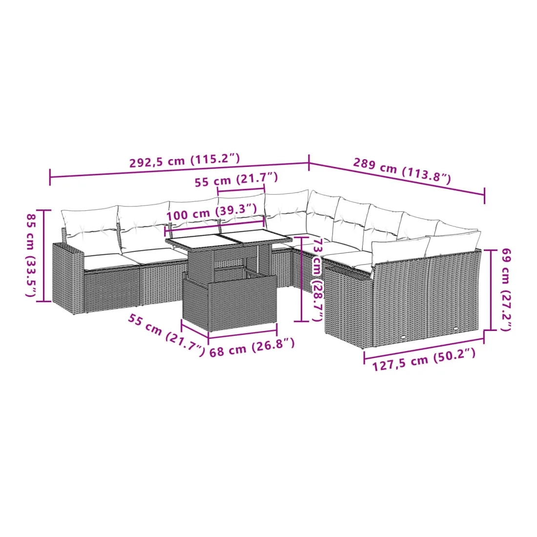Cet ensemble de canapés de jardin est le complément parfait de votre arrière-cour, terrasse ou patio, offrant un espace confortable et accueillant pour discuter avec la famille et les amis ou simplement se détendre et profiter de l'extérieur. Matériau durable : la résine tressée, également connue sous le nom de poly rotin, est un matériau synthétique solide et nécessitant peu d'entretien qui ressemble au rotin naturel. Il est léger, facile à nettoyer et couramment utilisé pour les meubles d'extérieur en raison de sa durabilité et de ses propriétés de résistance aux intempéries.Dessus de table réglable : le dessus de table peut être soulevé pour rendre la table plus haute, ce qui transforme la table d'extérieur d'une table basse à une table de salle à manger. Elle est parfaite pour recevoir des invités ou prendre des repas à l'extérieur.Expérience d'assise confortable : ce mobilier d'extérieur, doté de coussins épais, offre une expérience d'assise confortable.Housse amovible et lavable : ces coussins de siège sont dotés de housses amovibles pour un lavage et un entretien faciles.Conception modulaire : cet ensemble de meubles d'extérieur a une conception modulaire, ce qui le rend complètement flexible et facile à déplacer, afin que vous puissiez créer un agencement de meubles d'extérieur personnalisé. Bon à savoir :Pour que vos meubles d'extérieur restent beaux, nous vous recommandons de les protéger avec une housse imperméable.