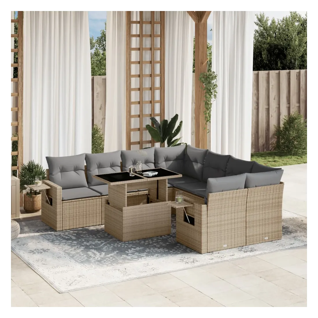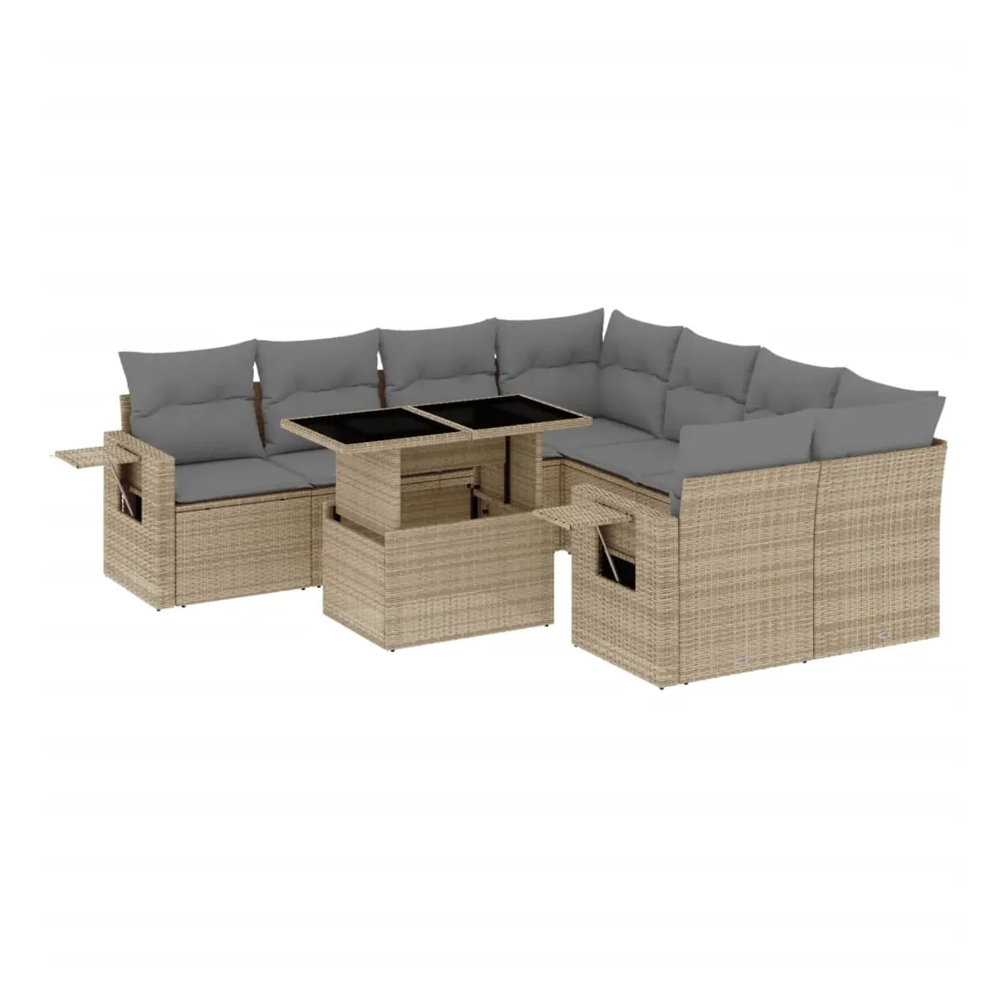 Cet ensemble de canapés de jardin est le complément parfait de votre arrière-cour, terrasse ou patio, offrant un espace confortable et accueillant pour discuter avec la famille et les amis ou simplement se détendre et profiter de l'extérieur. Matériau durable : la résine tressée, également connue sous le nom de poly rotin, est un matériau synthétique solide et nécessitant peu d'entretien qui ressemble au rotin naturel. Il est léger, facile à nettoyer et couramment utilisé pour les meubles d'extérieur en raison de sa durabilité et de ses propriétés de résistance aux intempéries.Dessus de table réglable : le dessus de table peut être soulevé pour rendre la table plus haute, ce qui transforme la table d'extérieur d'une table basse à une table de salle à manger. Elle est parfaite pour recevoir des invités ou prendre des repas à l'extérieur.Table d'appoint pratique : ce mobilier d'extérieur comprend des tables d'appoint pliables avec un ressort à gaz sur les accoudoirs, offrant des endroits pratiques pour garder vos essentiels à portée de main. Expérience d'assise confortable : ce mobilier d'extérieur, doté de coussins épais, offre une expérience d'assise confortable.Conception modulaire : cet ensemble de meubles d'extérieur a une conception modulaire, ce qui le rend complètement flexible et facile à déplacer, afin que vous puissiez créer un agencement de meubles d'extérieur personnalisé. Bon à savoir :Pour que vos meubles d'extérieur restent beaux, nous vous recommandons de les protéger avec une housse imperméable.