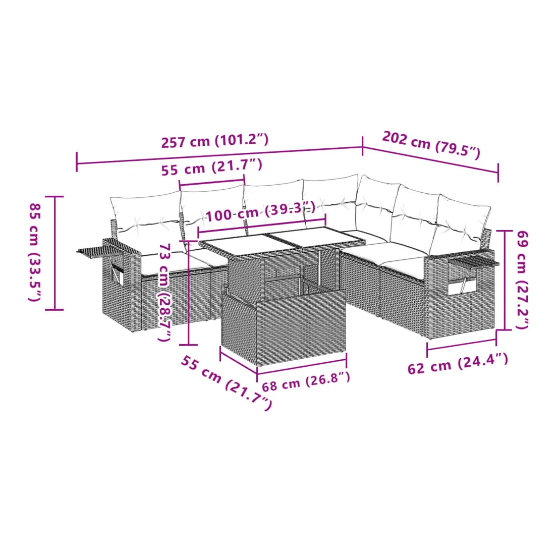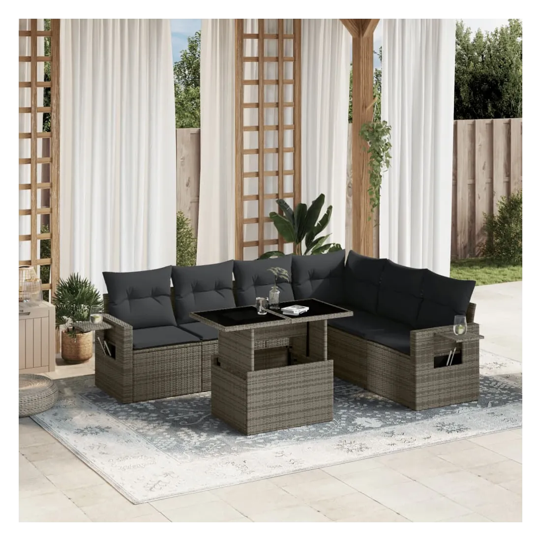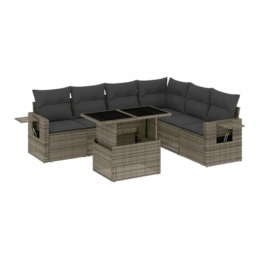 Cet ensemble de canapés de jardin est le complément parfait de votre arrière-cour, terrasse ou patio, offrant un espace confortable et accueillant pour discuter avec la famille et les amis ou simplement se détendre et profiter de l'extérieur. Matériau durable : la résine tressée, également connue sous le nom de poly rotin, est un matériau synthétique solide et nécessitant peu d'entretien qui ressemble au rotin naturel. Il est léger, facile à nettoyer et couramment utilisé pour les meubles d'extérieur en raison de sa durabilité et de ses propriétés de résistance aux intempéries.Dessus de table réglable : le dessus de table peut être soulevé pour rendre la table plus haute, ce qui transforme la table d'extérieur d'une table basse à une table de salle à manger. Elle est parfaite pour recevoir des invités ou prendre des repas à l'extérieur.Table d'appoint pratique : ce mobilier d'extérieur comprend des tables d'appoint pliables avec un ressort à gaz sur les accoudoirs, offrant des endroits pratiques pour garder vos essentiels à portée de main. Expérience d'assise confortable : ce mobilier d'extérieur, doté de coussins épais, offre une expérience d'assise confortable.Conception modulaire : cet ensemble de meubles d'extérieur a une conception modulaire, ce qui le rend complètement flexible et facile à déplacer, afin que vous puissiez créer un agencement de meubles d'extérieur personnalisé. Bon à savoir :Pour que vos meubles d'extérieur restent beaux, nous vous recommandons de les protéger avec une housse imperméable.
