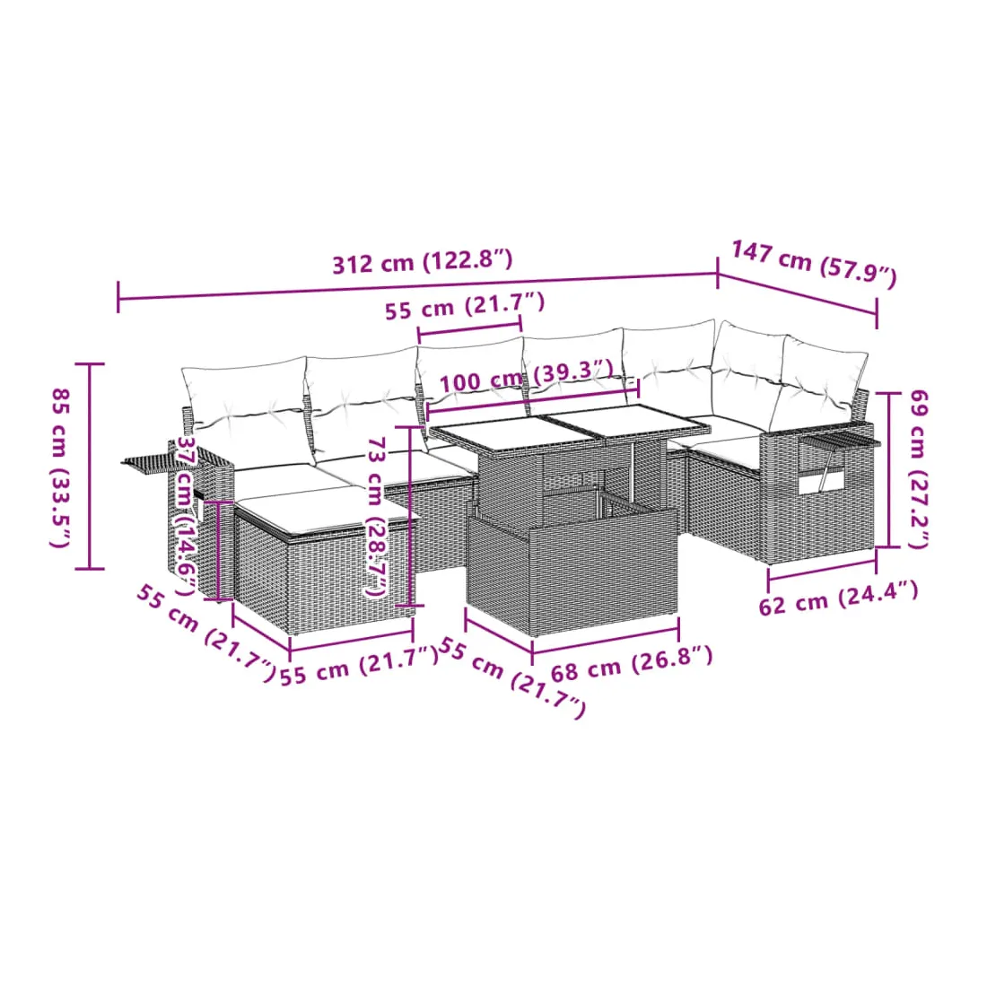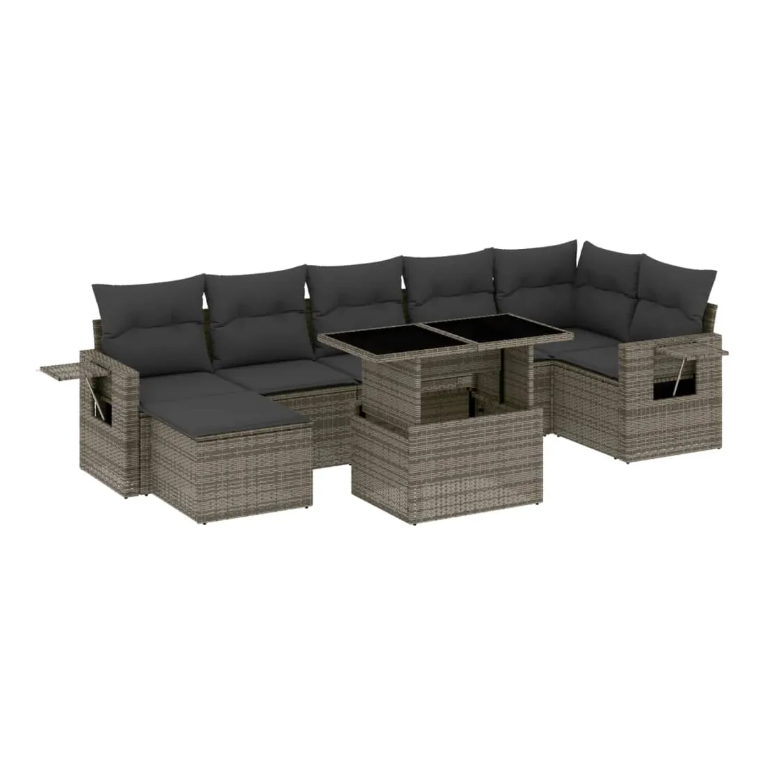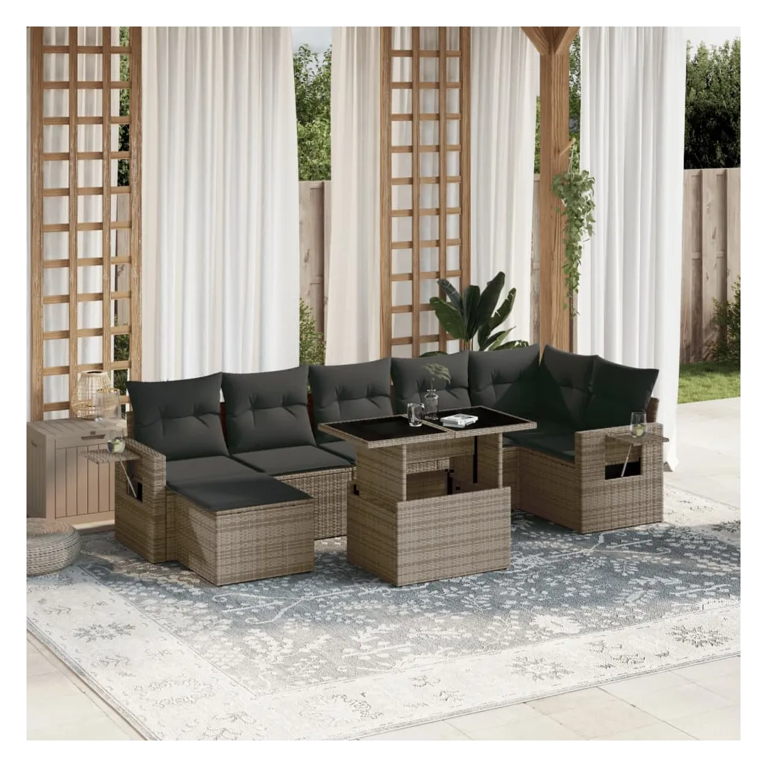 Cet ensemble de canapés de jardin est le complément parfait de votre arrière-cour, terrasse ou patio, offrant un espace confortable et accueillant pour discuter avec la famille et les amis ou simplement se détendre et profiter de l'extérieur. Matériau durable : la résine tressée, également connue sous le nom de poly rotin, est un matériau synthétique solide et nécessitant peu d'entretien qui ressemble au rotin naturel. Il est léger, facile à nettoyer et couramment utilisé pour les meubles d'extérieur en raison de sa durabilité et de ses propriétés de résistance aux intempéries.Dessus de table réglable : le dessus de table peut être soulevé pour rendre la table plus haute, ce qui transforme la table d'extérieur d'une table basse à une table de salle à manger. Elle est parfaite pour recevoir des invités ou prendre des repas à l'extérieur.Table d'appoint pratique : ce mobilier d'extérieur comprend des tables d'appoint pliables avec un ressort à gaz sur les accoudoirs, offrant des endroits pratiques pour garder vos essentiels à portée de main. Expérience d'assise confortable : ce mobilier d'extérieur, doté de coussins épais, offre une expérience d'assise confortable.Conception modulaire : cet ensemble de meubles d'extérieur a une conception modulaire, ce qui le rend complètement flexible et facile à déplacer, afin que vous puissiez créer un agencement de meubles d'extérieur personnalisé. Bon à savoir :Pour que vos meubles d'extérieur restent beaux, nous vous recommandons de les protéger avec une housse imperméable.