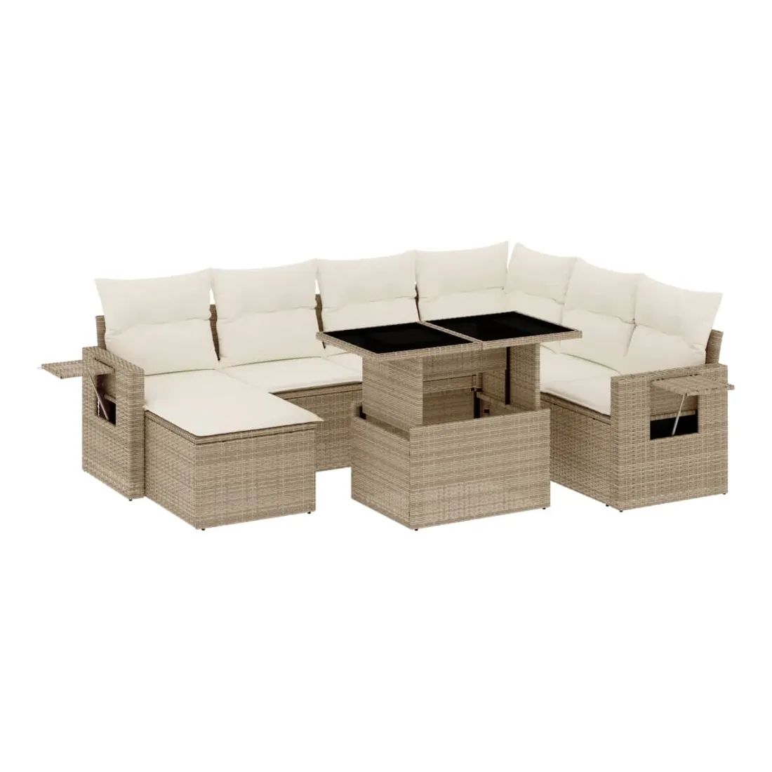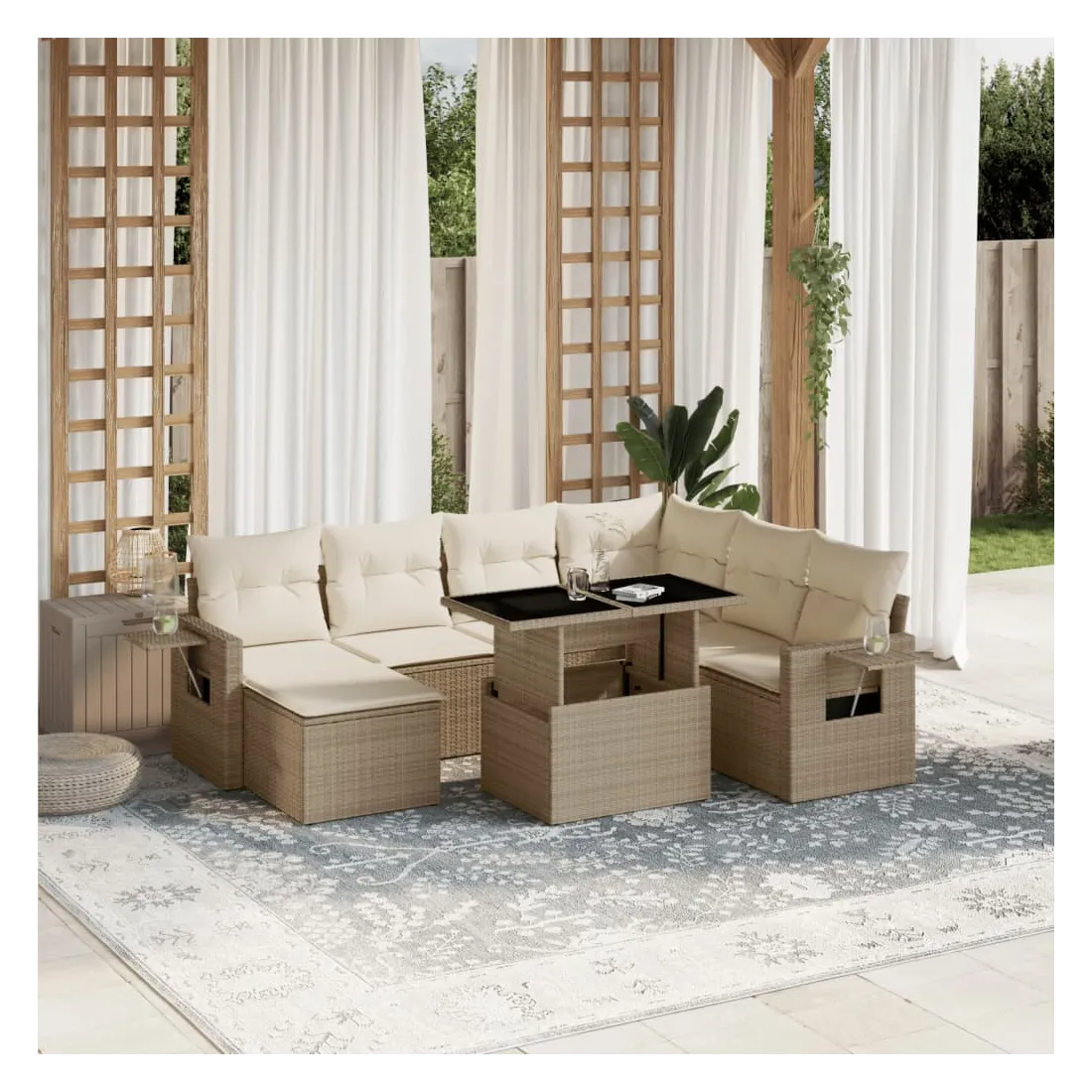 Cet ensemble de canapés de jardin est le complément parfait de votre arrière-cour, terrasse ou patio, offrant un espace confortable et accueillant pour discuter avec la famille et les amis ou simplement se détendre et profiter de l'extérieur. Matériau durable : la résine tressée, également connue sous le nom de poly rotin, est un matériau synthétique solide et nécessitant peu d'entretien qui ressemble au rotin naturel. Il est léger, facile à nettoyer et couramment utilisé pour les meubles d'extérieur en raison de sa durabilité et de ses propriétés de résistance aux intempéries.Dessus de table réglable : le dessus de table peut être soulevé pour rendre la table plus haute, ce qui transforme la table d'extérieur d'une table basse à une table de salle à manger. Elle est parfaite pour recevoir des invités ou prendre des repas à l'extérieur.Table d'appoint pratique : ce mobilier d'extérieur comprend des tables d'appoint pliables avec un ressort à gaz sur les accoudoirs, offrant des endroits pratiques pour garder vos essentiels à portée de main. Expérience d'assise confortable : ce mobilier d'extérieur, doté de coussins épais, offre une expérience d'assise confortable.Conception modulaire : cet ensemble de meubles d'extérieur a une conception modulaire, ce qui le rend complètement flexible et facile à déplacer, afin que vous puissiez créer un agencement de meubles d'extérieur personnalisé. Bon à savoir :Pour que vos meubles d'extérieur restent beaux, nous vous recommandons de les protéger avec une housse imperméable.