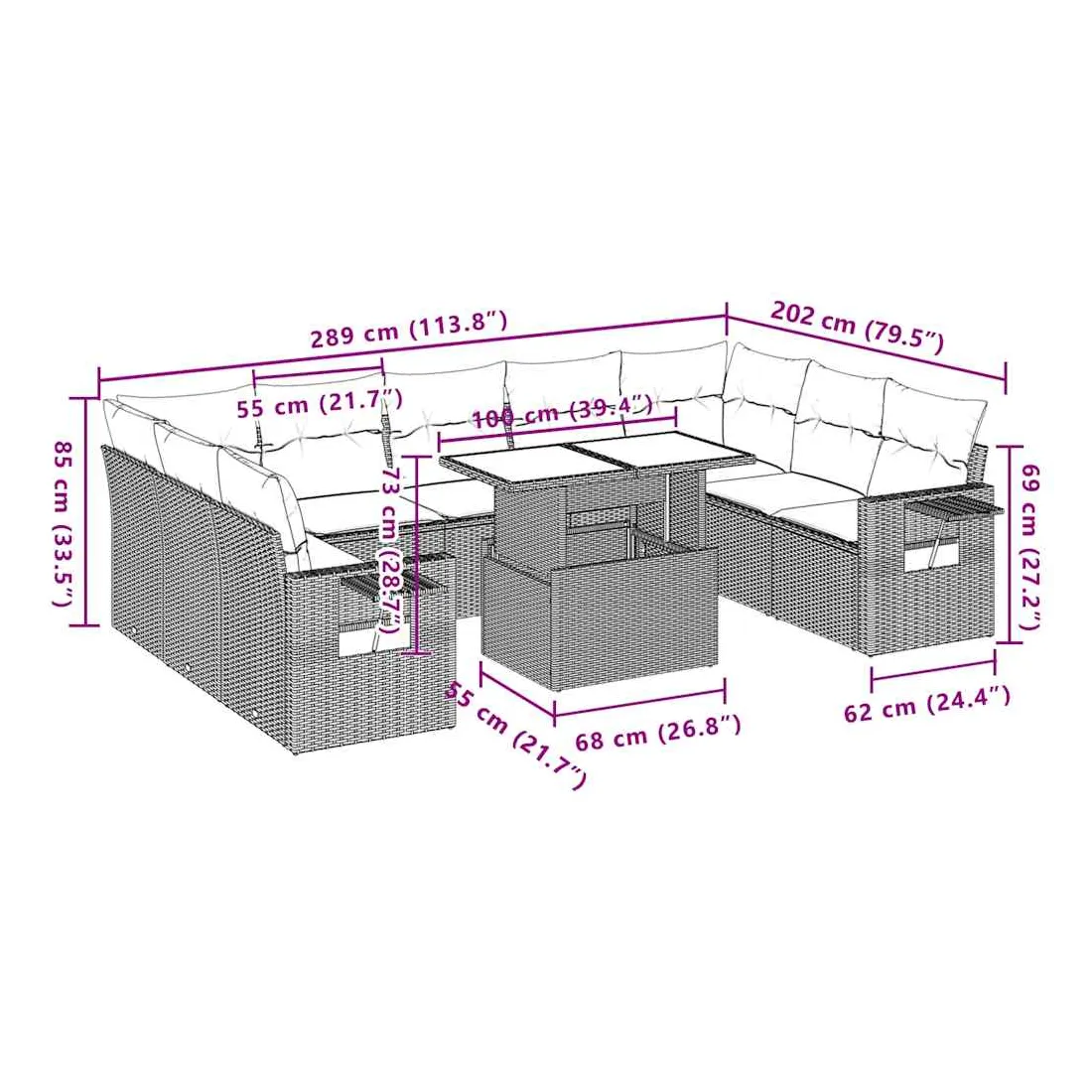 Cet ensemble de canapés de jardin est le complément parfait de votre arrière-cour, terrasse ou patio, offrant un espace confortable et accueillant pour discuter avec la famille et les amis ou simplement se détendre et profiter de l'extérieur. Matériau durable : la résine tressée, également connue sous le nom de poly rotin, est un matériau synthétique solide et nécessitant peu d'entretien qui ressemble au rotin naturel. Il est léger, facile à nettoyer et couramment utilisé pour les meubles d'extérieur en raison de sa durabilité et de ses propriétés de résistance aux intempéries.Dessus de table réglable : le dessus de table peut être soulevé pour rendre la table plus haute, ce qui transforme la table d'extérieur d'une table basse à une table de salle à manger. Elle est parfaite pour recevoir des invités ou prendre des repas à l'extérieur.Table d'appoint pratique : ce mobilier d'extérieur comprend des tables d'appoint pliables avec un ressort à gaz sur les accoudoirs, offrant des endroits pratiques pour garder vos essentiels à portée de main. Expérience d'assise confortable : ce mobilier d'extérieur, doté de coussins épais, offre une expérience d'assise confortable.Conception modulaire : cet ensemble de meubles d'extérieur a une conception modulaire, ce qui le rend complètement flexible et facile à déplacer, afin que vous puissiez créer un agencement de meubles d'extérieur personnalisé. Bon à savoir :Pour que vos meubles d'extérieur restent beaux, nous vous recommandons de les protéger avec une housse imperméable.