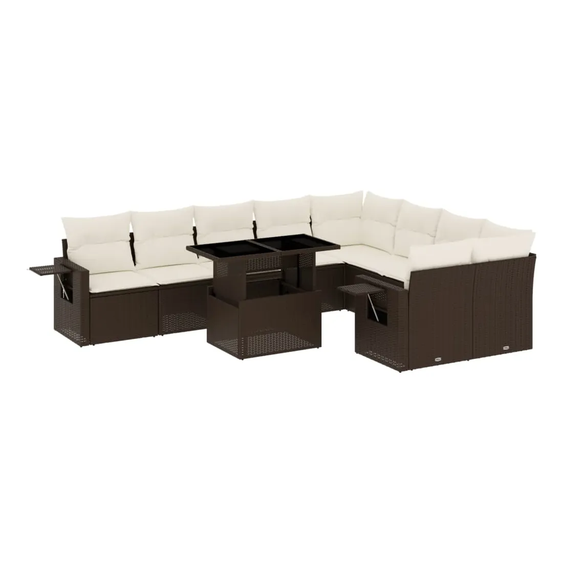Cet ensemble de canapés de jardin est le complément parfait de votre arrière-cour, terrasse ou patio, offrant un espace confortable et accueillant pour discuter avec la famille et les amis ou simplement se détendre et profiter de l'extérieur. Matériau durable : la résine tressée, également connue sous le nom de poly rotin, est un matériau synthétique solide et nécessitant peu d'entretien qui ressemble au rotin naturel. Il est léger, facile à nettoyer et couramment utilisé pour les meubles d'extérieur en raison de sa durabilité et de ses propriétés de résistance aux intempéries.Dessus de table réglable : le dessus de table peut être soulevé pour rendre la table plus haute, ce qui transforme la table d'extérieur d'une table basse à une table de salle à manger. Elle est parfaite pour recevoir des invités ou prendre des repas à l'extérieur.Table d'appoint pratique : ce mobilier d'extérieur comprend des tables d'appoint pliables avec un ressort à gaz sur les accoudoirs, offrant des endroits pratiques pour garder vos essentiels à portée de main. Expérience d'assise confortable : ce mobilier d'extérieur, doté de coussins épais, offre une expérience d'assise confortable.Conception modulaire : cet ensemble de meubles d'extérieur a une conception modulaire, ce qui le rend complètement flexible et facile à déplacer, afin que vous puissiez créer un agencement de meubles d'extérieur personnalisé. Bon à savoir :Pour que vos meubles d'extérieur restent beaux, nous vous recommandons de les protéger avec une housse imperméable.