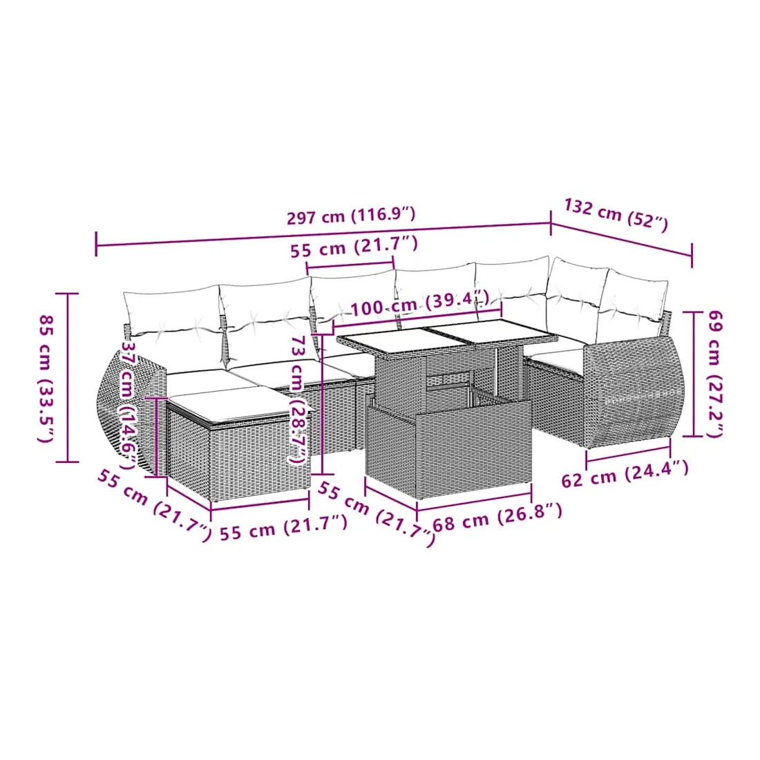 - Dimensions du coussin de siège : 55 x 55 x 3 cm (l x P x é)