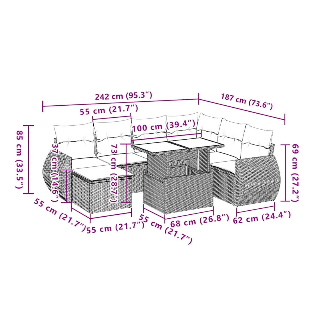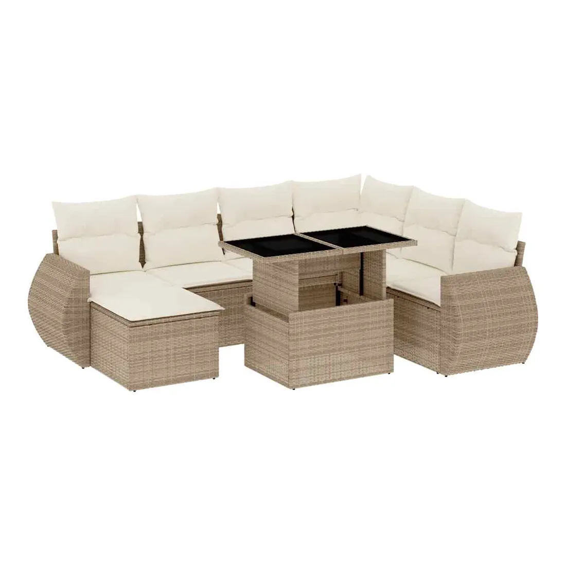 Cet ensemble de canapés de jardin est le complément parfait de votre arrière-cour, terrasse ou patio, offrant un espace confortable et accueillant pour discuter avec la famille et les amis ou simplement se détendre et profiter de l'extérieur. Matériau durable : la résine tressée, également connue sous le nom de poly rotin, est un matériau synthétique solide et nécessitant peu d'entretien qui ressemble au rotin naturel. Il est léger, facile à nettoyer et couramment utilisé pour les meubles d'extérieur en raison de sa durabilité et de ses propriétés de résistance aux intempéries.Dessus de table réglable : le dessus de table peut être soulevé pour rendre la table plus haute, ce qui transforme la table d'extérieur d'une table basse à une table de salle à manger. Elle est parfaite pour recevoir des invités ou prendre des repas à l'extérieur.Expérience d'assise confortable : ce mobilier d'extérieur, doté de coussins épais, offre une expérience d'assise confortable.Housse amovible et lavable : ces coussins de siège sont dotés de housses amovibles pour un lavage et un entretien faciles.Conception modulaire : cet ensemble de meubles d'extérieur a une conception modulaire, ce qui le rend complètement flexible et facile à déplacer, afin que vous puissiez créer un agencement de meubles d'extérieur personnalisé. Bon à savoir :Pour que vos meubles d'extérieur restent beaux, nous vous recommandons de les protéger avec une housse imperméable.