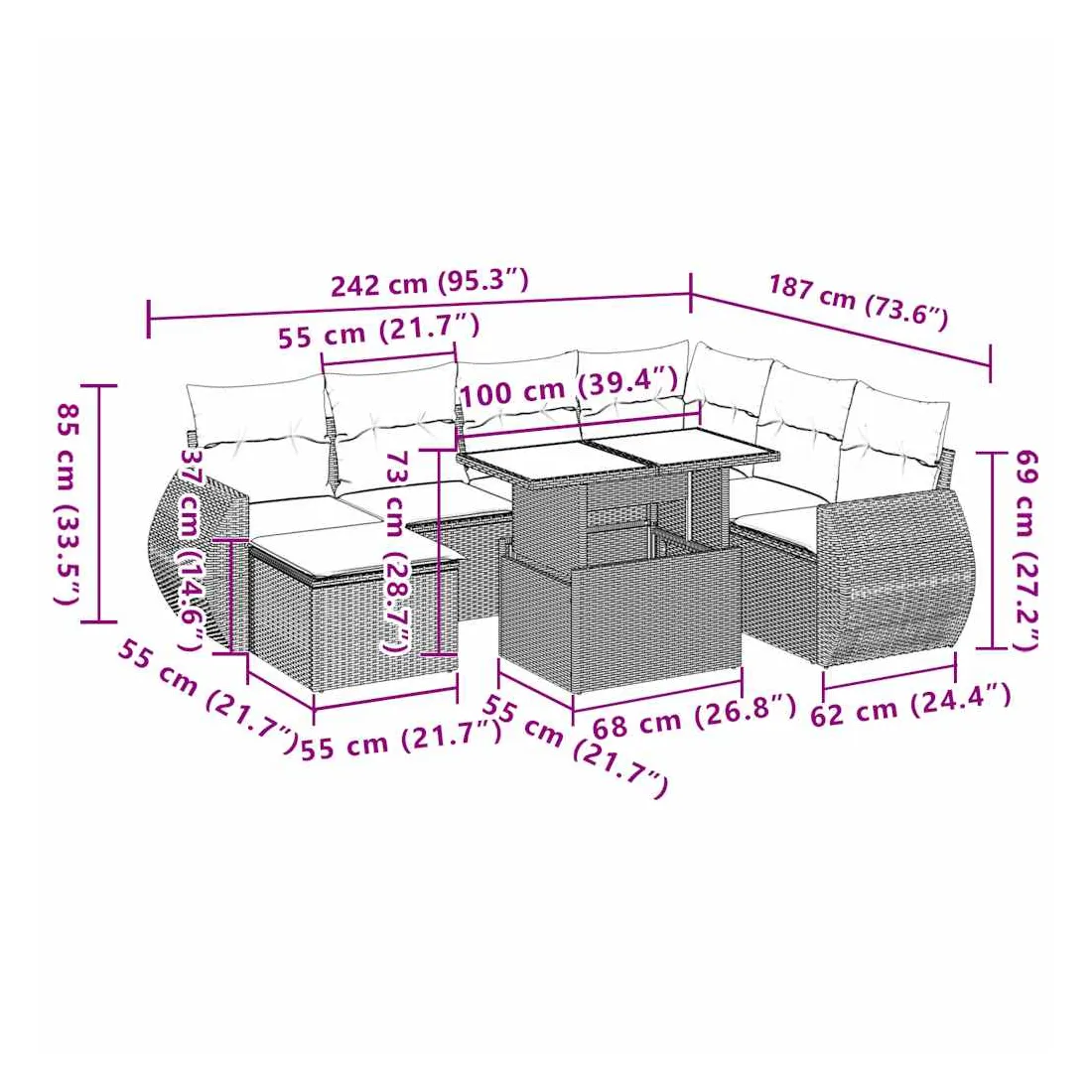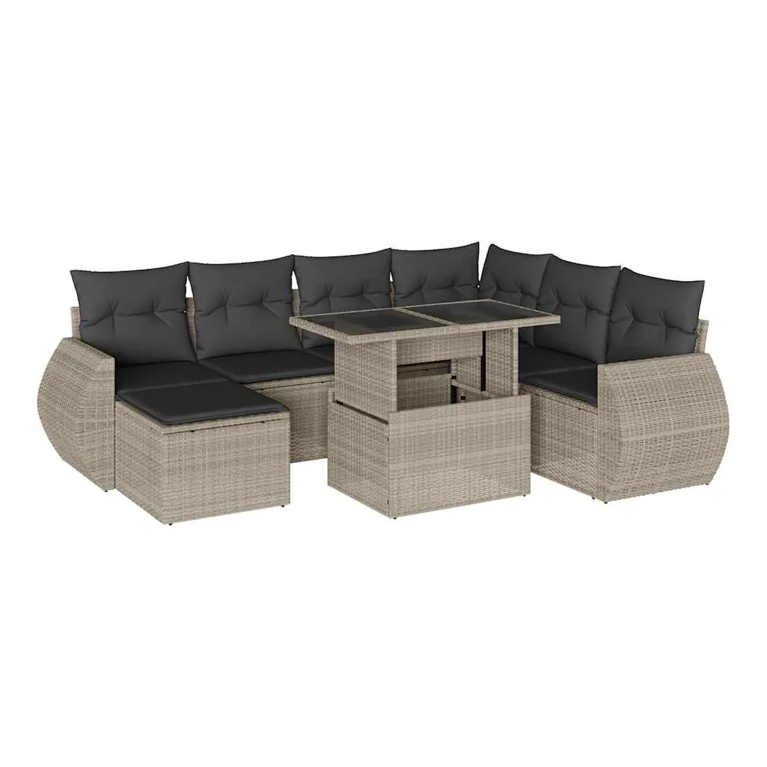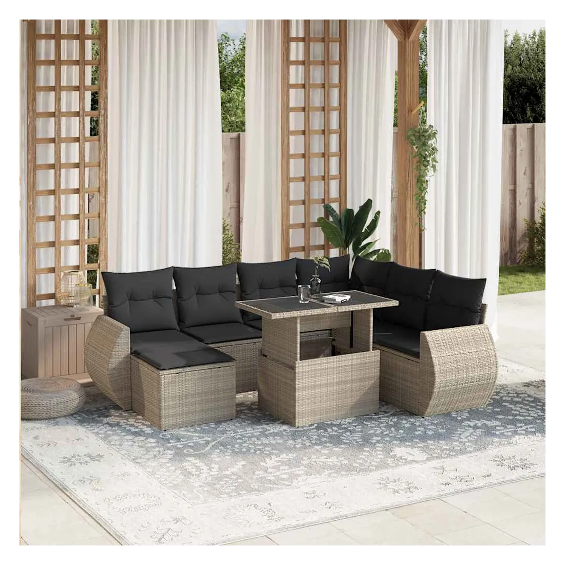 Cet ensemble de canapés de jardin est le complément parfait de votre arrière-cour, terrasse ou patio, offrant un espace confortable et accueillant pour discuter avec la famille et les amis ou simplement se détendre et profiter de l'extérieur. Matériau durable : la résine tressée, également connue sous le nom de poly rotin, est un matériau synthétique solide et nécessitant peu d'entretien qui ressemble au rotin naturel. Elle est légère, facile à nettoyer et couramment utilisée pour les meubles d'extérieur en raison de sa durabilité et de ses propriétés de résistance aux intempéries.Dessus de table réglable : le dessus de table peut être soulevé pour rendre la table plus haute, ce qui transforme la table d'extérieur d'une table basse à une table de salle à manger. Elle est parfaite pour recevoir des invités ou prendre des repas à l'extérieur.Expérience d'assise confortable : ce mobilier d'extérieur, doté de coussins épais, offre une expérience d'assise confortable.Housse amovible et lavable : ces coussins de siège sont dotés de housses amovibles pour un lavage et un entretien faciles.Conception modulaire : cet ensemble de meubles d'extérieur a une conception modulaire, ce qui le rend complètement flexible et facile à déplacer, afin que vous puissiez créer un agencement de meubles d'extérieur personnalisé. Bon à savoir :Pour que vos meubles d'extérieur restent beaux, nous vous recommandons de les protéger avec une housse imperméable.