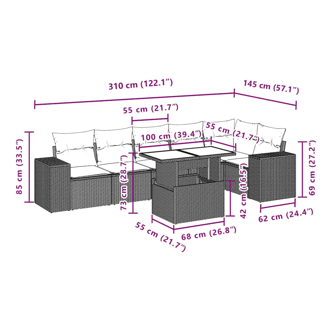 Cet ensemble de canapés de jardin est le complément parfait de votre arrière-cour, terrasse ou patio, offrant un espace confortable et accueillant pour discuter avec la famille et les amis ou simplement se détendre et profiter de l'extérieur. Matériau durable : la résine tressée, également connue sous le nom de poly rotin, est un matériau synthétique solide et nécessitant peu d'entretien qui ressemble au rotin naturel. Il est léger, facile à nettoyer et couramment utilisé pour les meubles d'extérieur en raison de sa durabilité et de ses propriétés de résistance aux intempéries.Dessus de table réglable : le dessus de table peut être soulevé pour rendre la table plus haute, ce qui transforme la table d'extérieur d'une table basse à une table de salle à manger. Elle est parfaite pour recevoir des invités ou prendre des repas à l'extérieur.Expérience d'assise confortable : ce mobilier d'extérieur, doté de coussins épais, offre une expérience d'assise confortable.Housse amovible et lavable : ces coussins de siège sont dotés de housses amovibles pour un lavage et un entretien faciles.Conception modulaire : cet ensemble de meubles d'extérieur a une conception modulaire, ce qui le rend complètement flexible et facile à déplacer, afin que vous puissiez créer un agencement de meubles d'extérieur personnalisé. Bon à savoir :Pour que vos meubles d'extérieur restent beaux, nous vous recommandons de les protéger avec une housse imperméable.