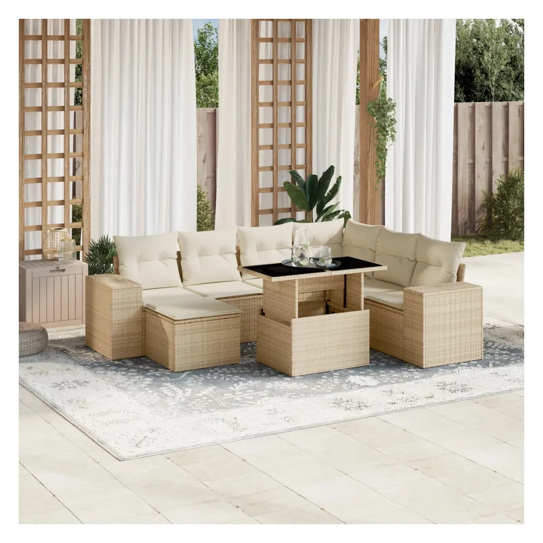 Cet ensemble de canapés de jardin est le complément parfait de votre arrière-cour, terrasse ou patio, offrant un espace confortable et accueillant pour discuter avec la famille et les amis ou simplement se détendre et profiter de l'extérieur. Matériau durable : la résine tressée, également connue sous le nom de poly rotin, est un matériau synthétique solide et nécessitant peu d'entretien qui ressemble au rotin naturel. Il est léger, facile à nettoyer et couramment utilisé pour les meubles d'extérieur en raison de sa durabilité et de ses propriétés de résistance aux intempéries.Dessus de table réglable : le dessus de table peut être soulevé pour rendre la table plus haute, ce qui transforme la table d'extérieur d'une table basse à une table de salle à manger. Elle est parfaite pour recevoir des invités ou prendre des repas à l'extérieur.Expérience d'assise confortable : ce mobilier d'extérieur, doté de coussins épais, offre une expérience d'assise confortable.Housse amovible et lavable : ces coussins de siège sont dotés de housses amovibles pour un lavage et un entretien faciles.Conception modulaire : cet ensemble de meubles d'extérieur a une conception modulaire, ce qui le rend complètement flexible et facile à déplacer, afin que vous puissiez créer un agencement de meubles d'extérieur personnalisé. Bon à savoir :Pour que vos meubles d'extérieur restent beaux, nous vous recommandons de les protéger avec une housse imperméable.