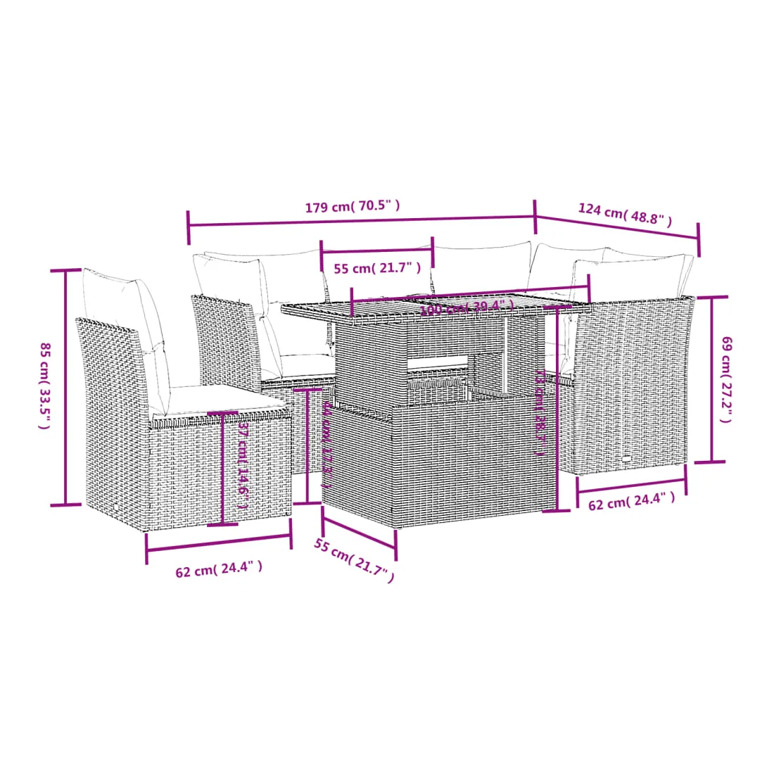 Cet ensemble de canapés de jardin est le complément parfait de votre arrière-cour, terrasse ou patio, offrant un espace confortable et accueillant pour discuter avec la famille et les amis ou simplement se détendre et profiter de l'extérieur. Matériau durable : la résine tressée, également connue sous le nom de poly rotin, est un matériau synthétique solide et nécessitant peu d'entretien qui ressemble au rotin naturel. Il est léger, facile à nettoyer et couramment utilisé pour les meubles d'extérieur en raison de sa durabilité et de ses propriétés de résistance aux intempéries.Dessus de table réglable : le dessus de table peut être soulevé pour rendre la table plus haute, ce qui transforme la table d'extérieur d'une table basse à une table de salle à manger. Elle est parfaite pour recevoir des invités ou prendre des repas à l'extérieur.Expérience d'assise confortable : ce mobilier d'extérieur, doté de coussins épais, offre une expérience d'assise confortable.Housse amovible et lavable : ces coussins de siège sont dotés de housses amovibles pour un lavage et un entretien faciles.Conception modulaire : cet ensemble de meubles d'extérieur a une conception modulaire, ce qui le rend complètement flexible et facile à déplacer, afin que vous puissiez créer un agencement de meubles d'extérieur personnalisé. Bon à savoir :Pour que vos meubles d'extérieur restent beaux, nous vous recommandons de les protéger avec une housse imperméable.