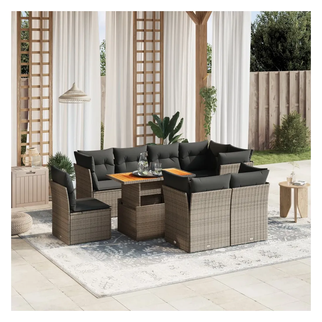 Cet ensemble de canapés de jardin est le complément parfait de votre arrière-cour, terrasse ou patio, offrant un espace confortable et accueillant pour discuter avec la famille et les amis ou simplement se détendre et profiter de l'extérieur. Matériau durable : la résine tressée, également connue sous le nom de poly rotin, est un matériau synthétique solide et nécessitant peu d'entretien qui ressemble au rotin naturel. Il est léger, facile à nettoyer et couramment utilisé pour les meubles d'extérieur en raison de sa durabilité et de ses propriétés de résistance aux intempéries.Dessus de table réglable : le dessus de table peut être soulevé pour rendre la table plus haute, ce qui transforme la table d'extérieur d'une table basse à une table de salle à manger. Elle est parfaite pour recevoir des invités ou prendre des repas à l'extérieur.Expérience d'assise confortable : ce mobilier d'extérieur, doté de coussins épais, offre une expérience d'assise confortable.Housse amovible et lavable : ces coussins de siège sont dotés de housses amovibles pour un lavage et un entretien faciles.Conception modulaire : cet ensemble de meubles d'extérieur a une conception modulaire, ce qui le rend complètement flexible et facile à déplacer, afin que vous puissiez créer un agencement de meubles d'extérieur personnalisé. Bon à savoir :Pour que vos meubles d'extérieur restent beaux, nous vous recommandons de les protéger avec une housse imperméable.