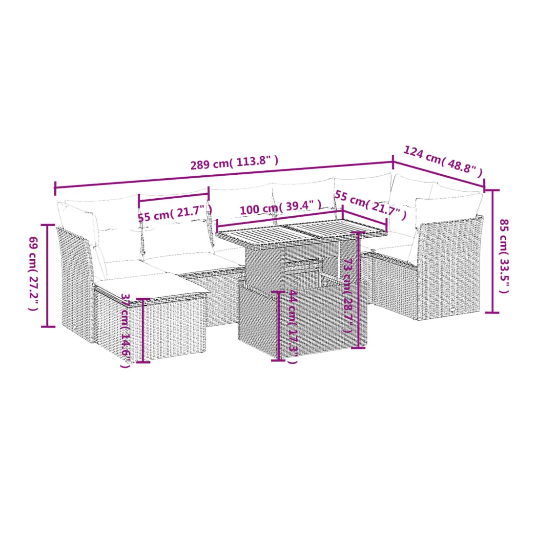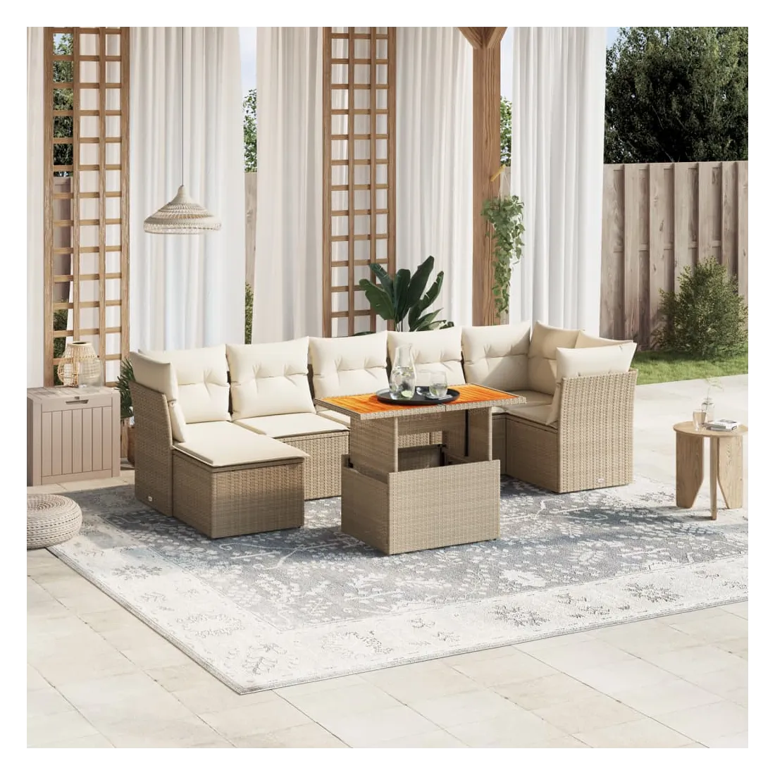 Cet ensemble de canapés de jardin est le complément parfait de votre arrière-cour, terrasse ou patio, offrant un espace confortable et accueillant pour discuter avec la famille et les amis ou simplement se détendre et profiter de l'extérieur. Matériau durable : la résine tressée, également connue sous le nom de poly rotin, est un matériau synthétique solide et nécessitant peu d'entretien qui ressemble au rotin naturel. Il est léger, facile à nettoyer et couramment utilisé pour les meubles d'extérieur en raison de sa durabilité et de ses propriétés de résistance aux intempéries.Dessus de table réglable : le dessus de table peut être soulevé pour rendre la table plus haute, ce qui transforme la table d'extérieur d'une table basse à une table de salle à manger. Elle est parfaite pour recevoir des invités ou prendre des repas à l'extérieur.Expérience d'assise confortable : ce mobilier d'extérieur, doté de coussins épais, offre une expérience d'assise confortable.Housse amovible et lavable : ces coussins de siège sont dotés de housses amovibles pour un lavage et un entretien faciles.Conception modulaire : cet ensemble de meubles d'extérieur a une conception modulaire, ce qui le rend complètement flexible et facile à déplacer, afin que vous puissiez créer un agencement de meubles d'extérieur personnalisé. Bon à savoir :Pour que vos meubles d'extérieur restent beaux, nous vous recommandons de les protéger avec une housse imperméable.