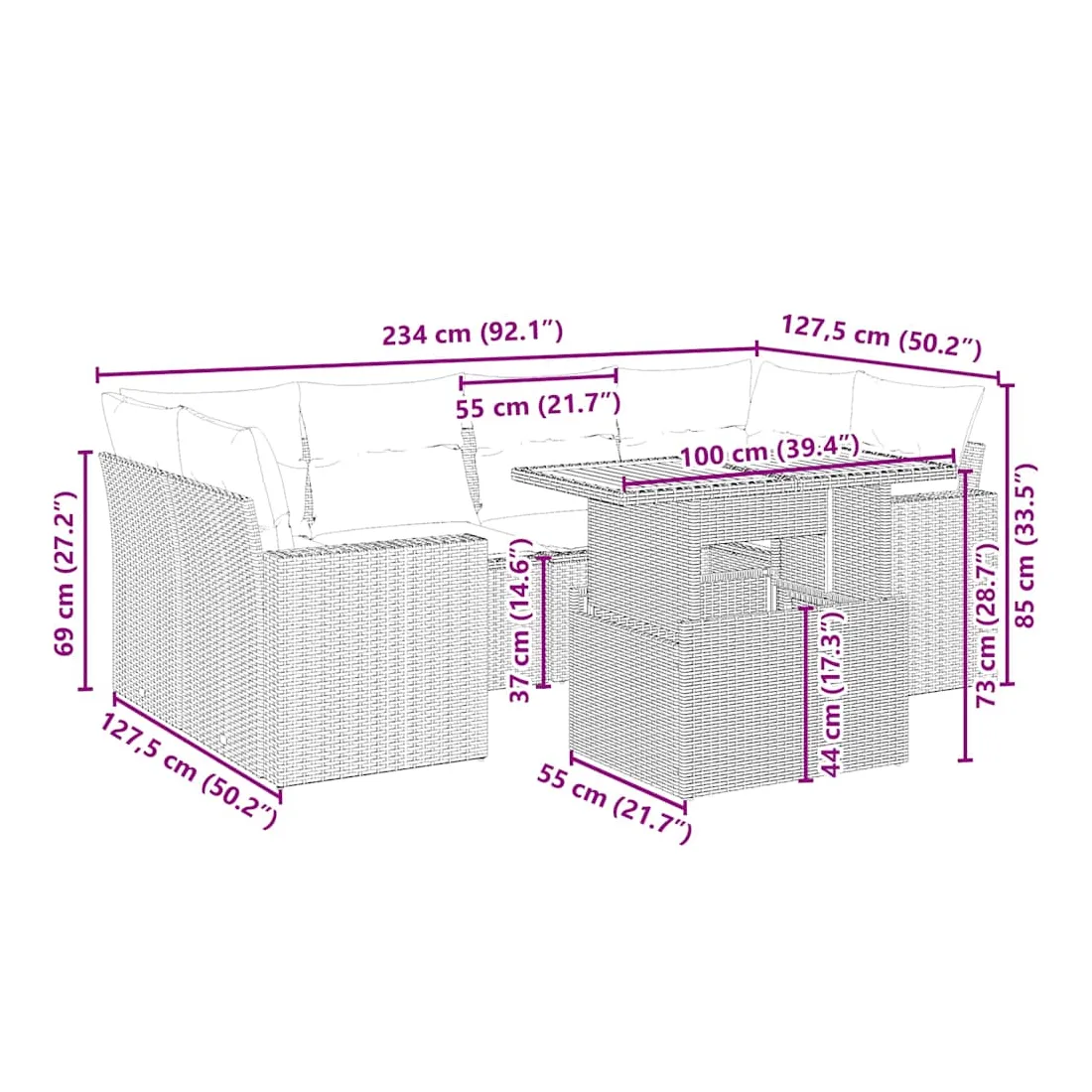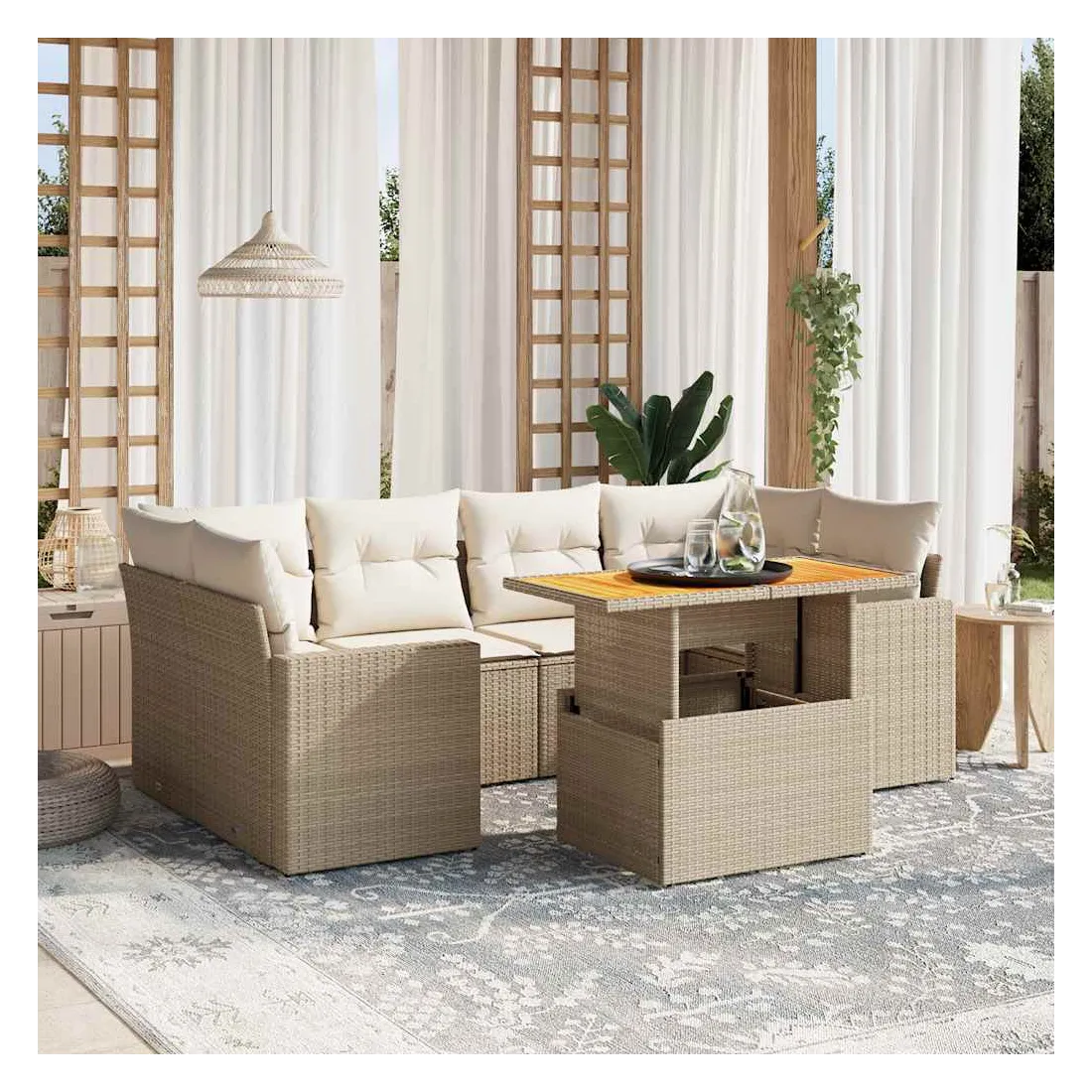 Cet ensemble de canapés de jardin est le complément parfait de votre arrière-cour, terrasse ou patio, offrant un espace confortable et accueillant pour discuter avec la famille et les amis ou simplement se détendre et profiter de l'extérieur. Matériau durable : la résine tressée, également connue sous le nom de poly rotin, est un matériau synthétique solide et nécessitant peu d'entretien qui ressemble au rotin naturel. Il est léger, facile à nettoyer et couramment utilisé pour les meubles d'extérieur en raison de sa durabilité et de ses propriétés de résistance aux intempéries.Dessus de table réglable : le dessus de table peut être soulevé pour rendre la table plus haute, ce qui transforme la table d'extérieur d'une table basse à une table de salle à manger. Elle est parfaite pour recevoir des invités ou prendre des repas à l'extérieur.Expérience d'assise confortable : ce mobilier d'extérieur, doté de coussins épais, offre une expérience d'assise confortable.Housse amovible et lavable : ces coussins de siège sont dotés de housses amovibles pour un lavage et un entretien faciles.Conception modulaire : cet ensemble de meubles d'extérieur a une conception modulaire, ce qui le rend complètement flexible et facile à déplacer, afin que vous puissiez créer un agencement de meubles d'extérieur personnalisé. Bon à savoir :Pour que vos meubles d'extérieur restent beaux, nous vous recommandons de les protéger avec une housse imperméable.