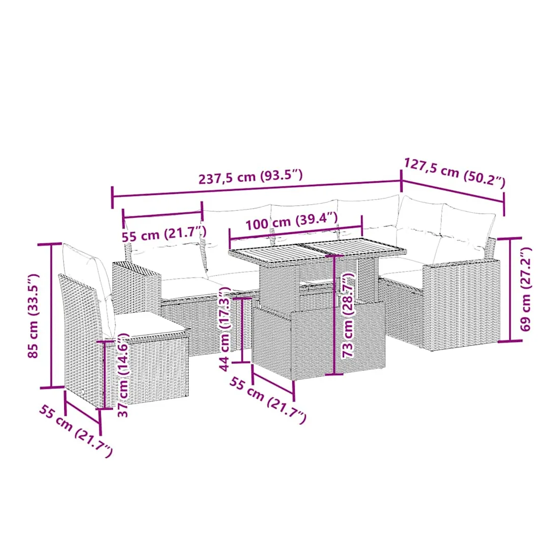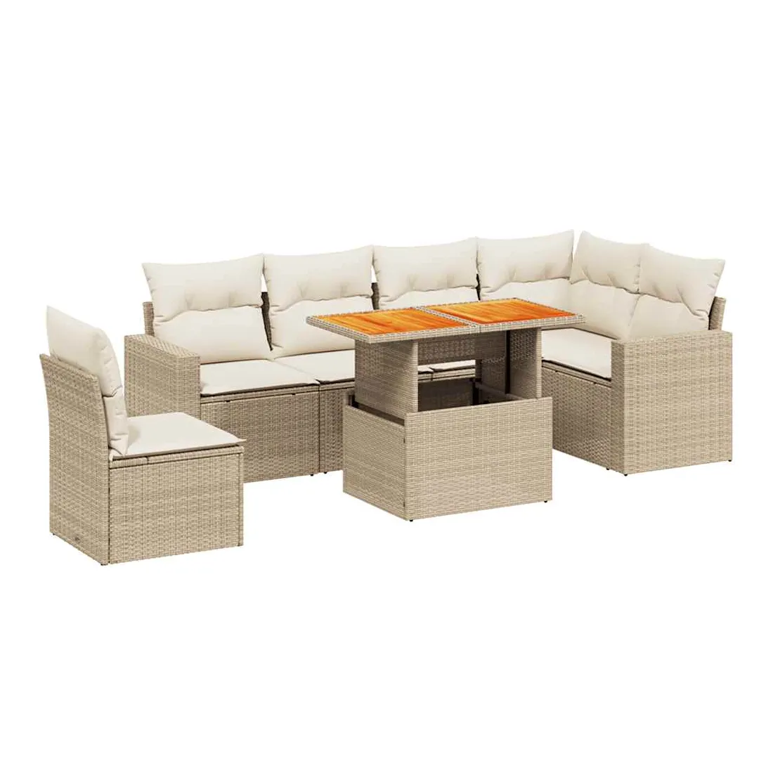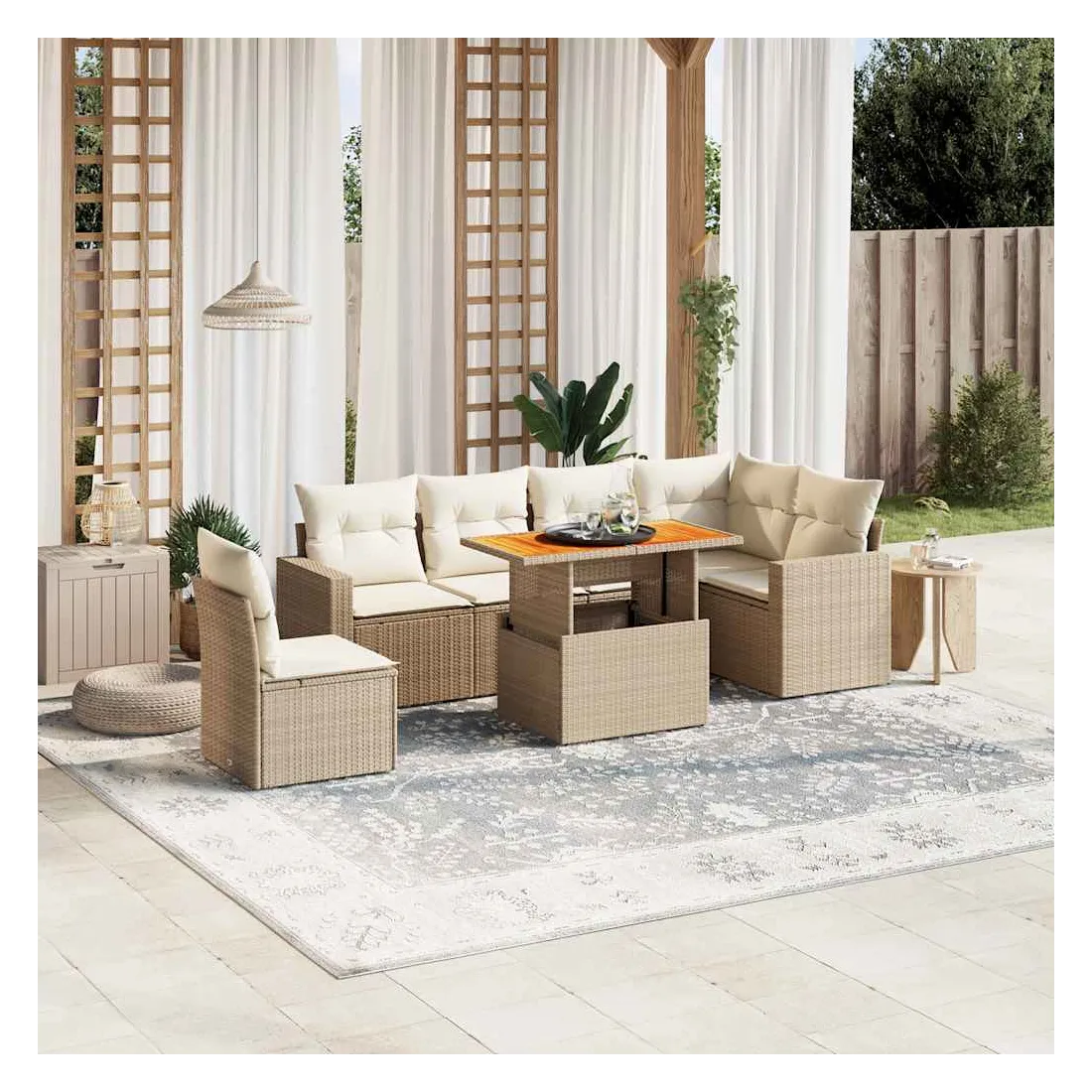 Cet ensemble de canapés de jardin est le complément parfait de votre arrière-cour, terrasse ou patio, offrant un espace confortable et accueillant pour discuter avec la famille et les amis ou simplement se détendre et profiter de l'extérieur. Matériau durable : la résine tressée, également connue sous le nom de poly rotin, est un matériau synthétique solide et nécessitant peu d'entretien qui ressemble au rotin naturel. Il est léger, facile à nettoyer et couramment utilisé pour les meubles d'extérieur en raison de sa durabilité et de ses propriétés de résistance aux intempéries.Dessus de table réglable : le dessus de table peut être soulevé pour rendre la table plus haute, ce qui transforme la table d'extérieur d'une table basse à une table de salle à manger. Elle est parfaite pour recevoir des invités ou prendre des repas à l'extérieur.Expérience d'assise confortable : ce mobilier d'extérieur, doté de coussins épais, offre une expérience d'assise confortable.Housse amovible et lavable : ces coussins de siège sont dotés de housses amovibles pour un lavage et un entretien faciles.Conception modulaire : cet ensemble de meubles d'extérieur a une conception modulaire, ce qui le rend complètement flexible et facile à déplacer, afin que vous puissiez créer un agencement de meubles d'extérieur personnalisé. Bon à savoir :Pour que vos meubles d'extérieur restent beaux, nous vous recommandons de les protéger avec une housse imperméable.