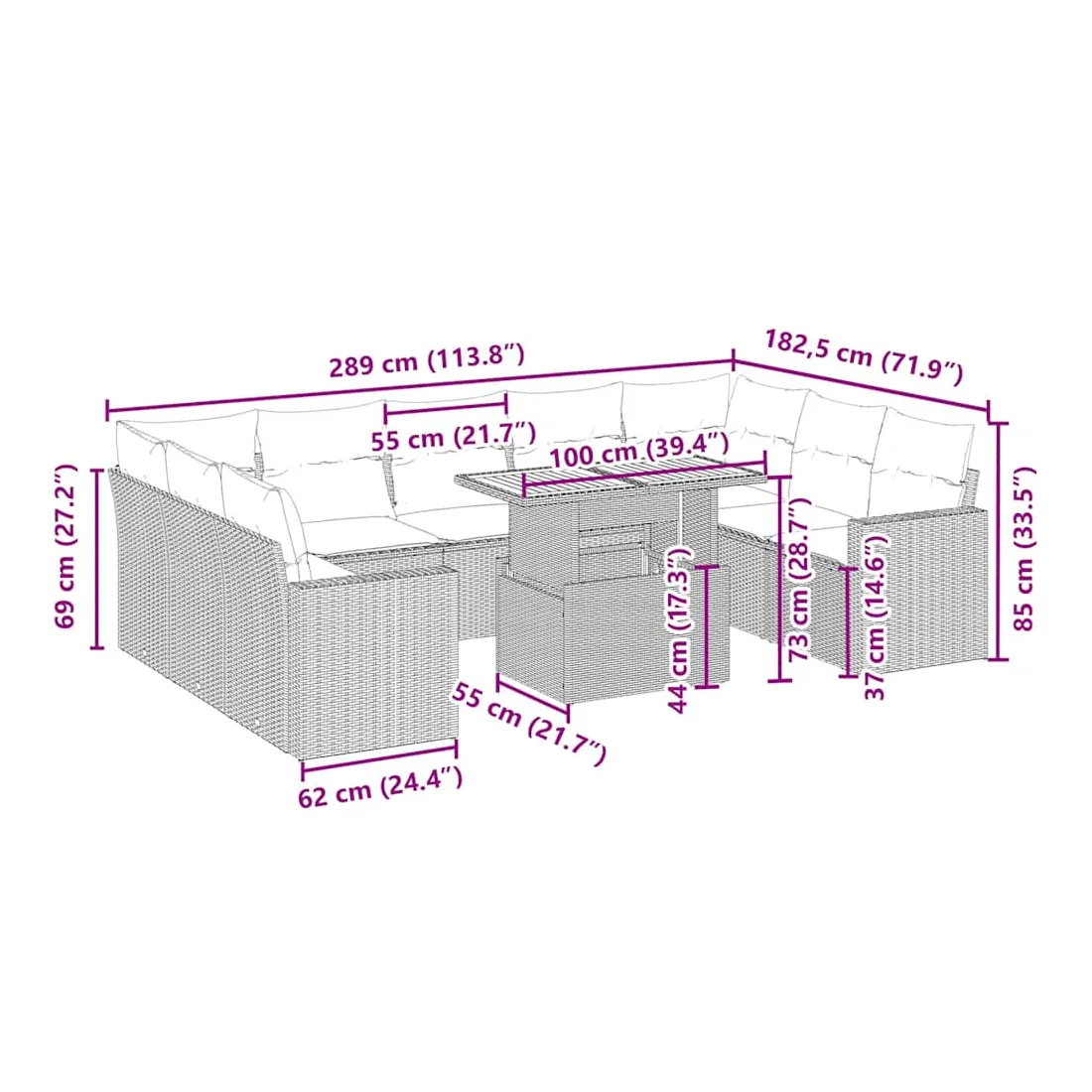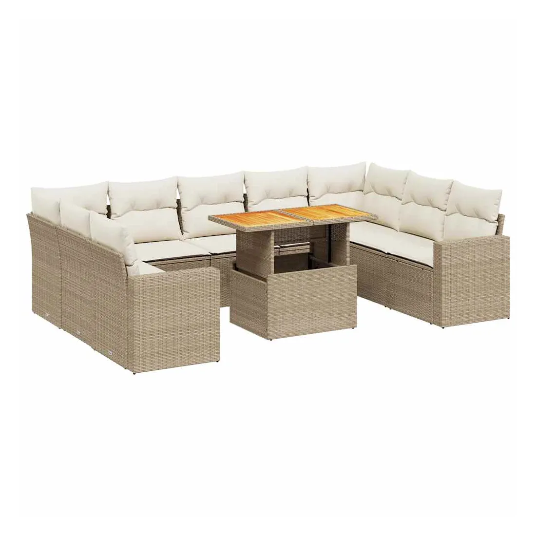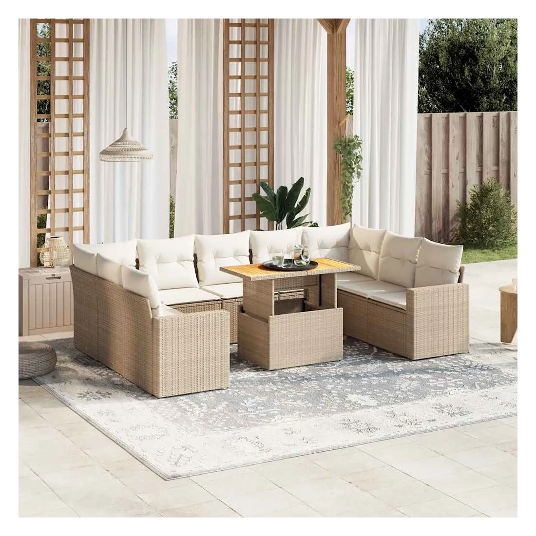 Cet ensemble de canapés de jardin est le complément parfait de votre arrière-cour, terrasse ou patio, offrant un espace confortable et accueillant pour discuter avec la famille et les amis ou simplement se détendre et profiter de l'extérieur. Matériau durable : la résine tressée, également connue sous le nom de poly rotin, est un matériau synthétique solide et nécessitant peu d'entretien qui ressemble au rotin naturel. Il est léger, facile à nettoyer et couramment utilisé pour les meubles d'extérieur en raison de sa durabilité et de ses propriétés de résistance aux intempéries.Dessus de table réglable : le dessus de table peut être soulevé pour rendre la table plus haute, ce qui transforme la table d'extérieur d'une table basse à une table de salle à manger. Elle est parfaite pour recevoir des invités ou prendre des repas à l'extérieur.Expérience d'assise confortable : ce mobilier d'extérieur, doté de coussins épais, offre une expérience d'assise confortable.Housse amovible et lavable : ces coussins de siège sont dotés de housses amovibles pour un lavage et un entretien faciles.Conception modulaire : cet ensemble de meubles d'extérieur a une conception modulaire, ce qui le rend complètement flexible et facile à déplacer, afin que vous puissiez créer un agencement de meubles d'extérieur personnalisé. Bon à savoir :Pour que vos meubles d'extérieur restent beaux, nous vous recommandons de les protéger avec une housse imperméable.