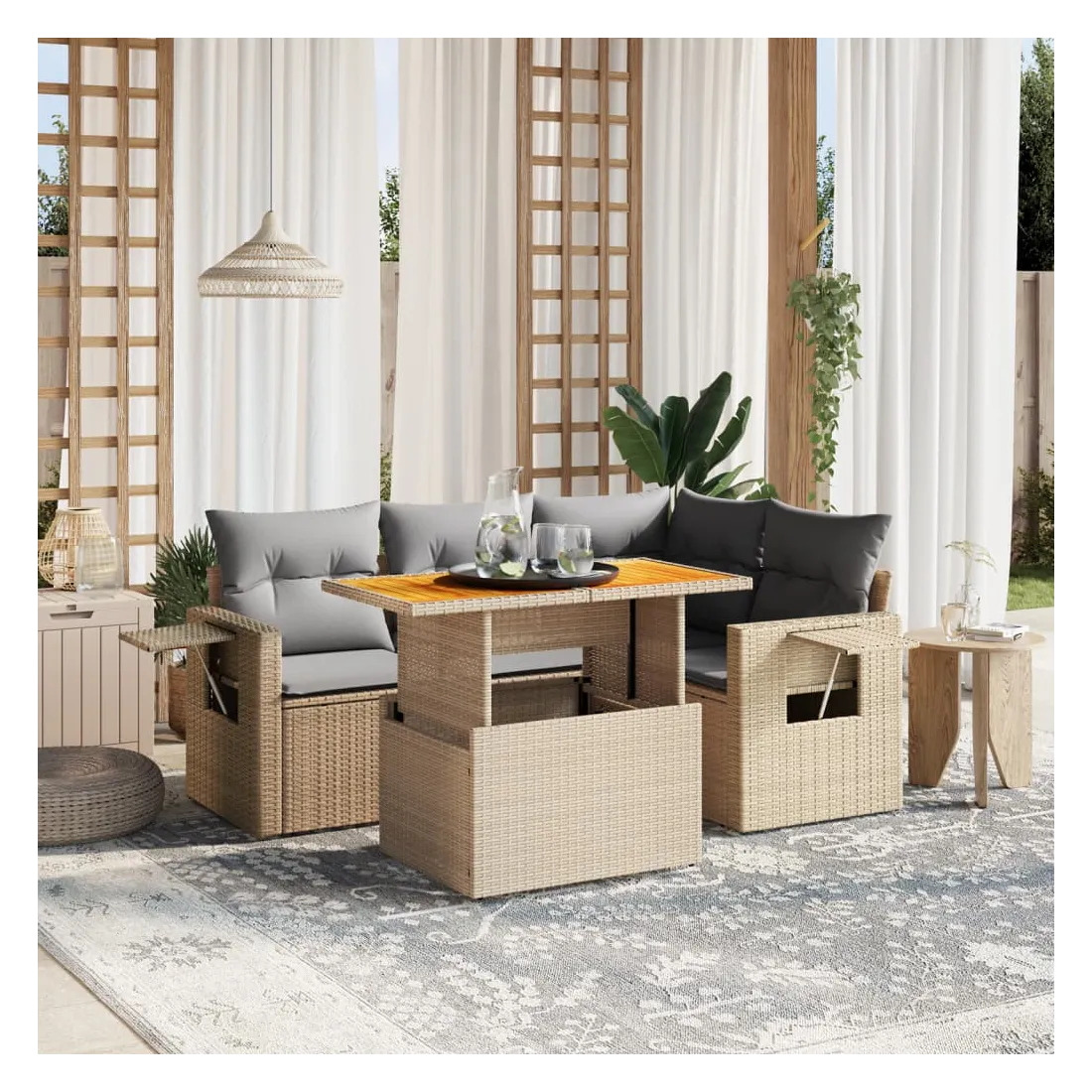 Cet ensemble de canapés de jardin est le complément parfait de votre arrière-cour, terrasse ou patio, offrant un espace confortable et accueillant pour discuter avec la famille et les amis ou simplement se détendre et profiter de l'extérieur. Matériau durable : la résine tressée, également connue sous le nom de poly rotin, est un matériau synthétique solide et nécessitant peu d'entretien qui ressemble au rotin naturel. Il est léger, facile à nettoyer et couramment utilisé pour les meubles d'extérieur en raison de sa durabilité et de ses propriétés de résistance aux intempéries.Dessus de table réglable : le dessus de table peut être soulevé pour rendre la table plus haute, ce qui transforme la table d'extérieur d'une table basse à une table de salle à manger. Elle est parfaite pour recevoir des invités ou prendre des repas à l'extérieur.Table d'appoint pratique : ce mobilier d'extérieur comprend une table d'appoint pliable avec un ressort à gaz sur les accoudoirs, offrant un endroit pratique pour garder vos essentiels à portée de main.Housse amovible et lavable : ces coussins de siège sont dotés de housses amovibles pour un lavage et un entretien faciles.Conception modulaire : cet ensemble de meubles d'extérieur a une conception modulaire, ce qui le rend complètement flexible et facile à déplacer, afin que vous puissiez créer un agencement de meubles d'extérieur personnalisé. Bon à savoir :Pour que vos meubles d'extérieur restent beaux, nous vous recommandons de les protéger avec une housse imperméable.
