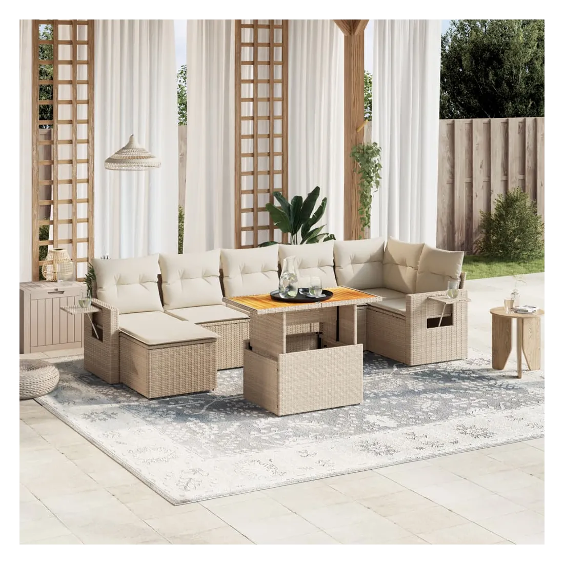 Cet ensemble de canapés de jardin est le complément parfait de votre arrière-cour, terrasse ou patio, offrant un espace confortable et accueillant pour discuter avec la famille et les amis ou simplement se détendre et profiter de l'extérieur. Matériau durable : la résine tressée, également connue sous le nom de poly rotin, est un matériau synthétique solide et nécessitant peu d'entretien qui ressemble au rotin naturel. Il est léger, facile à nettoyer et couramment utilisé pour les meubles d'extérieur en raison de sa durabilité et de ses propriétés de résistance aux intempéries.Dessus de table réglable : le dessus de table peut être soulevé pour rendre la table plus haute, ce qui transforme la table d'extérieur d'une table basse à une table de salle à manger. Elle est parfaite pour recevoir des invités ou prendre des repas à l'extérieur.Table d'appoint pratique : ce mobilier d'extérieur comprend une table d'appoint pliable avec un ressort à gaz sur les accoudoirs, offrant un endroit pratique pour garder vos essentiels à portée de main.Housse amovible et lavable : ces coussins de siège sont dotés de housses amovibles pour un lavage et un entretien faciles.Conception modulaire : cet ensemble de meubles d'extérieur a une conception modulaire, ce qui le rend complètement flexible et facile à déplacer, afin que vous puissiez créer un agencement de meubles d'extérieur personnalisé. Bon à savoir :Pour que vos meubles d'extérieur restent beaux, nous vous recommandons de les protéger avec une housse imperméable.