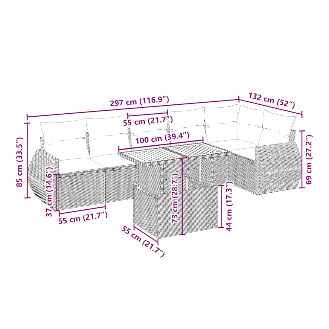 Cet ensemble de canapés de jardin est le complément parfait de votre arrière-cour, terrasse ou patio, offrant un espace confortable et accueillant pour discuter avec la famille et les amis ou simplement se détendre et profiter de l'extérieur. Matériau durable : la résine tressée, également connue sous le nom de poly rotin, est un matériau synthétique solide et nécessitant peu d'entretien qui ressemble au rotin naturel. Il est léger, facile à nettoyer et couramment utilisé pour les meubles d'extérieur en raison de sa durabilité et de ses propriétés de résistance aux intempéries.Dessus de table réglable : le dessus de table peut être soulevé pour rendre la table plus haute, ce qui transforme la table d'extérieur d'une table basse à une table de salle à manger. Elle est parfaite pour recevoir des invités ou prendre des repas à l'extérieur.Expérience d'assise confortable : ce mobilier d'extérieur, doté de coussins épais, offre une expérience d'assise confortable.Housse amovible et lavable : ces coussins de siège sont dotés de housses amovibles pour un lavage et un entretien faciles.Conception modulaire : cet ensemble de meubles d'extérieur a une conception modulaire, ce qui le rend complètement flexible et facile à déplacer, afin que vous puissiez créer un agencement de meubles d'extérieur personnalisé. Bon à savoir :Pour que vos meubles d'extérieur restent beaux, nous vous recommandons de les protéger avec une housse imperméable.