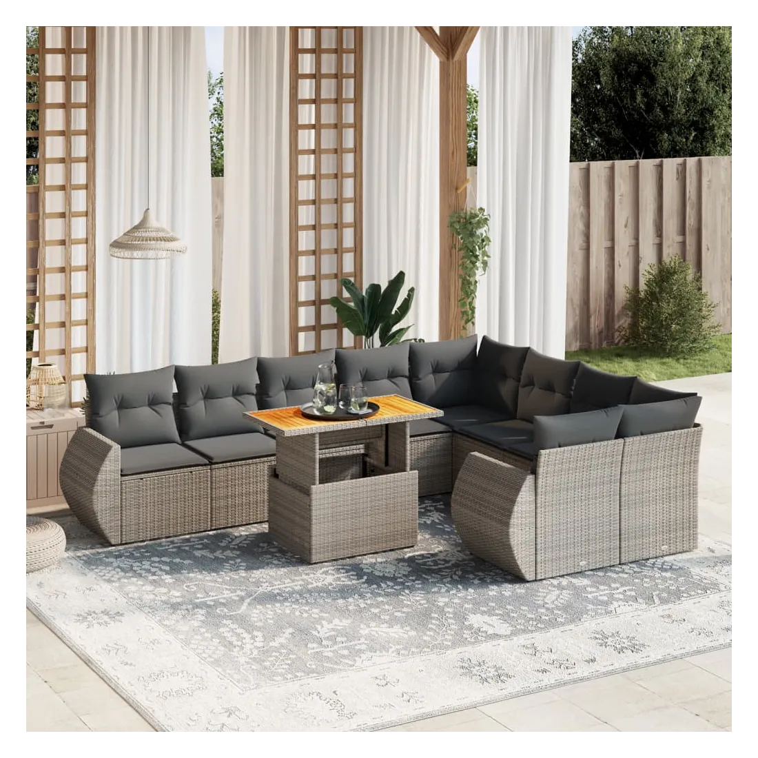 Cet ensemble de canapés de jardin est le complément parfait de votre arrière-cour, terrasse ou patio, offrant un espace confortable et accueillant pour discuter avec la famille et les amis ou simplement se détendre et profiter de l'extérieur. Matériau durable : la résine tressée, également connue sous le nom de poly rotin, est un matériau synthétique solide et nécessitant peu d'entretien qui ressemble au rotin naturel. Il est léger, facile à nettoyer et couramment utilisé pour les meubles d'extérieur en raison de sa durabilité et de ses propriétés de résistance aux intempéries.Dessus de table réglable : le dessus de table peut être soulevé pour rendre la table plus haute, ce qui transforme la table d'extérieur d'une table basse à une table de salle à manger. Elle est parfaite pour recevoir des invités ou prendre des repas à l'extérieur.Expérience d'assise confortable : ce mobilier d'extérieur, doté de coussins épais, offre une expérience d'assise confortable.Housse amovible et lavable : ces coussins de siège sont dotés de housses amovibles pour un lavage et un entretien faciles.Conception modulaire : cet ensemble de meubles d'extérieur a une conception modulaire, ce qui le rend complètement flexible et facile à déplacer, afin que vous puissiez créer un agencement de meubles d'extérieur personnalisé. Bon à savoir :Pour que vos meubles d'extérieur restent beaux, nous vous recommandons de les protéger avec une housse imperméable.
