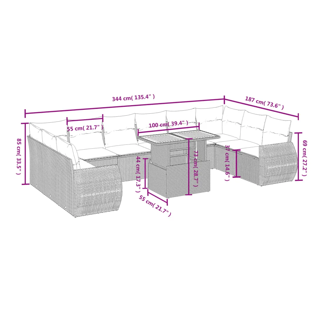 Cet ensemble de canapés de jardin est le complément parfait de votre arrière-cour, terrasse ou patio, offrant un espace confortable et accueillant pour discuter avec la famille et les amis ou simplement se détendre et profiter de l'extérieur. Matériau durable : la résine tressée, également connue sous le nom de poly rotin, est un matériau synthétique solide et nécessitant peu d'entretien qui ressemble au rotin naturel. Il est léger, facile à nettoyer et couramment utilisé pour les meubles d'extérieur en raison de sa durabilité et de ses propriétés de résistance aux intempéries.Dessus de table réglable : le dessus de table peut être soulevé pour rendre la table plus haute, ce qui transforme la table d'extérieur d'une table basse à une table de salle à manger. Elle est parfaite pour recevoir des invités ou prendre des repas à l'extérieur.Expérience d'assise confortable : ce mobilier d'extérieur, doté de coussins épais, offre une expérience d'assise confortable.Housse amovible et lavable : ces coussins de siège sont dotés de housses amovibles pour un lavage et un entretien faciles.Conception modulaire : cet ensemble de meubles d'extérieur a une conception modulaire, ce qui le rend complètement flexible et facile à déplacer, afin que vous puissiez créer un agencement de meubles d'extérieur personnalisé. Bon à savoir :Pour que vos meubles d'extérieur restent beaux, nous vous recommandons de les protéger avec une housse imperméable.