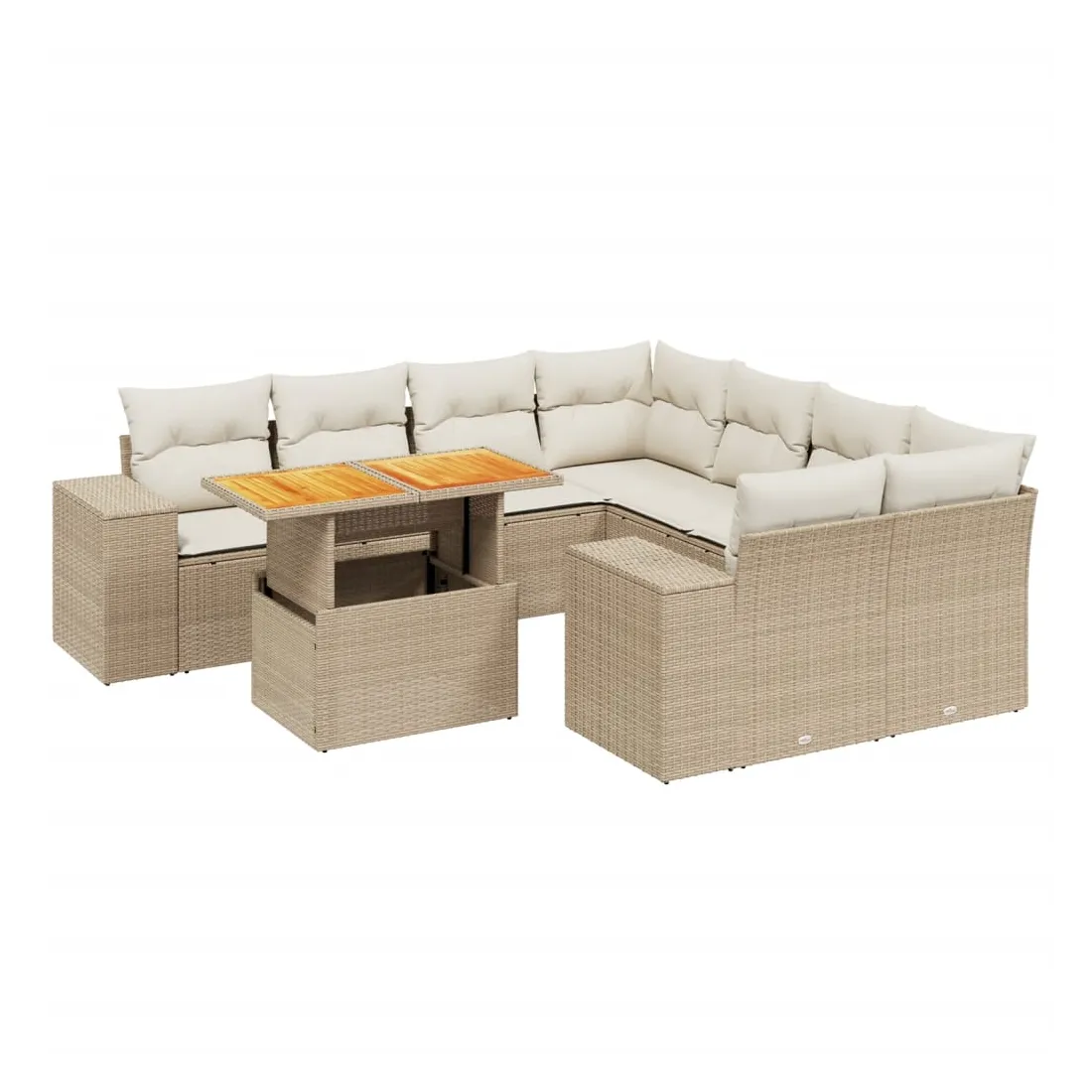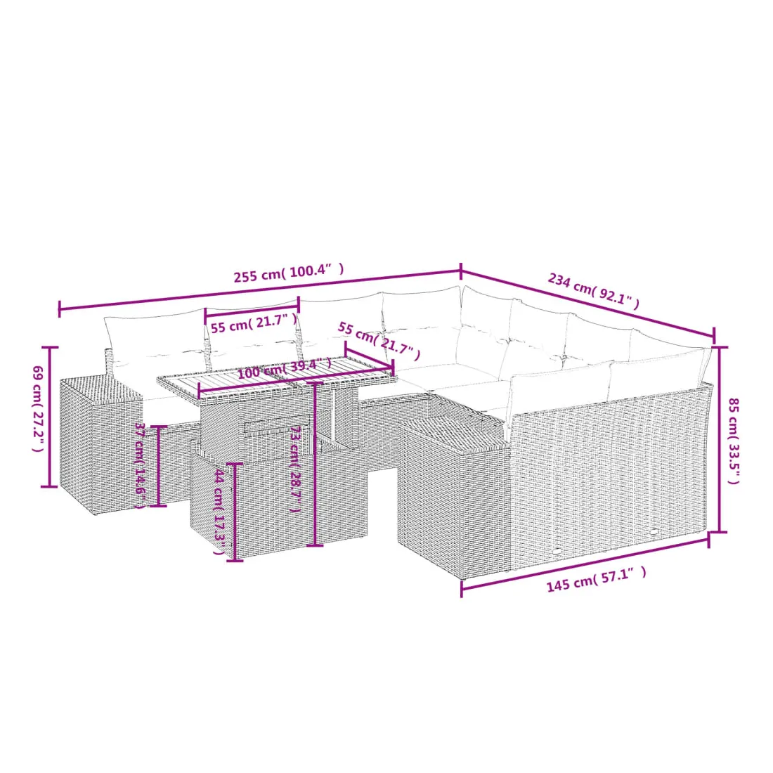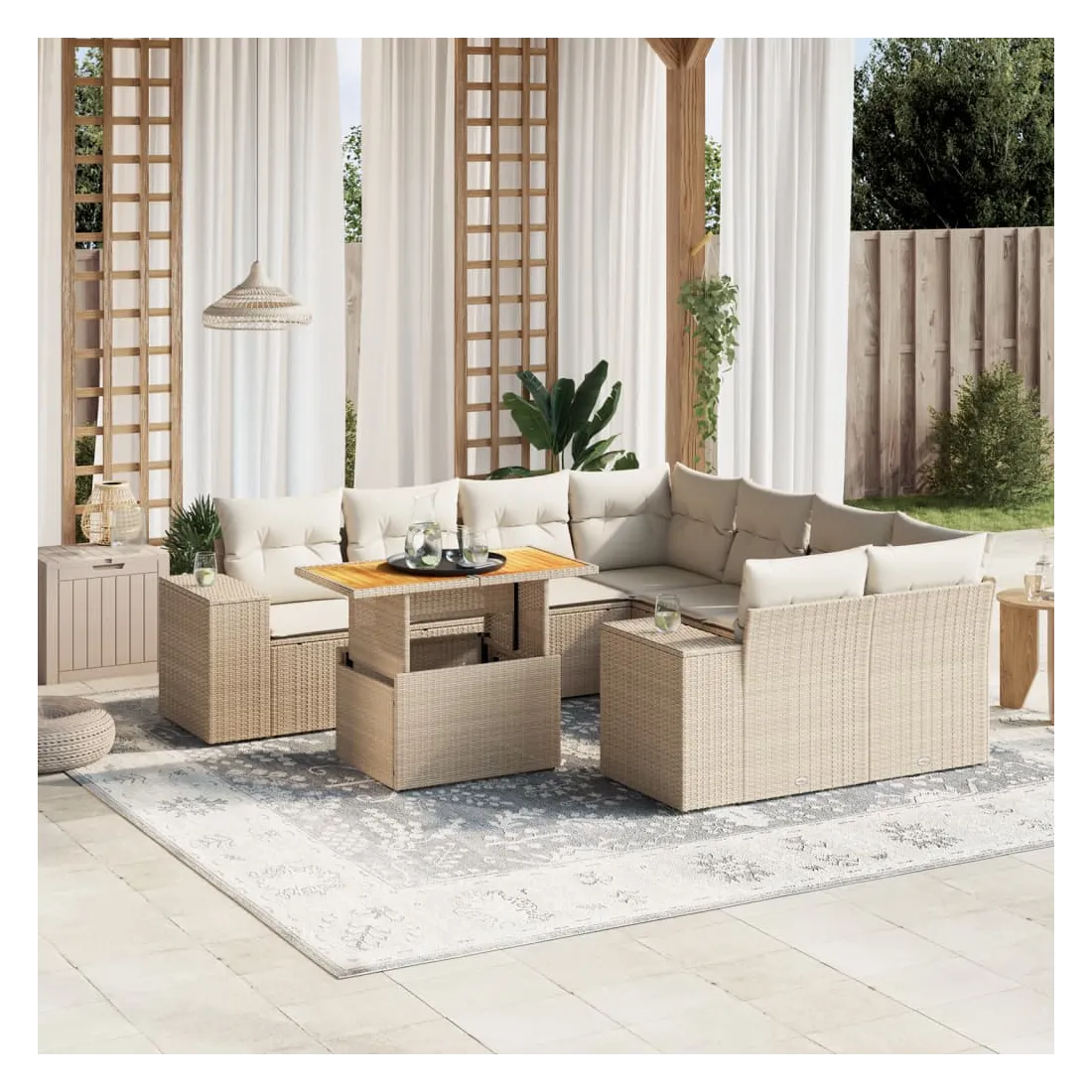 Cet ensemble de canapés de jardin est le complément parfait de votre arrière-cour, terrasse ou patio, offrant un espace confortable et accueillant pour discuter avec la famille et les amis ou simplement se détendre et profiter de l'extérieur. Matériau durable : la résine tressée, également connue sous le nom de poly rotin, est un matériau synthétique solide et nécessitant peu d'entretien qui ressemble au rotin naturel. Il est léger, facile à nettoyer et couramment utilisé pour les meubles d'extérieur en raison de sa durabilité et de ses propriétés de résistance aux intempéries.Dessus de table réglable : le dessus de table peut être soulevé pour rendre la table plus haute, ce qui transforme la table d'extérieur d'une table basse à une table de salle à manger. Elle est parfaite pour recevoir des invités ou prendre des repas à l'extérieur.Expérience d'assise confortable : ce mobilier d'extérieur, doté de coussins épais, offre une expérience d'assise confortable.Housse amovible et lavable : ces coussins de siège sont dotés de housses amovibles pour un lavage et un entretien faciles.Conception modulaire : cet ensemble de meubles d'extérieur a une conception modulaire, ce qui le rend complètement flexible et facile à déplacer, afin que vous puissiez créer un agencement de meubles d'extérieur personnalisé. Bon à savoir :Pour que vos meubles d'extérieur restent beaux, nous vous recommandons de les protéger avec une housse imperméable.