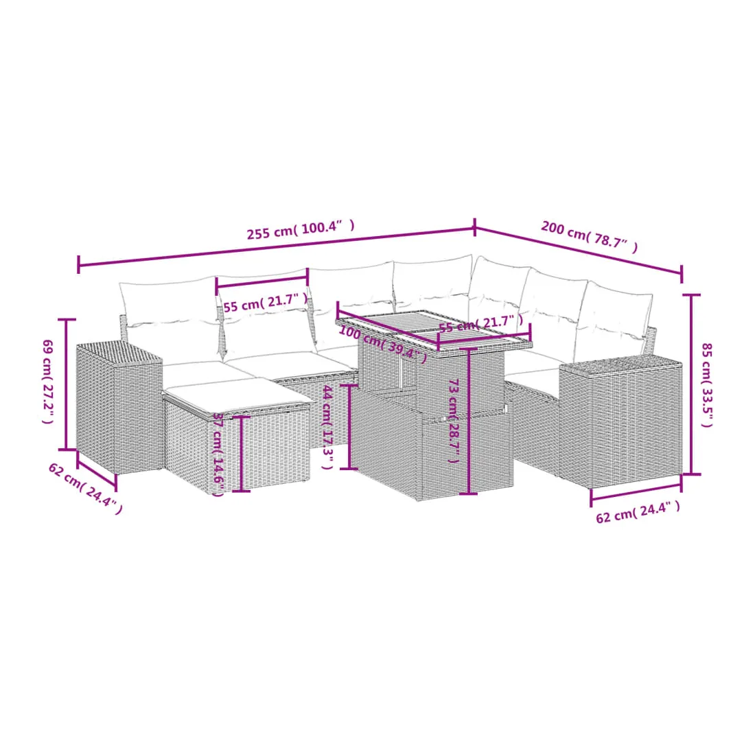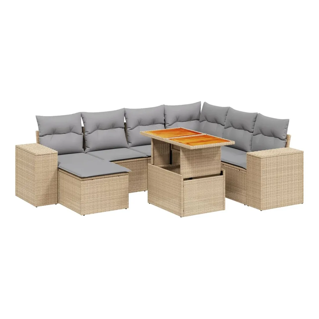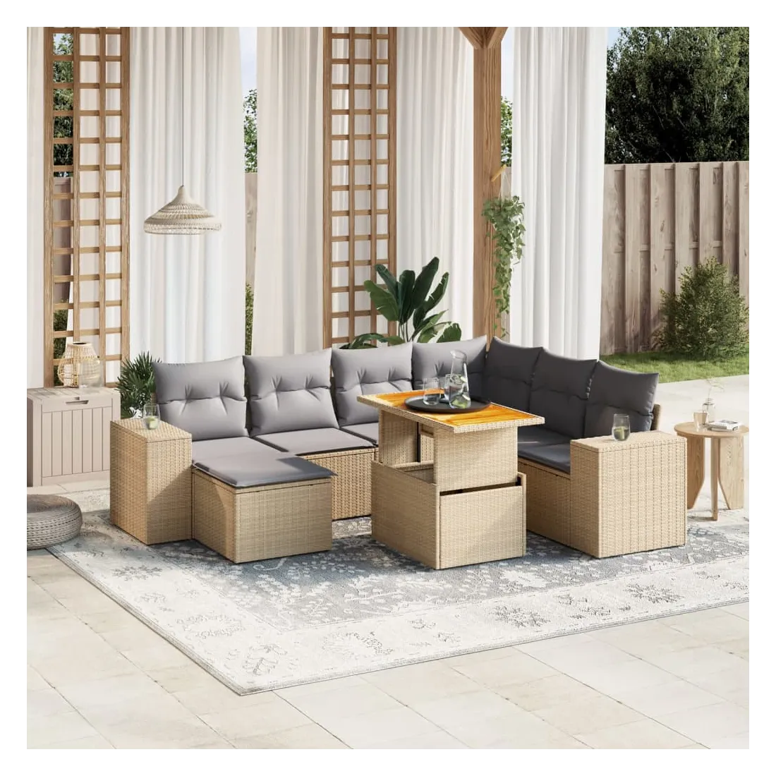 Cet ensemble de canapés de jardin est le complément parfait de votre arrière-cour, terrasse ou patio, offrant un espace confortable et accueillant pour discuter avec la famille et les amis ou simplement se détendre et profiter de l'extérieur. Matériau durable : la résine tressée, également connue sous le nom de poly rotin, est un matériau synthétique solide et nécessitant peu d'entretien qui ressemble au rotin naturel. Il est léger, facile à nettoyer et couramment utilisé pour les meubles d'extérieur en raison de sa durabilité et de ses propriétés de résistance aux intempéries.Dessus de table réglable : le dessus de table peut être soulevé pour rendre la table plus haute, ce qui transforme la table d'extérieur d'une table basse à une table de salle à manger. Elle est parfaite pour recevoir des invités ou prendre des repas à l'extérieur.Expérience d'assise confortable : ce mobilier d'extérieur, doté de coussins épais, offre une expérience d'assise confortable.Housse amovible et lavable : ces coussins de siège sont dotés de housses amovibles pour un lavage et un entretien faciles.Conception modulaire : cet ensemble de meubles d'extérieur a une conception modulaire, ce qui le rend complètement flexible et facile à déplacer, afin que vous puissiez créer un agencement de meubles d'extérieur personnalisé. Bon à savoir :Pour que vos meubles d'extérieur restent beaux, nous vous recommandons de les protéger avec une housse imperméable.