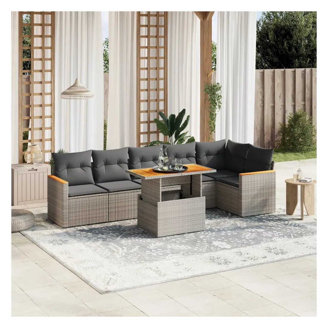 Cet ensemble de canapés de jardin est le complément parfait de votre arrière-cour, terrasse ou patio, offrant un espace confortable et accueillant pour discuter avec la famille et les amis ou simplement se détendre et profiter de l'extérieur. Matériau durable : la résine tressée, également connue sous le nom de poly rotin, est un matériau synthétique solide et nécessitant peu d'entretien qui ressemble au rotin naturel. Il est léger, facile à nettoyer et couramment utilisé pour les meubles d'extérieur en raison de sa durabilité et de ses propriétés de résistance aux intempéries.Dessus de table réglable : le dessus de table peut être soulevé pour rendre la table plus haute, ce qui transforme la table d'extérieur d'une table basse à une table de salle à manger. Elle est parfaite pour recevoir des invités ou prendre des repas à l'extérieur.Expérience d'assise confortable : ce mobilier d'extérieur, doté de coussins épais, offre une expérience d'assise confortable.Housse amovible et lavable : ces coussins de siège sont dotés de housses amovibles pour un lavage et un entretien faciles.Conception modulaire : cet ensemble de meubles d'extérieur a une conception modulaire, ce qui le rend complètement flexible et facile à déplacer, afin que vous puissiez créer un agencement de meubles d'extérieur personnalisé. Bon à savoir :Pour que vos meubles d'extérieur restent beaux, nous vous recommandons de les protéger avec une housse imperméable.