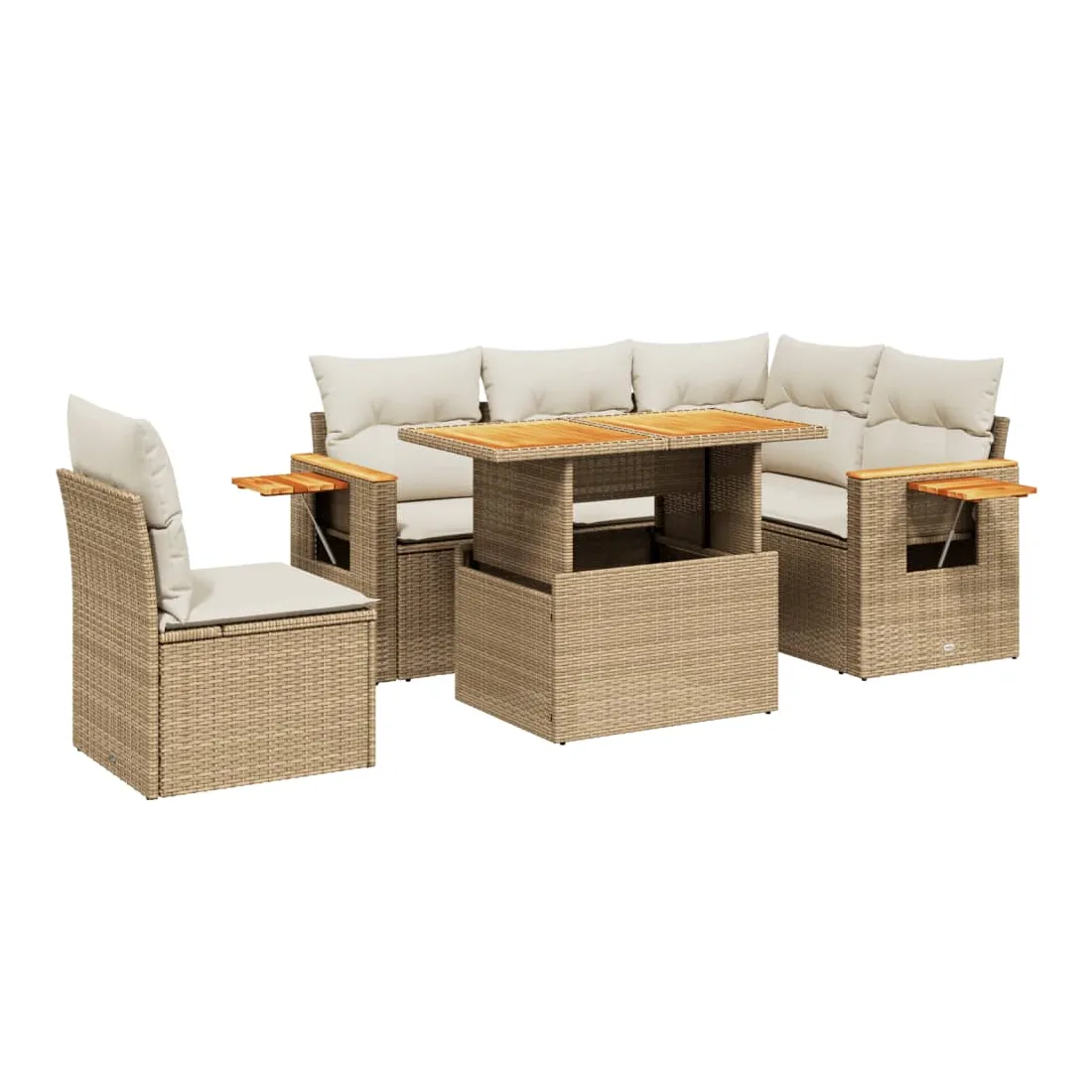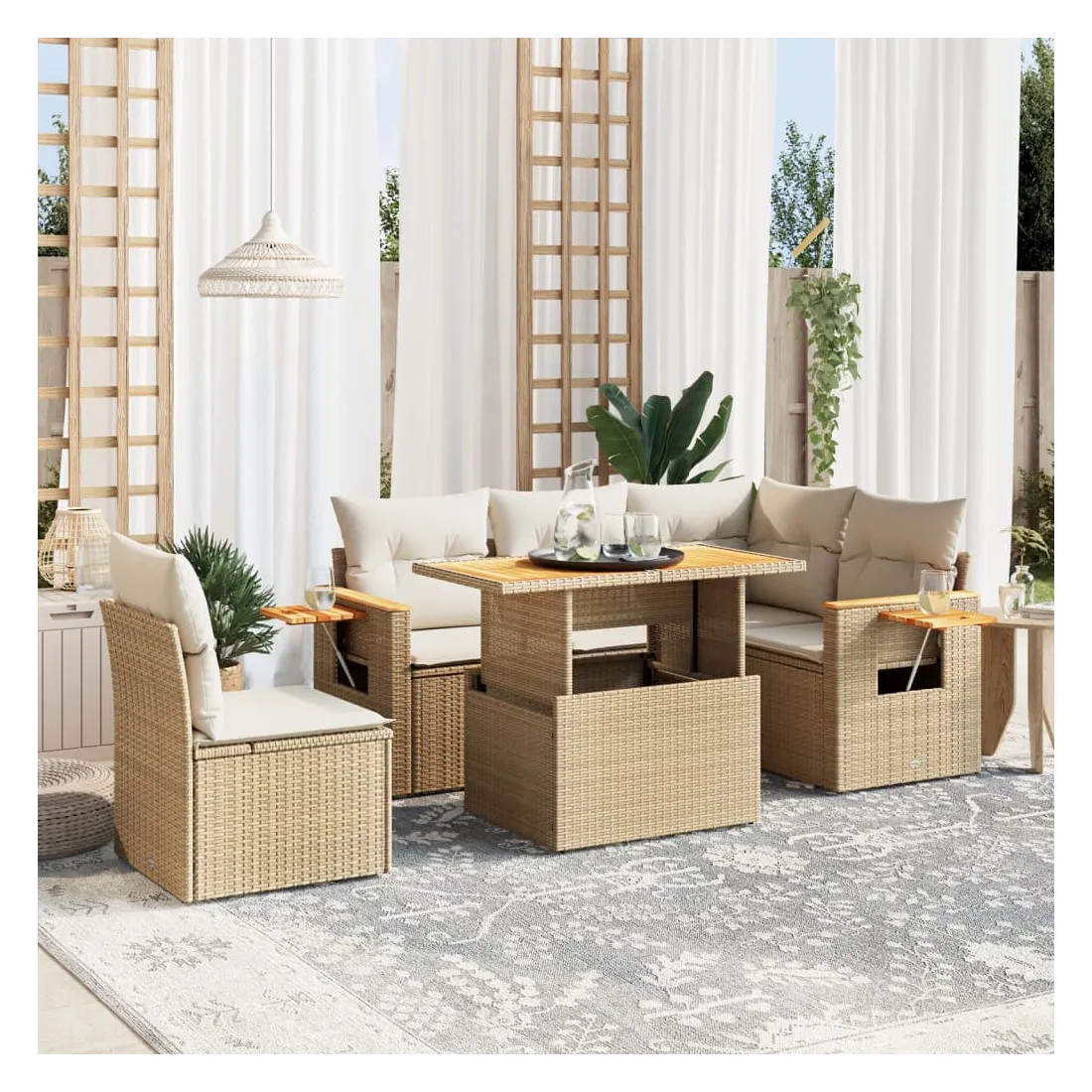 Cet ensemble de canapés de jardin est le complément parfait de votre arrière-cour, terrasse ou patio, offrant un espace confortable et accueillant pour discuter avec la famille et les amis ou simplement se détendre et profiter de l'extérieur. Matériau durable : la résine tressée, également connue sous le nom de poly rotin, est un matériau synthétique solide et nécessitant peu d'entretien qui ressemble au rotin naturel. Il est léger, facile à nettoyer et couramment utilisé pour les meubles d'extérieur en raison de sa durabilité et de ses propriétés de résistance aux intempéries.Dessus de table réglable : le dessus de table peut être soulevé pour rendre la table plus haute, ce qui transforme la table d'extérieur d'une table basse à une table de salle à manger. Elle est parfaite pour recevoir des invités ou prendre des repas à l'extérieur.Table d'appoint pratique : ce mobilier d'extérieur comprend une table d'appoint pliable avec un ressort à gaz sur les accoudoirs, offrant un endroit pratique pour garder vos essentiels à portée de main.Housse amovible et lavable : ces coussins de siège sont dotés de housses amovibles pour un lavage et un entretien faciles.Conception modulaire : cet ensemble de meubles d'extérieur a une conception modulaire, ce qui le rend complètement flexible et facile à déplacer, afin que vous puissiez créer un agencement de meubles d'extérieur personnalisé. Bon à savoir :Pour que vos meubles d'extérieur restent beaux, nous vous recommandons de les protéger avec une housse imperméable.