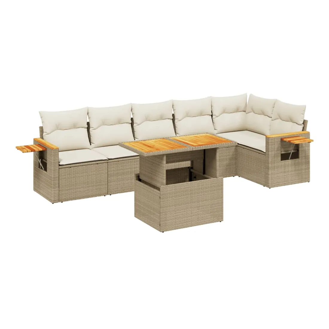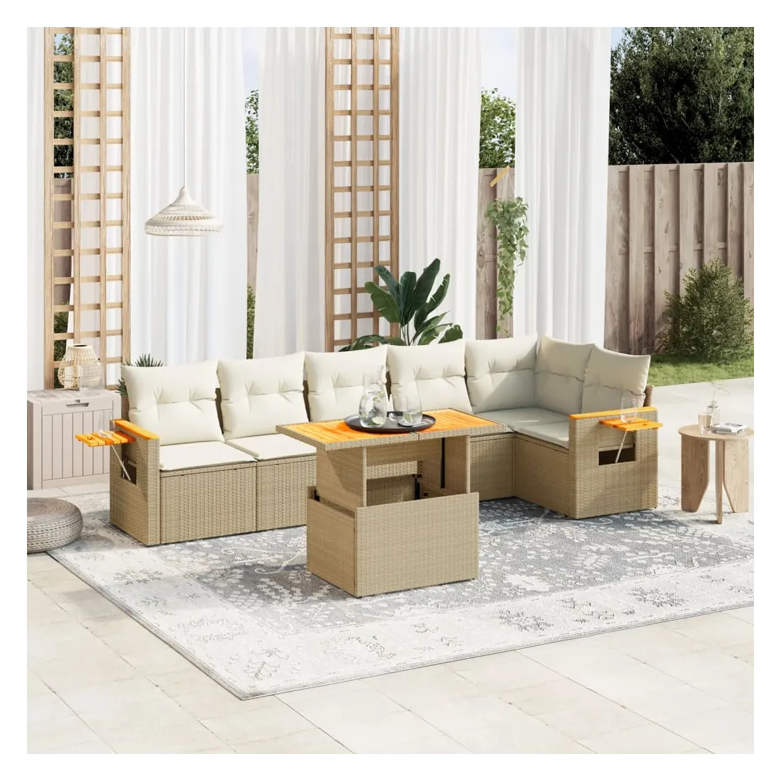 Cet ensemble de canapés de jardin est le complément parfait de votre arrière-cour, terrasse ou patio, offrant un espace confortable et accueillant pour discuter avec la famille et les amis ou simplement se détendre et profiter de l'extérieur. Matériau durable : la résine tressée, également connue sous le nom de poly rotin, est un matériau synthétique solide et nécessitant peu d'entretien qui ressemble au rotin naturel. Il est léger, facile à nettoyer et couramment utilisé pour les meubles d'extérieur en raison de sa durabilité et de ses propriétés de résistance aux intempéries.Dessus de table réglable : le dessus de table peut être soulevé pour rendre la table plus haute, ce qui transforme la table d'extérieur d'une table basse à une table de salle à manger. Elle est parfaite pour recevoir des invités ou prendre des repas à l'extérieur.Table d'appoint pratique : ce mobilier d'extérieur comprend une table d'appoint pliable avec un ressort à gaz sur les accoudoirs, offrant un endroit pratique pour garder vos essentiels à portée de main.Housse amovible et lavable : ces coussins de siège sont dotés de housses amovibles pour un lavage et un entretien faciles.Conception modulaire : cet ensemble de meubles d'extérieur a une conception modulaire, ce qui le rend complètement flexible et facile à déplacer, afin que vous puissiez créer un agencement de meubles d'extérieur personnalisé. Bon à savoir :Pour que vos meubles d'extérieur restent beaux, nous vous recommandons de les protéger avec une housse imperméable.
