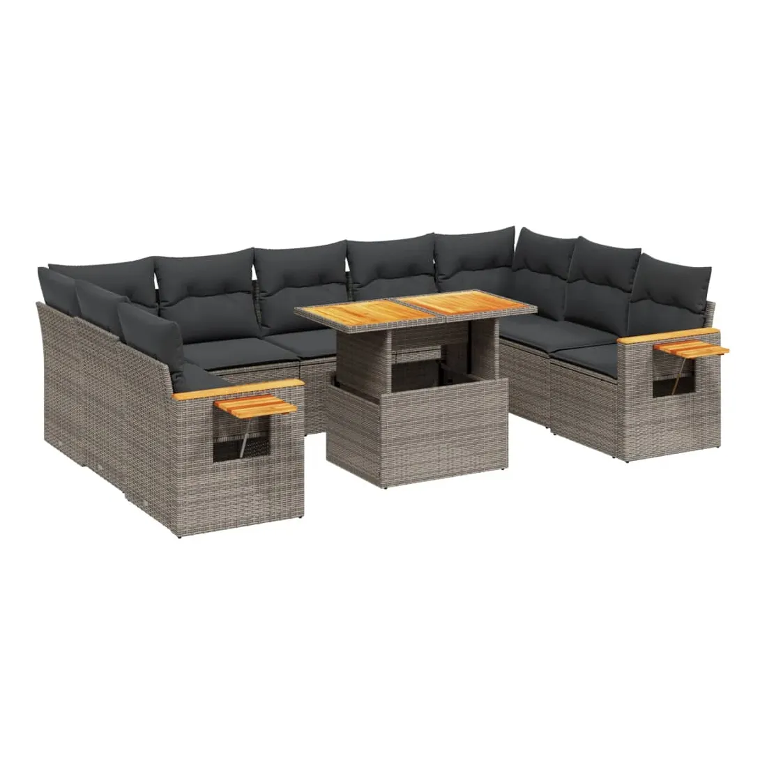 Cet ensemble de canapés de jardin est le complément parfait de votre arrière-cour, terrasse ou patio, offrant un espace confortable et accueillant pour discuter avec la famille et les amis ou simplement se détendre et profiter de l'extérieur. Matériau durable : la résine tressée, également connue sous le nom de poly rotin, est un matériau synthétique solide et nécessitant peu d'entretien qui ressemble au rotin naturel. Il est léger, facile à nettoyer et couramment utilisé pour les meubles d'extérieur en raison de sa durabilité et de ses propriétés de résistance aux intempéries.Dessus de table réglable : le dessus de table peut être soulevé pour rendre la table plus haute, ce qui transforme la table d'extérieur d'une table basse à une table de salle à manger. Elle est parfaite pour recevoir des invités ou prendre des repas à l'extérieur.Table d'appoint pratique : ce mobilier d'extérieur comprend une table d'appoint pliable avec un ressort à gaz sur les accoudoirs, offrant un endroit pratique pour garder vos essentiels à portée de main.Housse amovible et lavable : ces coussins de siège sont dotés de housses amovibles pour un lavage et un entretien faciles.Conception modulaire : cet ensemble de meubles d'extérieur a une conception modulaire, ce qui le rend complètement flexible et facile à déplacer, afin que vous puissiez créer un agencement de meubles d'extérieur personnalisé. Bon à savoir :Pour que vos meubles d'extérieur restent beaux, nous vous recommandons de les protéger avec une housse imperméable.