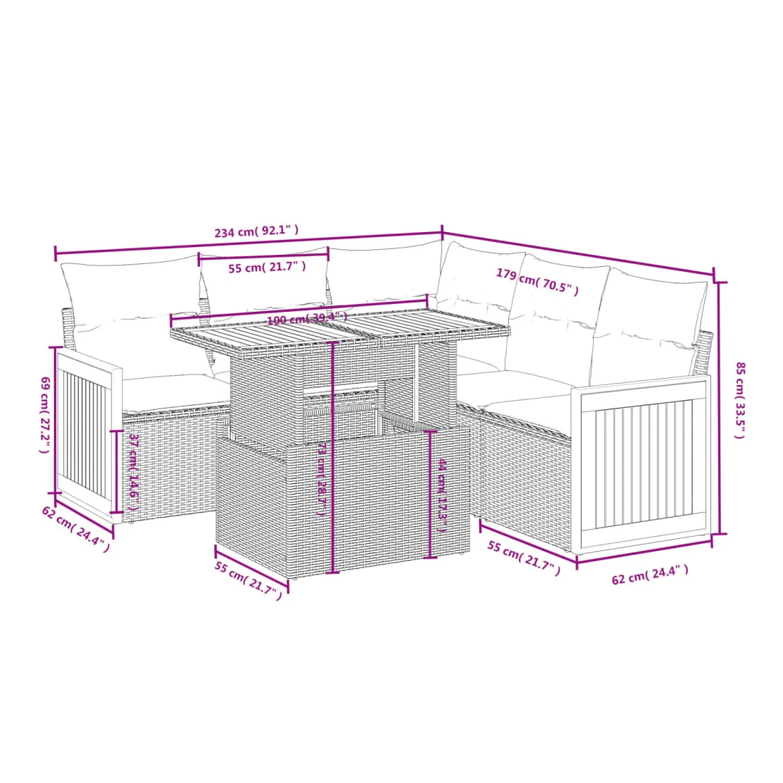 Cet ensemble de canapés de jardin est le complément parfait de votre arrière-cour, terrasse ou patio, offrant un espace confortable et accueillant pour discuter avec la famille et les amis ou simplement se détendre et profiter de l'extérieur. Matériau durable : la résine tressée, également connue sous le nom de poly rotin, est un matériau synthétique solide et nécessitant peu d'entretien qui ressemble au rotin naturel. Il est léger, facile à nettoyer et couramment utilisé pour les meubles d'extérieur en raison de sa durabilité et de ses propriétés de résistance aux intempéries.Dessus de table réglable : le dessus de table peut être soulevé pour rendre la table plus haute, ce qui transforme la table d'extérieur d'une table basse à une table de salle à manger. Elle est parfaite pour recevoir des invités ou prendre des repas à l'extérieur.Housse amovible et lavable : ces coussins de siège sont dotés de housses amovibles pour un lavage et un entretien faciles.Conception modulaire : cet ensemble de meubles d'extérieur a une conception modulaire, ce qui le rend complètement flexible et facile à déplacer, afin que vous puissiez créer un agencement de meubles d'extérieur personnalisé. Bon à savoir :Pour que vos meubles d'extérieur restent beaux, nous vous recommandons de les protéger avec une housse imperméable.