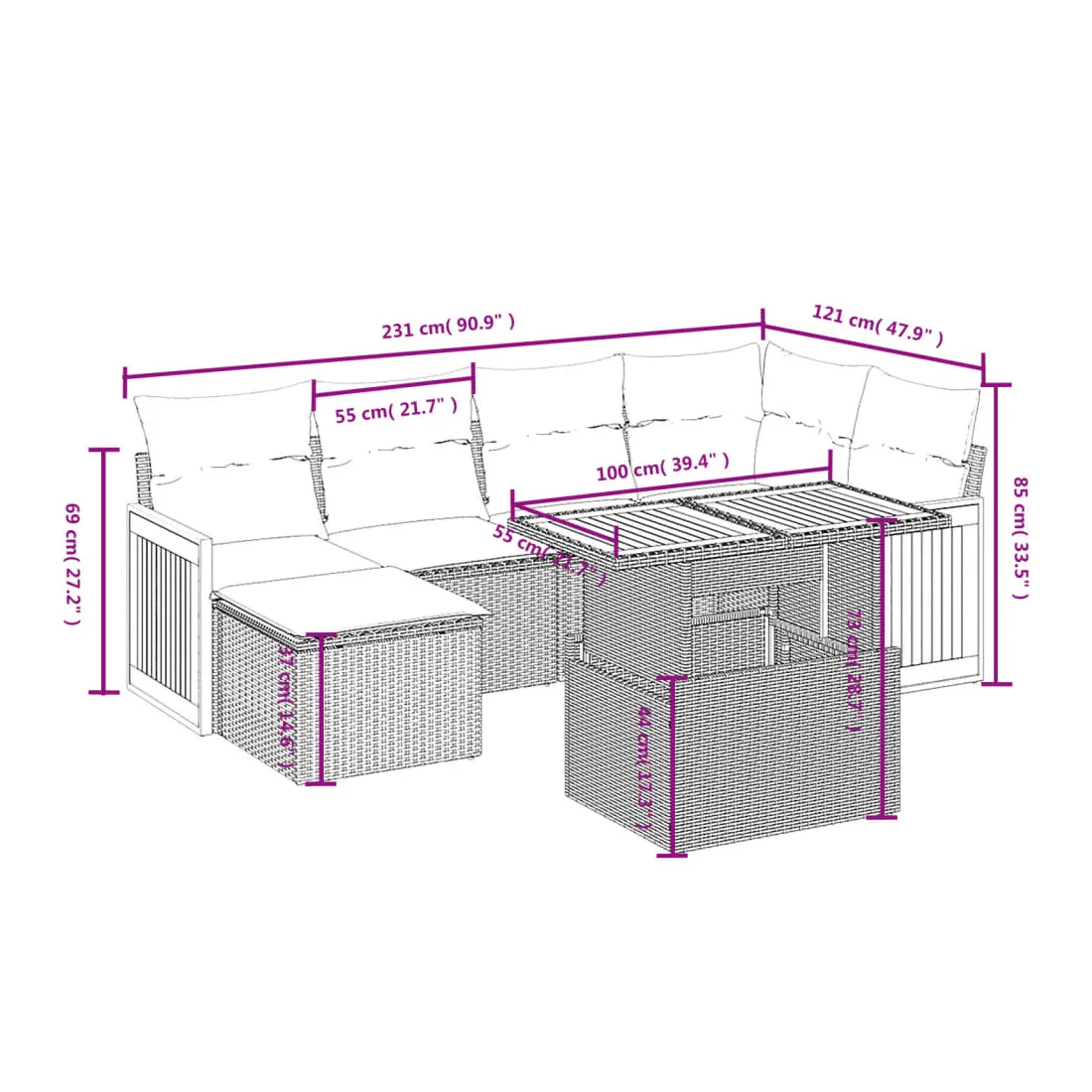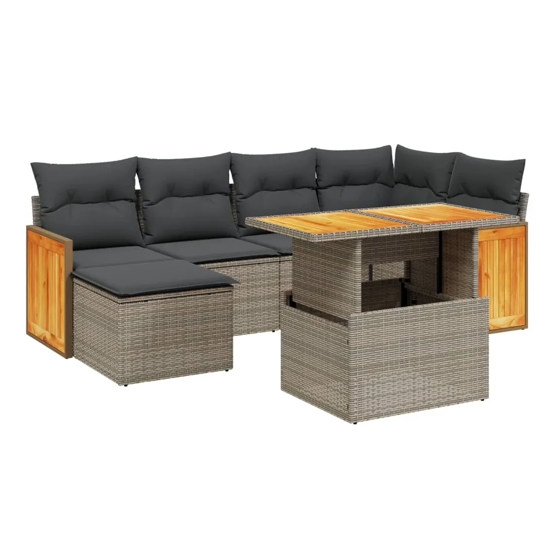 Cet ensemble de canapés de jardin est le complément parfait de votre arrière-cour, terrasse ou patio, offrant un espace confortable et accueillant pour discuter avec la famille et les amis ou simplement se détendre et profiter de l'extérieur. Matériau durable : la résine tressée, également connue sous le nom de poly rotin, est un matériau synthétique solide et nécessitant peu d'entretien qui ressemble au rotin naturel. Il est léger, facile à nettoyer et couramment utilisé pour les meubles d'extérieur en raison de sa durabilité et de ses propriétés de résistance aux intempéries.Dessus de table réglable : le dessus de table peut être soulevé pour rendre la table plus haute, ce qui transforme la table d'extérieur d'une table basse à une table de salle à manger. Elle est parfaite pour recevoir des invités ou prendre des repas à l'extérieur.Housse amovible et lavable : ces coussins de siège sont dotés de housses amovibles pour un lavage et un entretien faciles.Conception modulaire : cet ensemble de meubles d'extérieur a une conception modulaire, ce qui le rend complètement flexible et facile à déplacer, afin que vous puissiez créer un agencement de meubles d'extérieur personnalisé. Bon à savoir :Pour que vos meubles d'extérieur restent beaux, nous vous recommandons de les protéger avec une housse imperméable.
