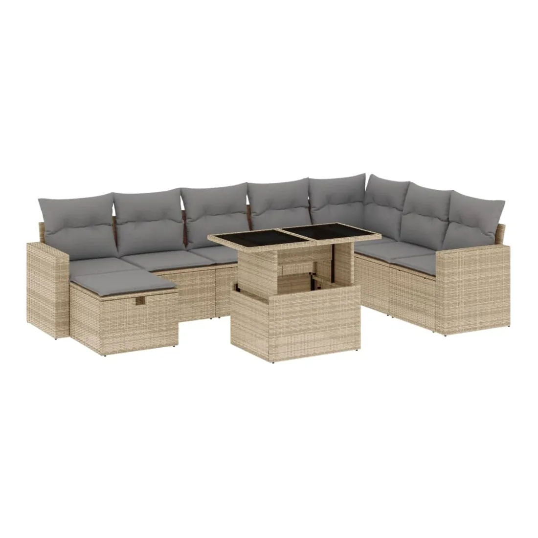 Cet ensemble de canapés de jardin est le complément parfait de votre arrière-cour, terrasse ou patio, offrant un espace confortable et accueillant pour discuter avec la famille et les amis ou simplement se détendre et profiter de l'extérieur. Matériau durable : la résine tressée, également connue sous le nom de poly rotin, est un matériau synthétique solide et nécessitant peu d'entretien qui ressemble au rotin naturel. Il est léger, facile à nettoyer et couramment utilisé pour les meubles d'extérieur en raison de sa durabilité et de ses propriétés de résistance aux intempéries.Dessus de table réglable : le dessus de table peut être soulevé pour rendre la table plus haute, ce qui transforme la table d'extérieur d'une table basse à une table de salle à manger. Elle est parfaite pour recevoir des invités ou prendre des repas à l'extérieur.Housse amovible et lavable : ces coussins de siège sont dotés de housses amovibles pour un lavage et un entretien faciles.Conception modulaire : cet ensemble de meubles d'extérieur a une conception modulaire, ce qui le rend complètement flexible et facile à déplacer, afin que vous puissiez créer un agencement de meubles d'extérieur personnalisé. Bon à savoir :Pour que vos meubles d'extérieur restent beaux, nous vous recommandons de les protéger avec une housse imperméable.