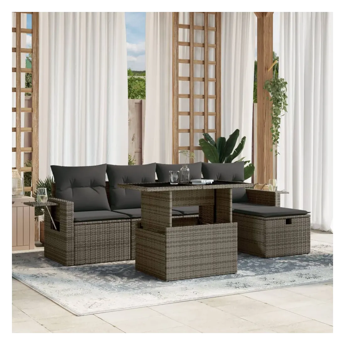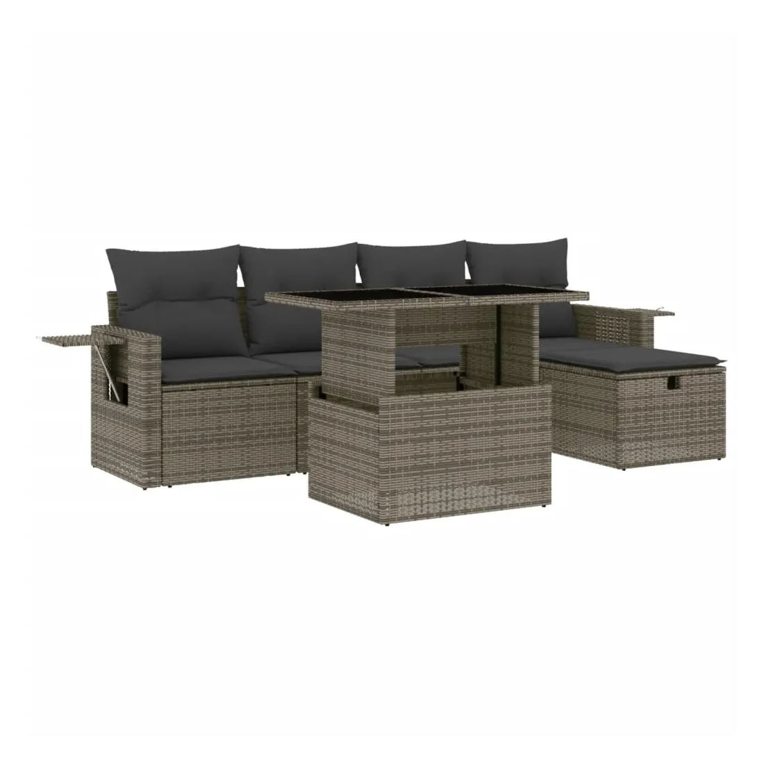 Cet ensemble de canapés de jardin est le complément parfait de votre arrière-cour, terrasse ou patio, offrant un espace confortable et accueillant pour discuter avec la famille et les amis ou simplement se détendre et profiter de l'extérieur. Matériau durable : la résine tressée, également connue sous le nom de poly rotin, est un matériau synthétique solide et nécessitant peu d'entretien qui ressemble au rotin naturel. Il est léger, facile à nettoyer et couramment utilisé pour les meubles d'extérieur en raison de sa durabilité et de ses propriétés de résistance aux intempéries.Dessus de table réglable : le dessus de table peut être soulevé pour rendre la table plus haute, ce qui transforme la table d'extérieur d'une table basse à une table de salle à manger. Elle est parfaite pour recevoir des invités ou prendre des repas à l'extérieur.Housse amovible et lavable : ces coussins de siège sont dotés de housses amovibles pour un lavage et un entretien faciles.Conception modulaire : cet ensemble de meubles d'extérieur a une conception modulaire, ce qui le rend complètement flexible et facile à déplacer, afin que vous puissiez créer un agencement de meubles d'extérieur personnalisé. Bon à savoir :Pour que vos meubles d'extérieur restent beaux, nous vous recommandons de les protéger avec une housse imperméable.