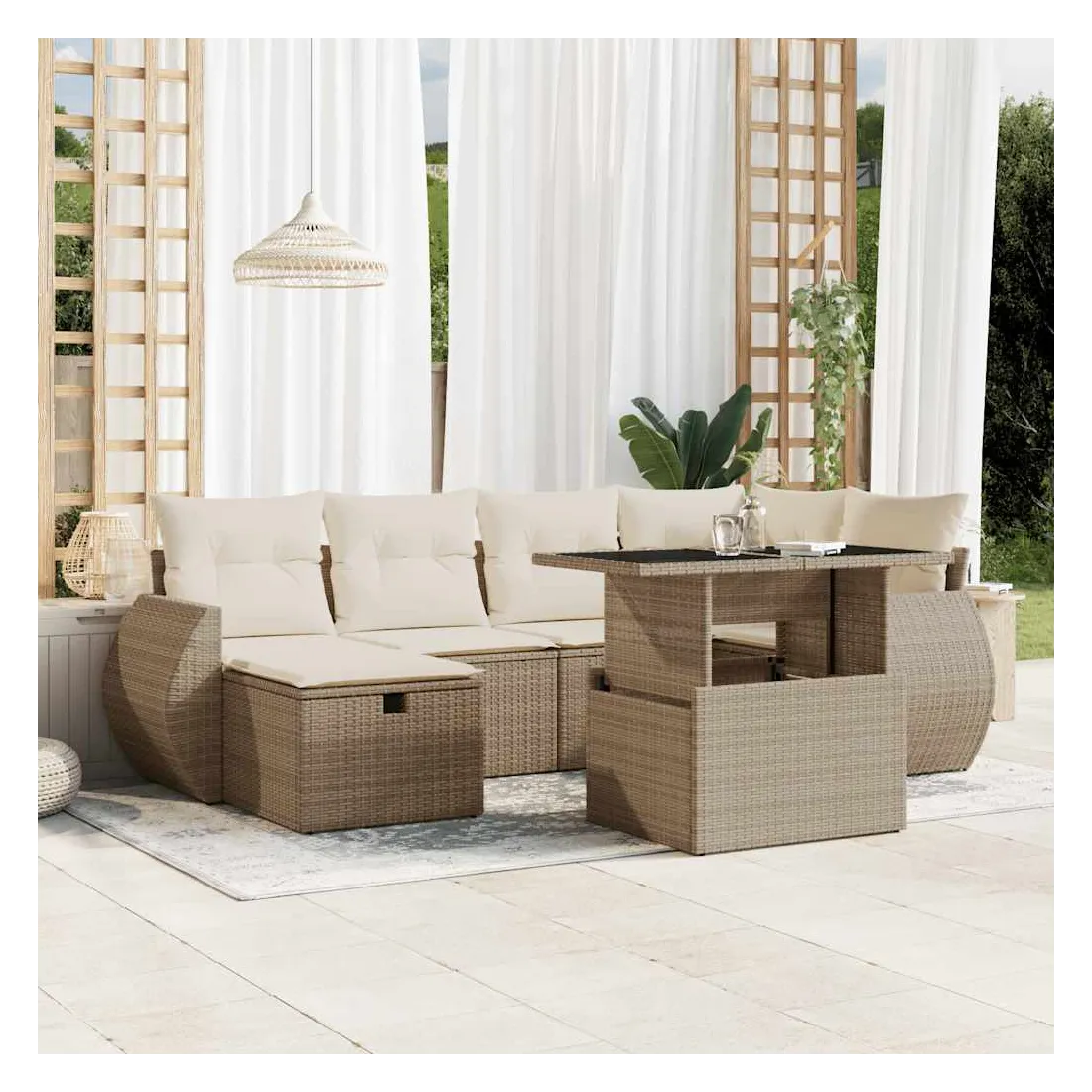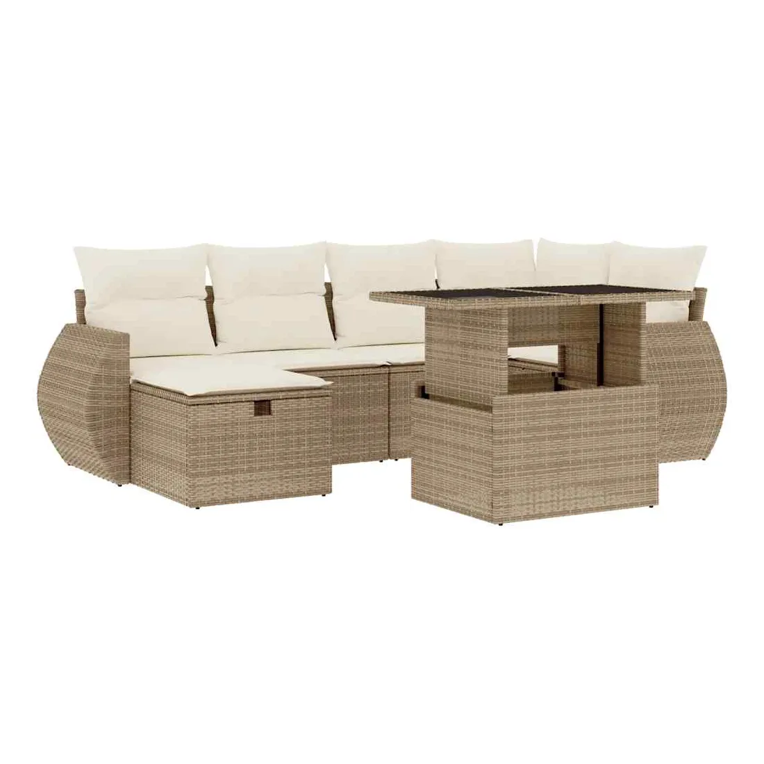 Cet ensemble de canapés de jardin est le complément parfait de votre arrière-cour, terrasse ou patio, offrant un espace confortable et accueillant pour discuter avec la famille et les amis ou simplement se détendre et profiter de l'extérieur. Matériau durable : la résine tressée, également connue sous le nom de poly rotin, est un matériau synthétique solide et nécessitant peu d'entretien qui ressemble au rotin naturel. Il est léger, facile à nettoyer et couramment utilisé pour les meubles d'extérieur en raison de sa durabilité et de ses propriétés de résistance aux intempéries.Dessus de table réglable : le dessus de table peut être soulevé pour rendre la table plus haute, ce qui transforme la table d'extérieur d'une table basse à une table de salle à manger. Elle est parfaite pour recevoir des invités ou prendre des repas à l'extérieur.Dessus en verre : le dessus de la table d'extérieur est fabriqué en verre trempé solide et durable, ce qui le rend facile à nettoyer avec un chiffon humide et ajoute une touche d'élégance à votre espace extérieur.Housse amovible et lavable : ces coussins de siège sont dotés de housses amovibles pour un lavage et un entretien faciles.Conception modulaire : cet ensemble de meubles d'extérieur a une conception modulaire, ce qui le rend complètement flexible et facile à déplacer, afin que vous puissiez créer un agencement de meubles d'extérieur personnalisé. Bon à savoir :Pour que vos meubles d'extérieur restent beaux, nous vous recommandons de les protéger avec une housse imperméable.