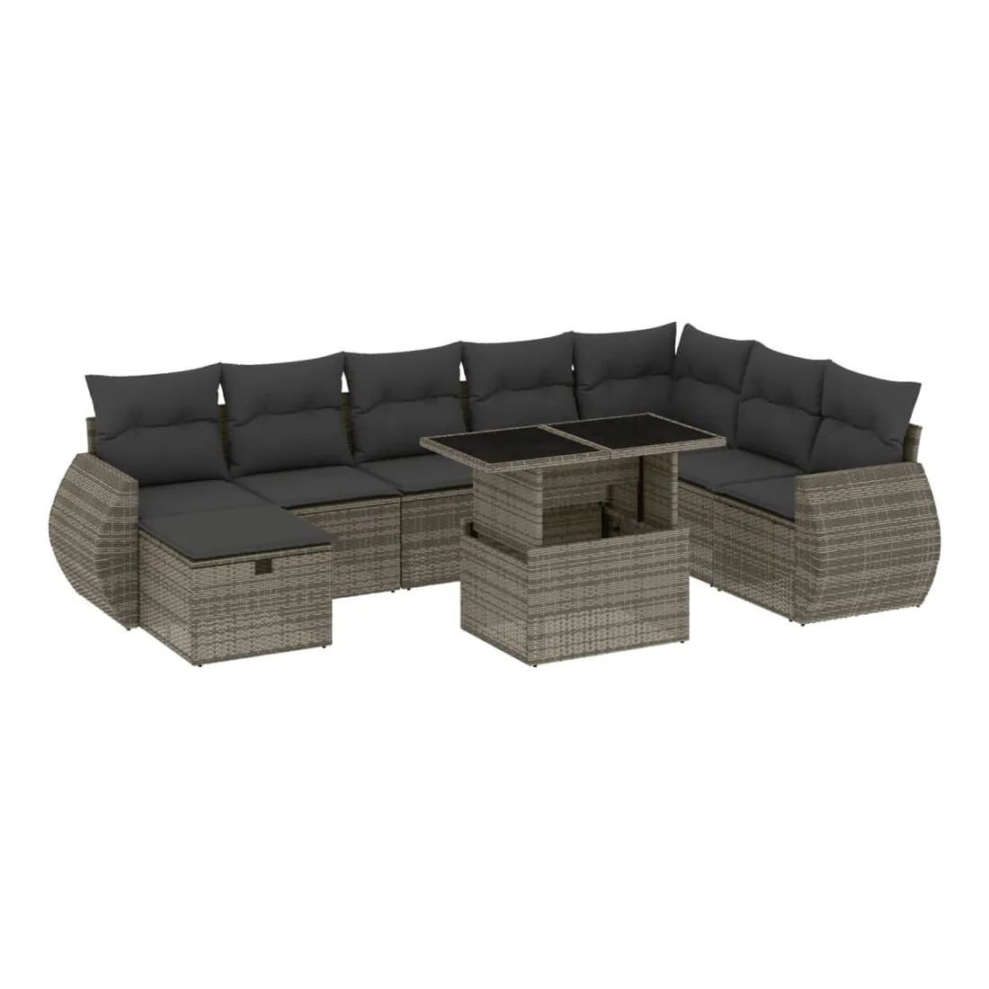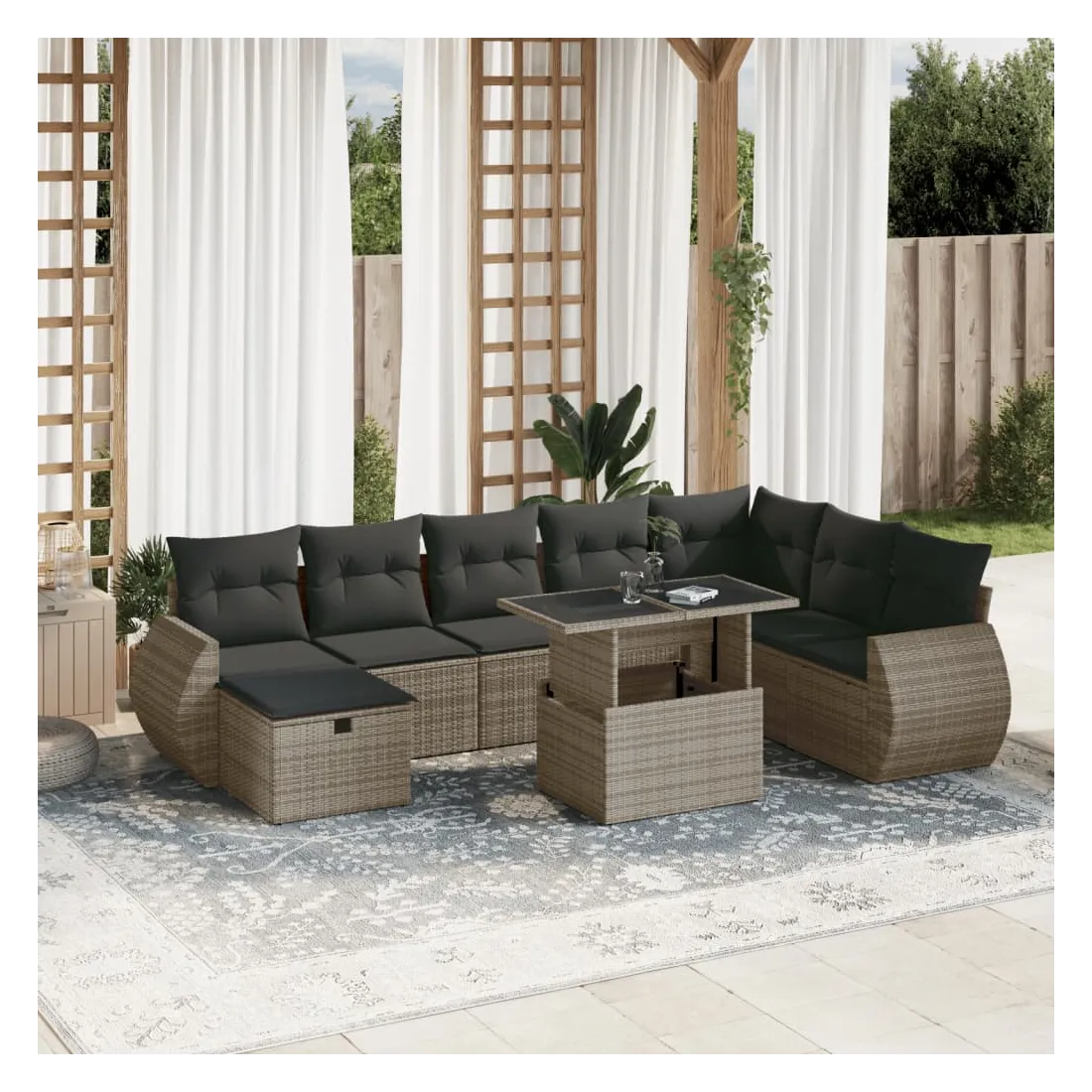 Cet ensemble de canapés de jardin est le complément parfait de votre arrière-cour, terrasse ou patio, offrant un espace confortable et accueillant pour discuter avec la famille et les amis ou simplement se détendre et profiter de l'extérieur. Matériau durable : la résine tressée, également connue sous le nom de poly rotin, est un matériau synthétique solide et nécessitant peu d'entretien qui ressemble au rotin naturel. Il est léger, facile à nettoyer et couramment utilisé pour les meubles d'extérieur en raison de sa durabilité et de ses propriétés de résistance aux intempéries.Dessus de table réglable : le dessus de table peut être soulevé pour rendre la table plus haute, ce qui transforme la table d'extérieur d'une table basse à une table de salle à manger. Elle est parfaite pour recevoir des invités ou prendre des repas à l'extérieur.Dessus en verre : le dessus de la table d'extérieur est fabriqué en verre trempé solide et durable, ce qui le rend facile à nettoyer avec un chiffon humide et ajoute une touche d'élégance à votre espace extérieur.Housse amovible et lavable : ces coussins de siège sont dotés de housses amovibles pour un lavage et un entretien faciles.Conception modulaire : cet ensemble de meubles d'extérieur a une conception modulaire, ce qui le rend complètement flexible et facile à déplacer, afin que vous puissiez créer un agencement de meubles d'extérieur personnalisé. Bon à savoir :Pour que vos meubles d'extérieur restent beaux, nous vous recommandons de les protéger avec une housse imperméable.