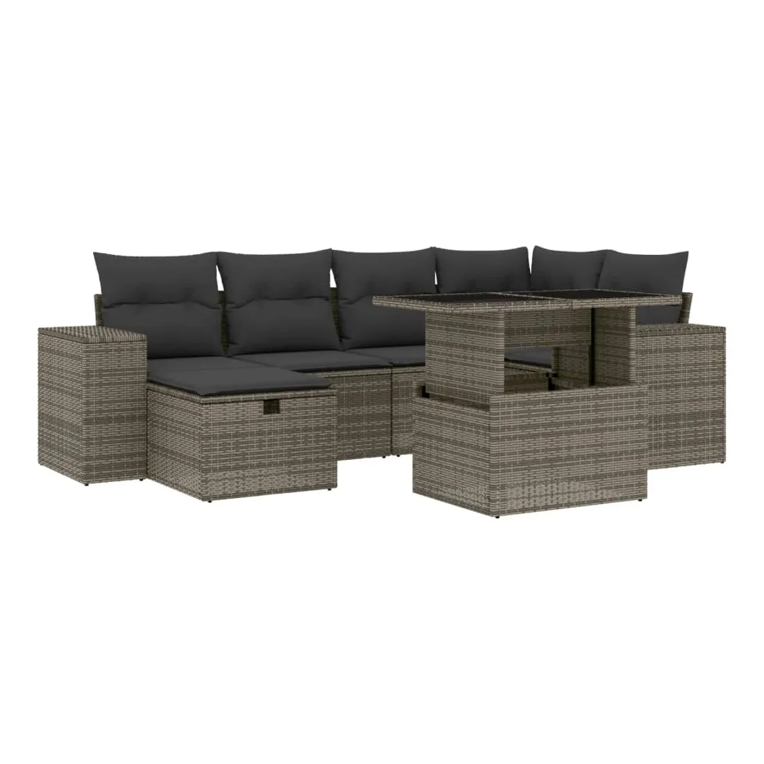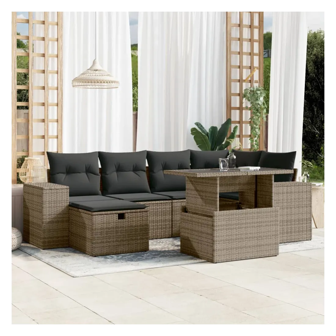 Cet ensemble de canapés de jardin est le complément parfait de votre arrière-cour, terrasse ou patio, offrant un espace confortable et accueillant pour discuter avec la famille et les amis ou simplement se détendre et profiter de l'extérieur. Matériau durable : la résine tressée, également connue sous le nom de poly rotin, est un matériau synthétique solide et nécessitant peu d'entretien qui ressemble au rotin naturel. Il est léger, facile à nettoyer et couramment utilisé pour les meubles d'extérieur en raison de sa durabilité et de ses propriétés de résistance aux intempéries.Dessus de table réglable : le dessus de table peut être soulevé pour rendre la table plus haute, ce qui transforme la table d'extérieur d'une table basse à une table de salle à manger. Elle est parfaite pour recevoir des invités ou prendre des repas à l'extérieur.Dessus en verre : le dessus de la table d'extérieur est fabriqué en verre trempé solide et durable, ce qui le rend facile à nettoyer avec un chiffon humide et ajoute une touche d'élégance à votre espace extérieur.Housse amovible et lavable : ces coussins de siège sont dotés de housses amovibles pour un lavage et un entretien faciles.Conception modulaire : cet ensemble de meubles d'extérieur a une conception modulaire, ce qui le rend complètement flexible et facile à déplacer, afin que vous puissiez créer un agencement de meubles d'extérieur personnalisé. Bon à savoir :Pour que vos meubles d'extérieur restent beaux, nous vous recommandons de les protéger avec une housse imperméable.