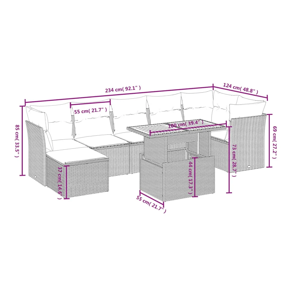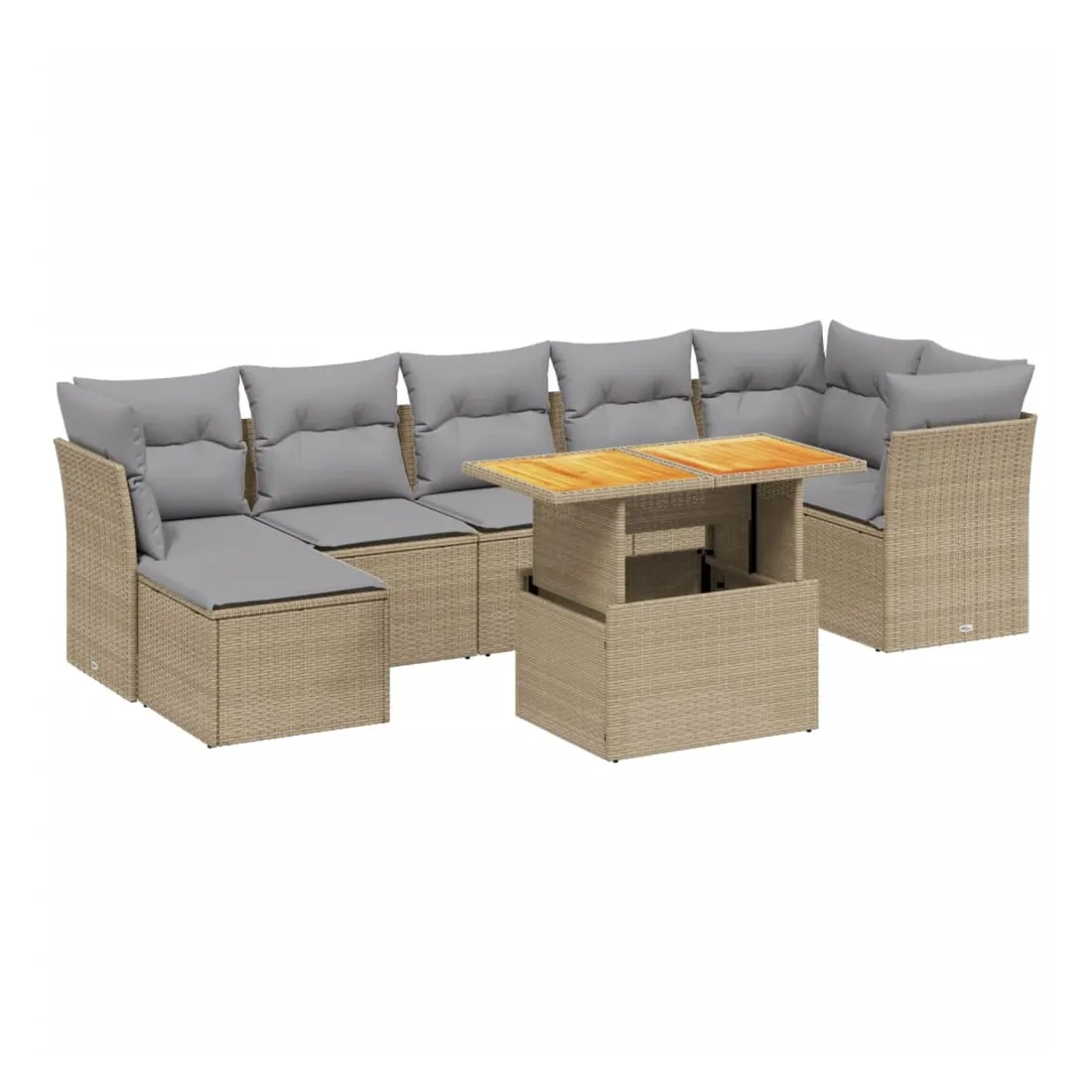Cet ensemble de canapés de jardin est le complément parfait de votre arrière-cour, terrasse ou patio, offrant un espace confortable et accueillant pour discuter avec la famille et les amis ou simplement se détendre et profiter de l'extérieur. Matériau durable : la résine tressée, également connue sous le nom de poly rotin, est un matériau synthétique solide et nécessitant peu d'entretien qui ressemble au rotin naturel. Il est léger, facile à nettoyer et couramment utilisé pour les meubles d'extérieur en raison de sa durabilité et de ses propriétés de résistance aux intempéries.Dessus de table réglable : le dessus de table peut être soulevé pour rendre la table plus haute, ce qui transforme la table d'extérieur d'une table basse à une table de salle à manger. Elle est parfaite pour recevoir des invités ou prendre des repas à l'extérieur.Housse amovible et lavable : ces coussins de siège sont dotés de housses amovibles pour un lavage et un entretien faciles.Conception modulaire : cet ensemble de meubles d'extérieur a une conception modulaire, ce qui le rend complètement flexible et facile à déplacer, afin que vous puissiez créer un agencement de meubles d'extérieur personnalisé. Bon à savoir :Pour que vos meubles d'extérieur restent beaux, nous vous recommandons de les protéger avec une housse imperméable.