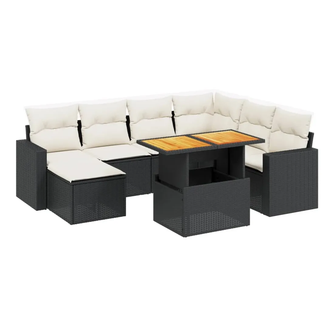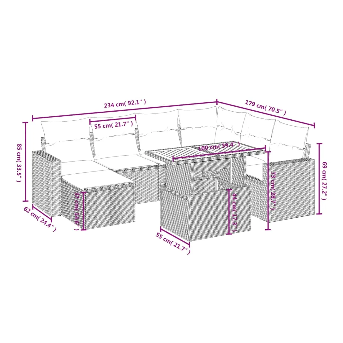 Cet ensemble de canapés de jardin est le complément parfait de votre arrière-cour, terrasse ou patio, offrant un espace confortable et accueillant pour discuter avec la famille et les amis ou simplement se détendre et profiter de l'extérieur. Matériau durable : la résine tressée, également connue sous le nom de poly rotin, est un matériau synthétique solide et nécessitant peu d'entretien qui ressemble au rotin naturel. Il est léger, facile à nettoyer et couramment utilisé pour les meubles d'extérieur en raison de sa durabilité et de ses propriétés de résistance aux intempéries.Dessus de table réglable : le dessus de table peut être soulevé pour rendre la table plus haute, ce qui transforme la table d'extérieur d'une table basse à une table de salle à manger. Elle est parfaite pour recevoir des invités ou prendre des repas à l'extérieur.Housse amovible et lavable : ces coussins de siège sont dotés de housses amovibles pour un lavage et un entretien faciles.Conception modulaire : cet ensemble de meubles d'extérieur a une conception modulaire, ce qui le rend complètement flexible et facile à déplacer, afin que vous puissiez créer un agencement de meubles d'extérieur personnalisé. Bon à savoir :Pour que vos meubles d'extérieur restent beaux, nous vous recommandons de les protéger avec une housse imperméable.