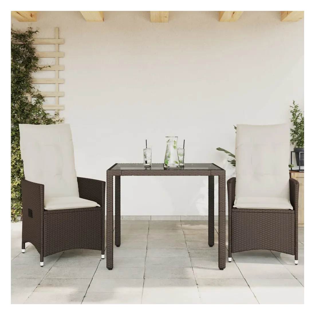 Savourez un café ou discutez avec votre famille et vos amis dans le jardin, l'arrière-cour ou sur le balcon avec cet ensemble de bistro confortable ! Matériau durable : la résine tressée, également connue sous le nom de poly rotin, est un matériau synthétique solide et nécessitant peu d'entretien qui ressemble au rotin naturel. Il est léger, facile à nettoyer et couramment utilisé pour les meubles d'extérieur en raison de sa durabilité et de ses propriétés de résistance aux intempéries.Dossier réglable : ce siège de jardin est doté d'une poignée. Vous pouvez régler le dossier dans n'importe quelle position en tirant sur la poignée et le remettre rapidement dans sa position initiale.Dessus en verre : le dessus de la table d'extérieur est fabriqué en verre trempé solide et durable, ce qui le rend facile à nettoyer avec un chiffon humide et ajoute une touche d'élégance à votre espace extérieur.Expérience d'assise confortable : cet ensemble de meubles d'extérieur, doté de coussins épais, offre une expérience d'assise confortable.Housse amovible et lavable : ces coussins de siège sont dotés de housses amovibles pour un lavage et un entretien faciles. Les coussins de dossier ont un rabat à l'arrière pour une fixation facile aux dossiers. Bon à savoir :Pour que vos meubles d'extérieur restent beaux, nous vous recommandons de les protéger avec une housse imperméable.