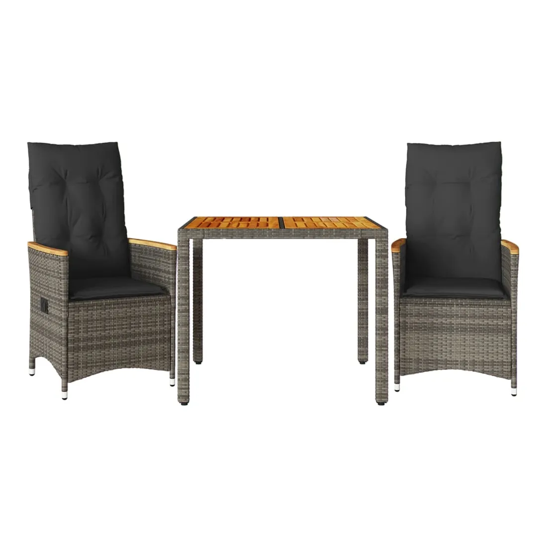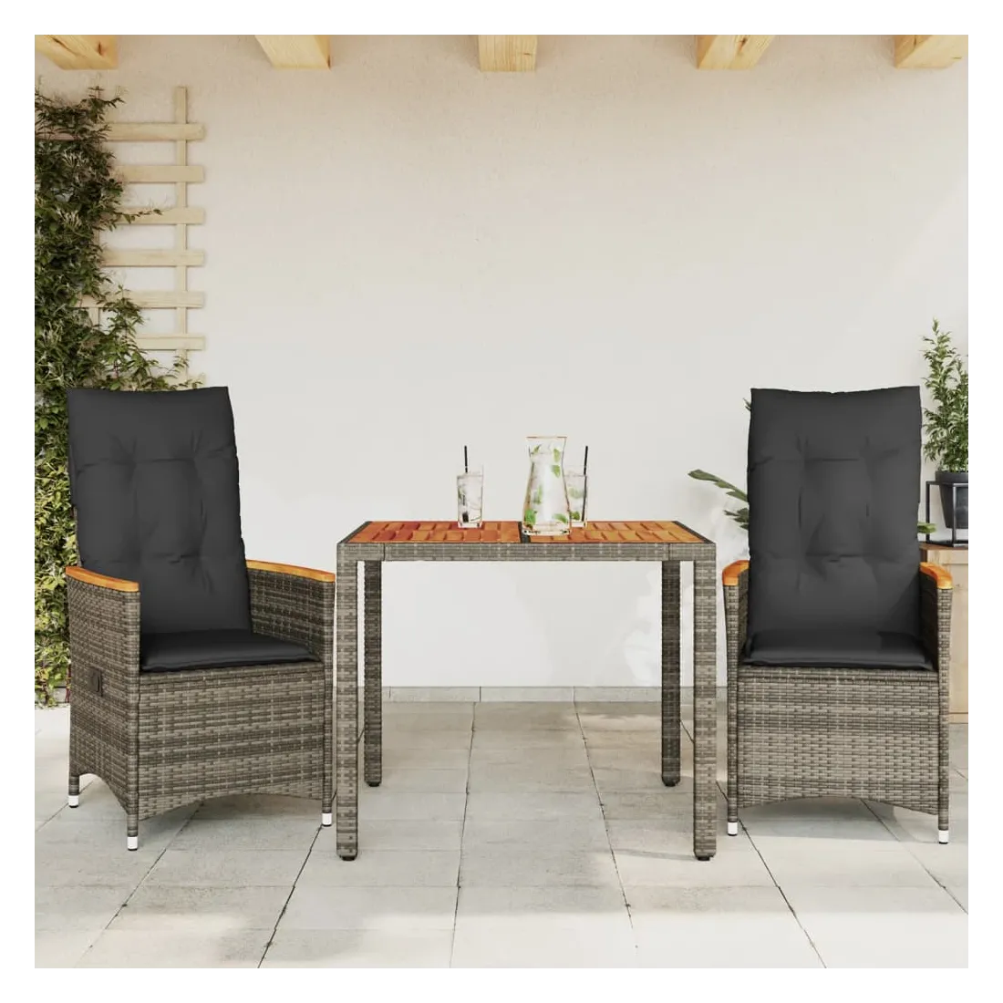 Savourez un café ou discutez avec votre famille et vos amis dans le jardin, l'arrière-cour ou sur le balcon avec cet ensemble de bistro confortable ! Matériau durable : la résine tressée, également connue sous le nom de poly rotin, est un matériau synthétique solide et nécessitant peu d'entretien qui ressemble au rotin naturel. Il est léger, facile à nettoyer et couramment utilisé pour les meubles d'extérieur en raison de sa durabilité et de ses propriétés de résistance aux intempéries.Dossier réglable : ce siège de jardin est doté d'une poignée. Vous pouvez régler le dossier dans n'importe quelle position en tirant sur la poignée et le remettre rapidement dans sa position initiale.Dessus stable et facile à nettoyer : cette table de jardin a un dessus en bois d'acacia robuste, durable et facile à nettoyer avec un chiffon humide.Expérience d'assise confortable : cet ensemble de meubles d'extérieur, doté de coussins épais, offre une expérience d'assise confortable.Housse amovible et lavable : ces coussins de siège sont dotés de housses amovibles pour un lavage et un entretien faciles. Les coussins de dossier ont un rabat à l'arrière pour une fixation facile aux dossiers. Bon à savoir :Pour que vos meubles d'extérieur restent beaux, nous vous recommandons de les protéger avec une housse imperméable.