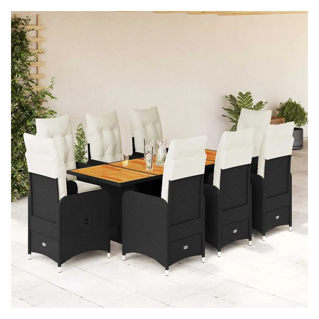 Savourez un café ou discutez avec votre famille et vos amis dans le jardin, l'arrière-cour ou sur le balcon avec cet ensemble de bistro confortable ! Matériau durable : la résine tressée, également connue sous le nom de poly rotin, est un matériau synthétique solide et nécessitant peu d'entretien qui ressemble au rotin naturel. Elle est légère, facile à nettoyer et couramment utilisée pour les meubles d'extérieur en raison de sa durabilité et de ses propriétés de résistance aux intempéries.Dossier réglable : ce siège de jardin est doté d'une poignée. Vous pouvez régler le dossier dans n'importe quelle position en tirant sur la poignée et le remettre rapidement dans sa position initiale.Expérience d'assise confortable : ce mobilier d'extérieur, doté de coussins épais, offre une expérience d'assise confortable.Housse amovible et lavable : ces coussins de siège sont dotés de housses amovibles pour un lavage et un entretien faciles. Les coussins de dossier ont un rabat à l'arrière pour une fixation facile aux dossiers.Dessus stable et facile à nettoyer : cette table de jardin a un dessus en bois d'acacia robuste, durable et facile à nettoyer avec un chiffon humide. Bon à savoir :Pour que vos meubles d'extérieur restent beaux, nous vous recommandons de les protéger avec une housse imperméable.