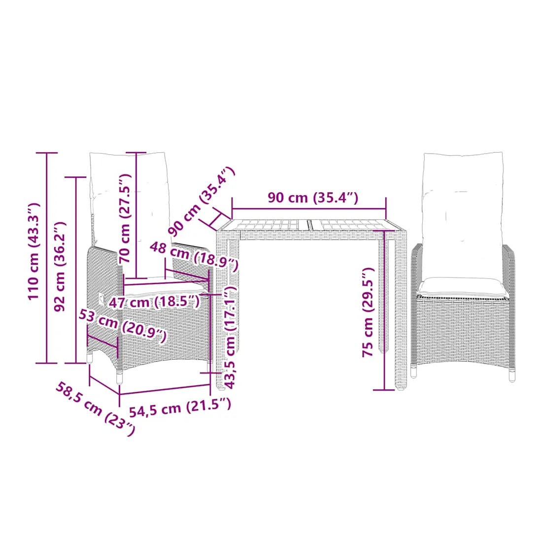 Savourez un café ou discutez avec votre famille et vos amis dans le jardin, l'arrière-cour ou sur le balcon avec cet ensemble de bistro confortable ! Matériau durable : la résine tressée, également connue sous le nom de poly rotin, est un matériau synthétique solide et nécessitant peu d'entretien qui ressemble au rotin naturel. Elle est légère, facile à nettoyer et couramment utilisée pour les meubles d'extérieur en raison de sa durabilité et de ses propriétés de résistance aux intempéries.Dossier réglable : ce siège de jardin est doté d'une poignée. Vous pouvez régler le dossier dans n'importe quelle position en tirant sur la poignée et le remettre rapidement dans sa position initiale.Expérience d'assise confortable : ce mobilier d'extérieur, doté de coussins épais, offre une expérience d'assise confortable.Housse amovible et lavable : ces coussins de siège sont dotés de housses amovibles pour un lavage et un entretien faciles. Les coussins de dossier ont un rabat à l'arrière pour une fixation facile aux dossiers.Dessus stable et facile à nettoyer : cette table de jardin a un dessus en bois d'acacia robuste, durable et facile à nettoyer avec un chiffon humide. Bon à savoir :Pour que vos meubles d'extérieur restent beaux, nous vous recommandons de les protéger avec une housse imperméable.