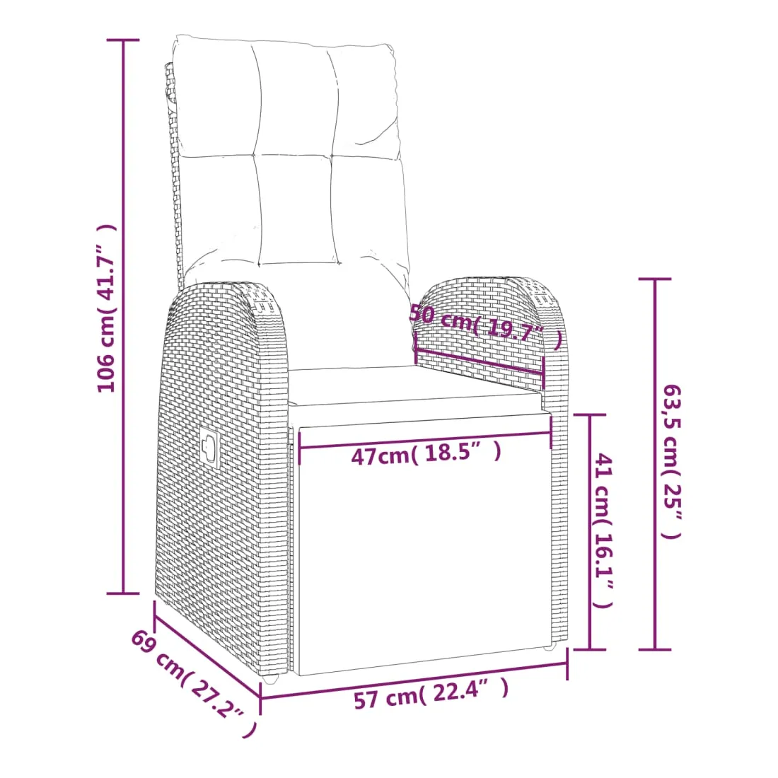 - Dimensions en position assise : 57 x 69 x 106 cm (l x P x H)