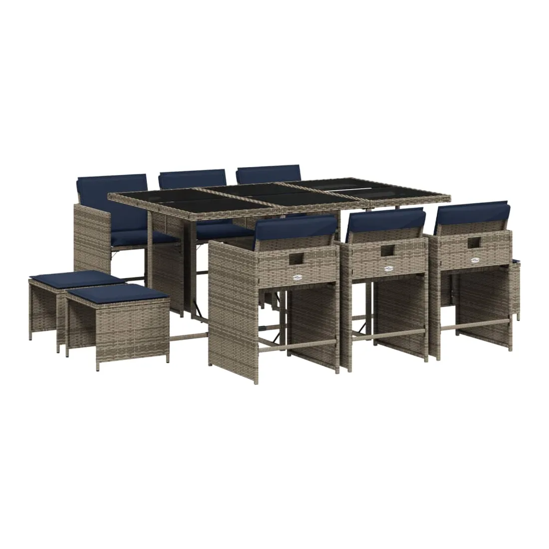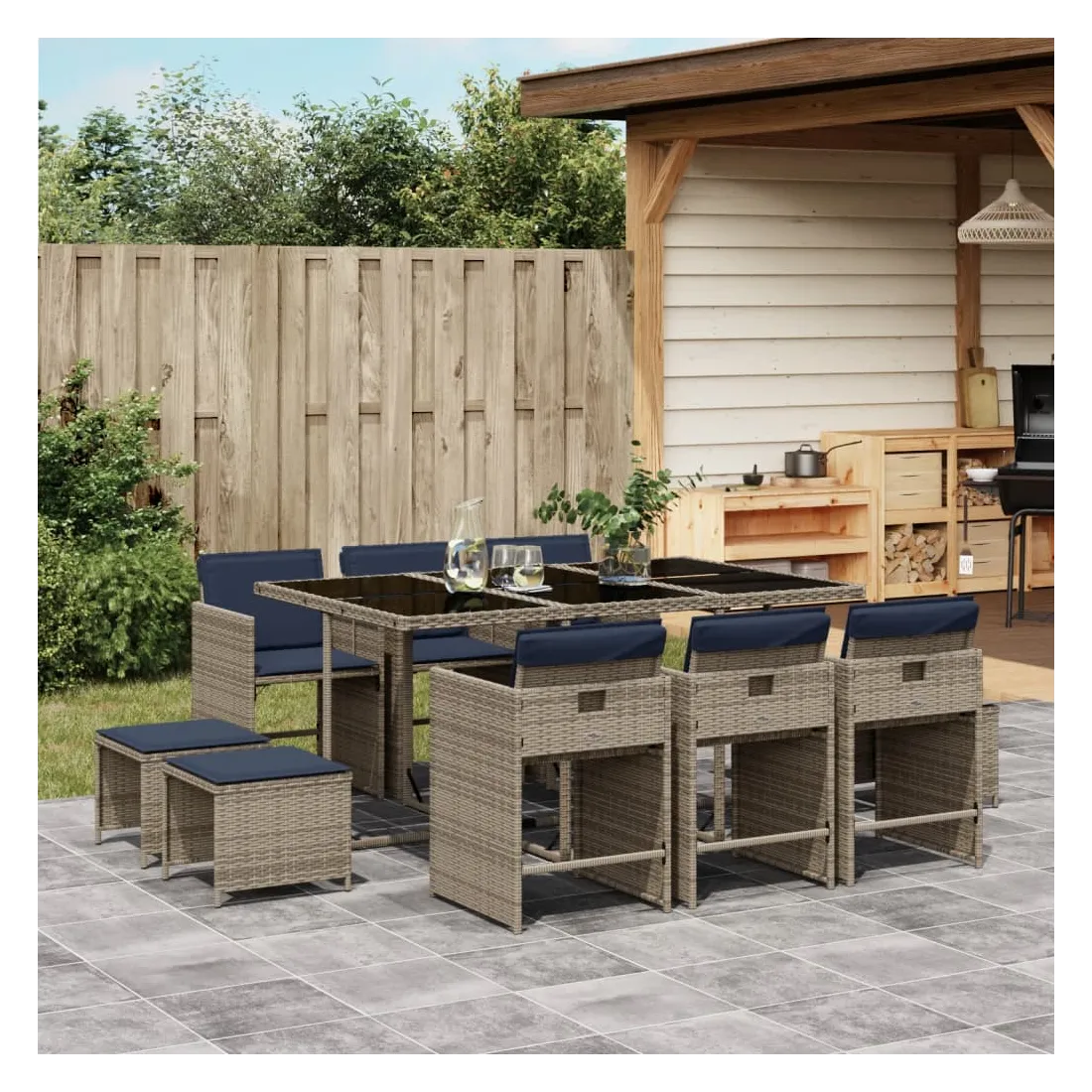 Cet ensemble de salle à manger de jardin est un excellent choix pour les repas en plein air ou pour vous détendre dans le jardin, dans l'arrière-cour ou sur la terrasse. Matériau durable : la résine tressée, également connue sous le nom de poly rotin, est un matériau synthétique solide et nécessitant peu d'entretien qui ressemble au rotin naturel. Elle est légère, facile à nettoyer et couramment utilisée pour les meubles d'extérieur en raison de sa durabilité et de ses propriétés de résistance aux intempéries.Rangement compact : ces chaises sont dotées d'un dossier rabattable, ce qui permet de les ranger facilement sous la table. Une fois pliées, elles se rangent parfaitement sous la table, formant un cube peu encombrant. De plus, les tabourets peuvent également être rangés sous les chaises, maximisant encore davantage l'efficacité de l'espace.Expérience d'assise confortable : ce mobilier d'extérieur, doté de coussins épais, offre une expérience d'assise confortable.Housse amovible et lavable : ces coussins de siège sont dotés de housses amovibles pour un lavage et un entretien faciles. Les housses de coussin de chaise ont un rabat à l'arrière pour une fixation facile aux chaises.Dessus stable et facile à nettoyer : cette table de jardin est dotée d'un dessus en verre trempé robuste, durable et facile à nettoyer à l'aide d'un chiffon humide. Bon à savoir : Pour que vos meubles d'extérieur restent beaux, nous vous recommandons de les protéger avec une housse imperméable.