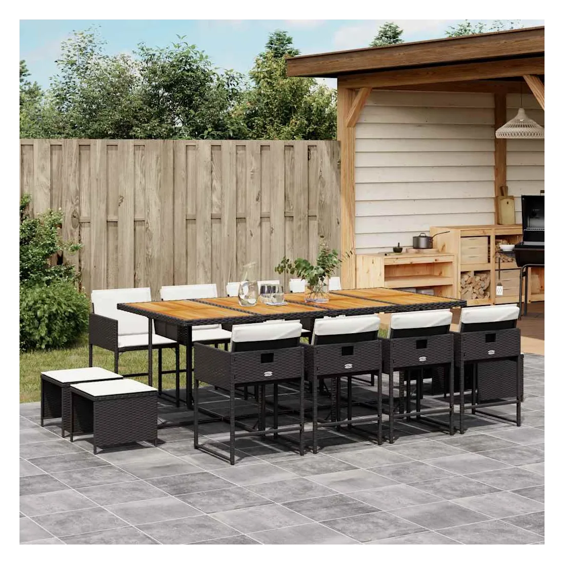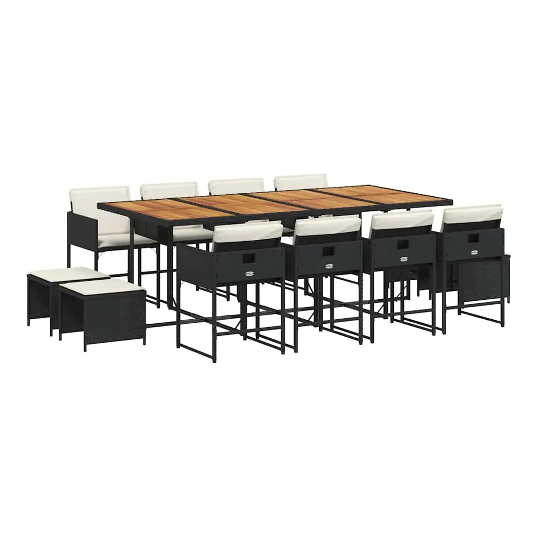 vidaXLCet ensemble de salle à manger de jardin est un excellent choix pour les repas en plein air ou pour vous détendre dans le jardin, dans l'arrière-cour ou sur la terrasse. Matériau durable : la résine tressée, également connue sous le nom de poly rotin, est un matériau synthétique solide et nécessitant peu d'entretien qui ressemble au rotin naturel. Il est léger, facile à nettoyer et couramment utilisé pour les meubles d'extérieur en raison de sa durabilité et de ses propriétés de résistance aux intempéries.Rangement compact : ces chaises sont dotées d'un dossier rabattable, ce qui permet de les ranger facilement sous la table. Une fois pliées, elles se rangent parfaitement sous la table, formant un cube peu encombrant. De plus, les tabourets peuvent également être rangés sous les chaises, maximisant encore davantage l'efficacité de l'espace.Expérience d'assise confortable : ce mobilier d'extérieur, doté de coussins épais, offre une expérience d'assise confortable.Housse amovible et lavable : ces coussins de siège sont dotés de housses amovibles pour un lavage et un entretien faciles. Les housses de coussin ont un rabat à l'arrière pour une fixation facile aux dossiers.Dessus stable et facile à nettoyer : cette table de jardin a un dessus en bois d'acacia robuste, durable et facile à nettoyer avec un chiffon humide. Bon à savoir : Pour que vos meubles d'extérieur restent beaux, nous vous recommandons de les protéger avec une housse imperméable.