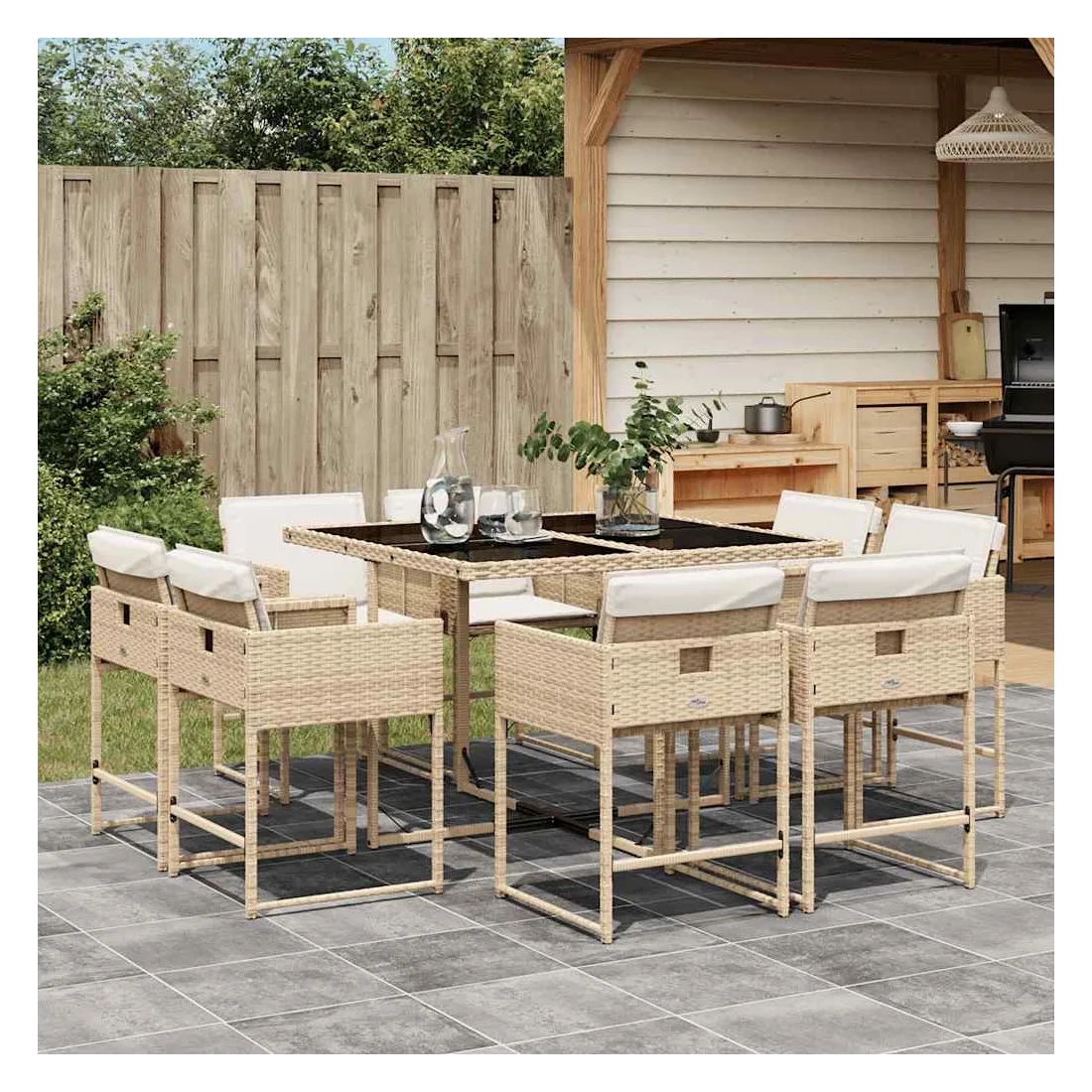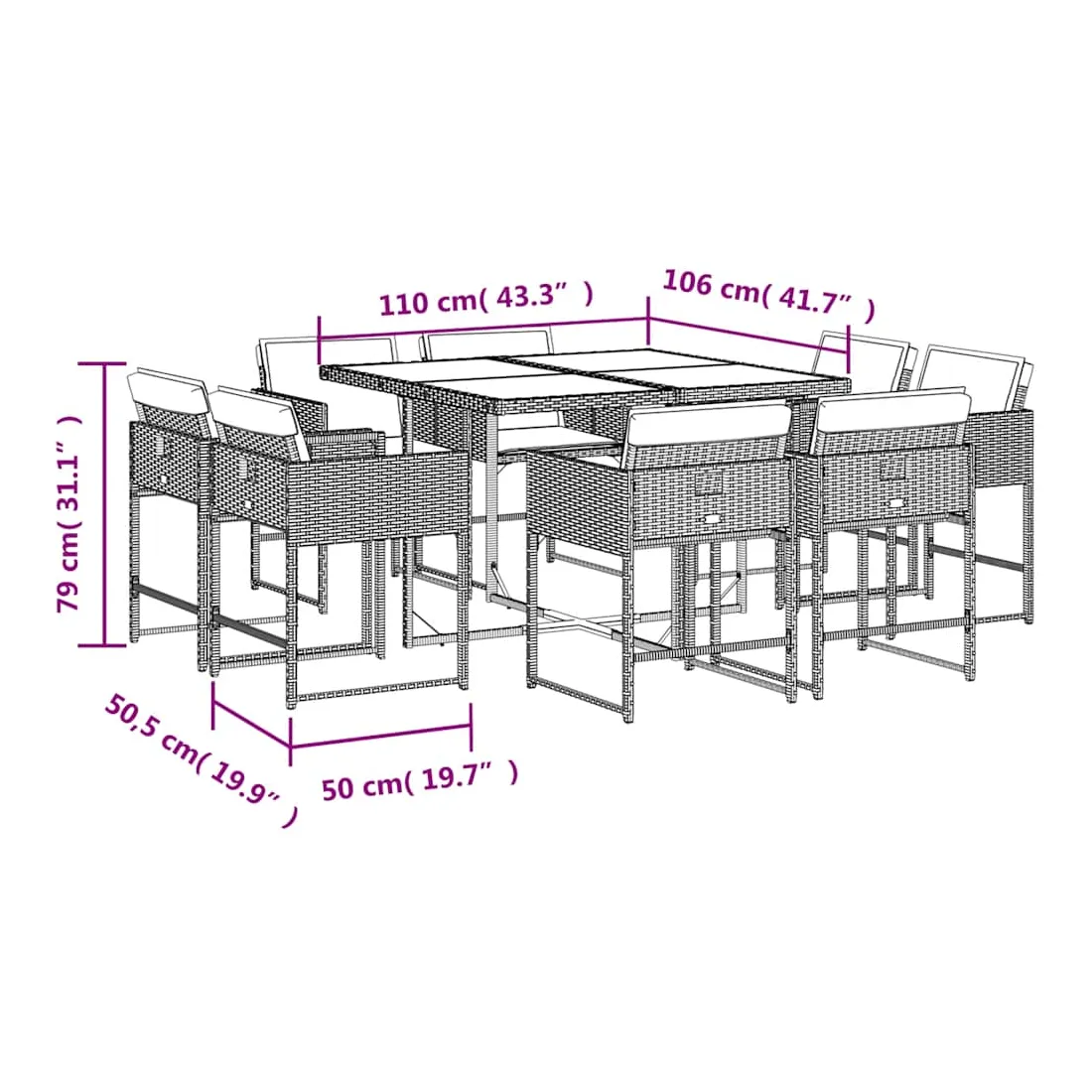 Cet ensemble de salle à manger de jardin est un excellent choix pour les repas en plein air ou pour vous détendre dans le jardin, l'arrière-cour ou le patio. Matériau durable : la résine tressée, également connue sous le nom de poly rotin, est un matériau synthétique solide et nécessitant peu d'entretien qui ressemble au rotin naturel. Il est léger, facile à nettoyer et couramment utilisé pour les meubles d'extérieur en raison de sa durabilité et de ses propriétés de résistance aux intempéries.Rangement compact : ces chaises sont dotées d'un dossier rabattable, ce qui permet de les ranger facilement sous la table. Une fois pliées, elles se rangent parfaitement sous la table, formant un cube peu encombrant.Expérience d'assise confortable : ce mobilier d'extérieur, doté de coussins épais, offre une expérience d'assise confortable.Housse amovible et lavable : ces coussins de siège sont dotés de housses amovibles pour un lavage et un entretien faciles. Les housses de coussin de chaise ont un rabat à l'arrière pour une fixation facile aux chaises.Dessus en verre : le dessus de la table de jardin est fabriqué en verre trempé solide et durable, ce qui le rend facile à nettoyer avec un chiffon humide et ajoute une touche d'élégance à votre espace extérieur. Bon à savoir :Pour que vos meubles d'extérieur restent beaux, nous vous recommandons de les protéger avec une housse imperméable.