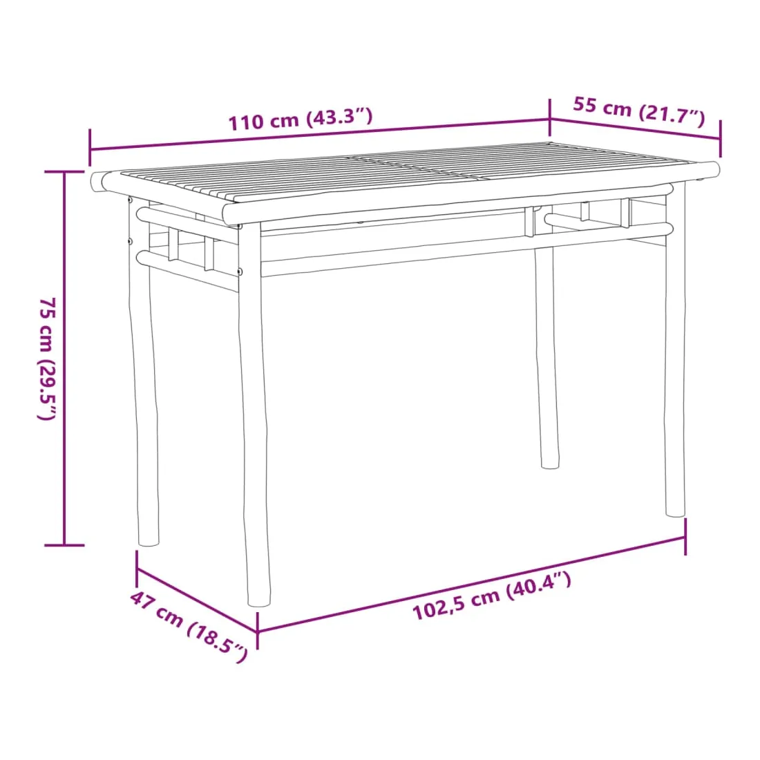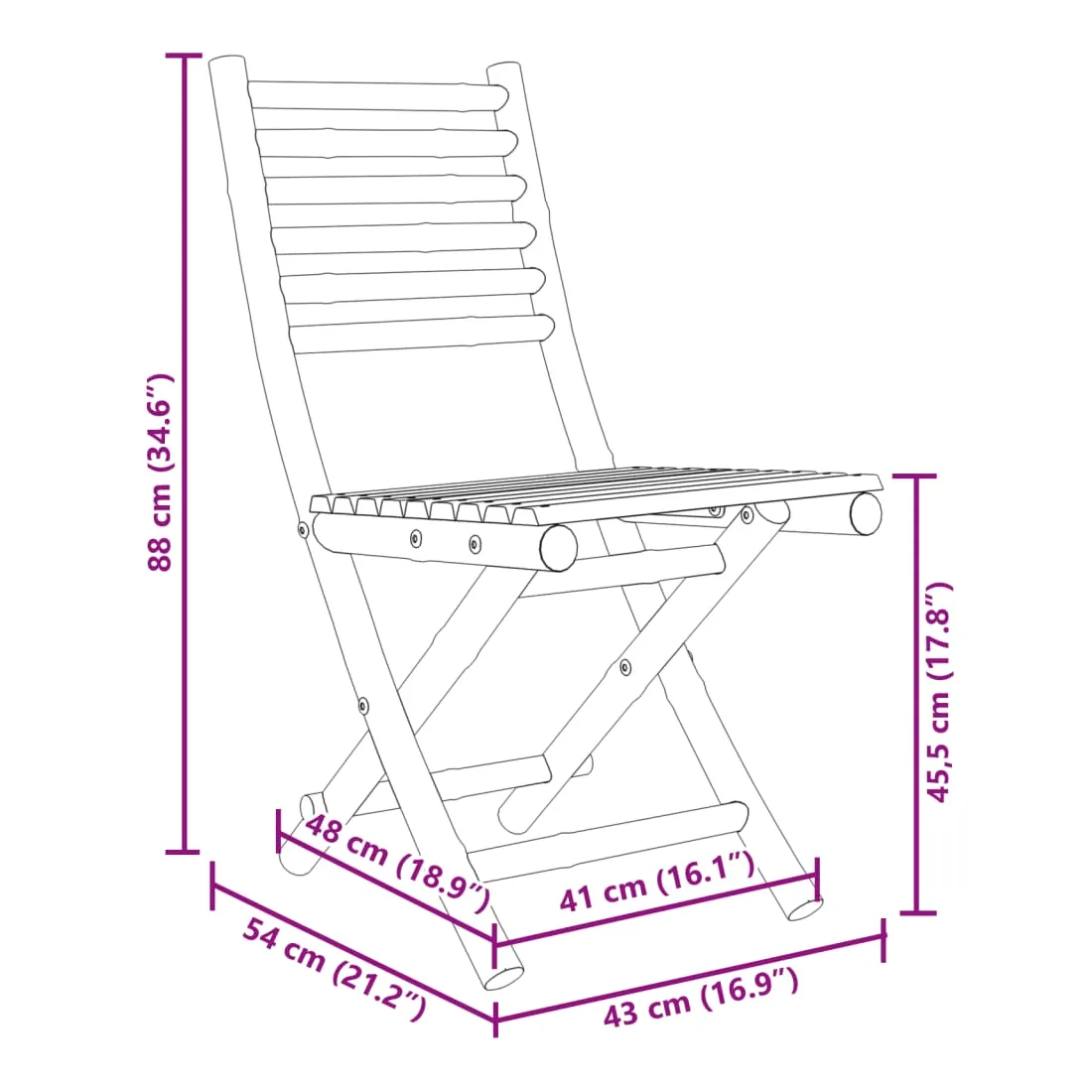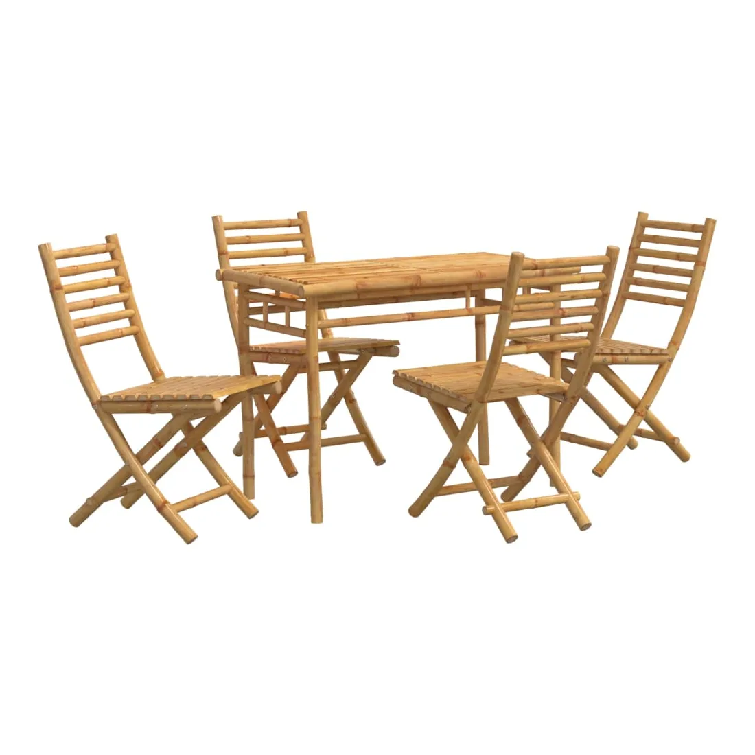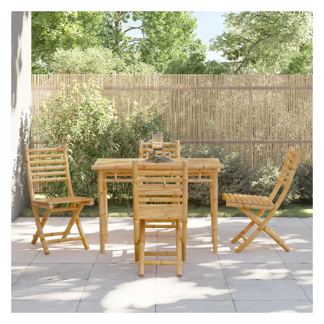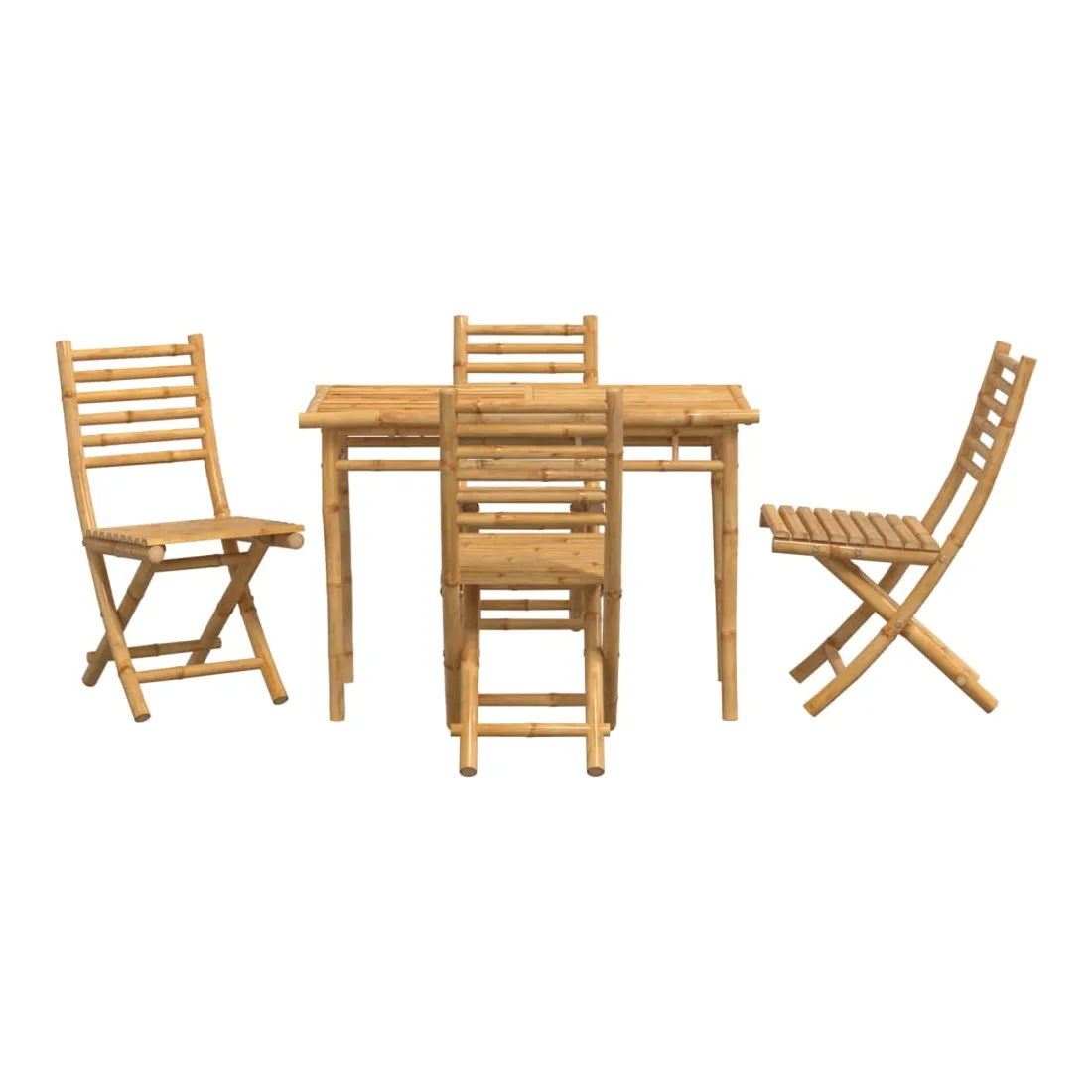 Cet ensemble de salle à manger de jardin, au design élégant et contemporain, sera un excellent choix pour manger ou vous détendre dans le jardin. Durable : en tant que matériau naturel, le bambou offre une bonne respirabilité et une faible odeur. Ces qualités rendent l’ensemble à manger de jardin durable, résistant à l’eau et de longue durée.Design pliable : la chaise à manger peut être facilement pliée lorsqu'elle n'est pas utilisée, pour un rangement et un transport faciles.Dessus stable : le dessus stable de la table de jardin est idéal pour placer votre boisson ou toute autre nécessité dont vous avez besoin à portée de main.Une expérience d'assise confortable : dotée d'un dossier, la chaise d'extérieur vous offre un confort optimal. Bon à savoir :Pour que vos meubles d'extérieur restent beaux, nous vous recommandons de les protéger avec une housse imperméable.