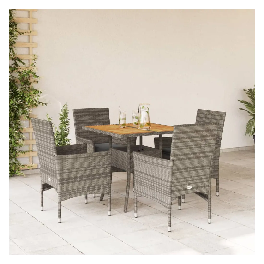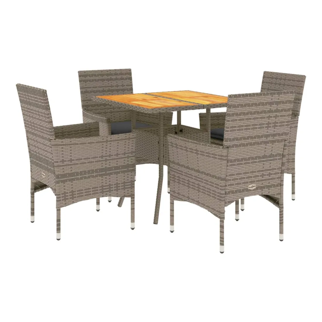 Cet ensemble de salle à manger de jardin est un excellent choix pour les repas en plein air ou pour vous détendre dans le jardin, dans l'arrière-cour ou sur la terrasse. Matériau durable : la résine tressée, également connue sous le nom de poly rotin, est un matériau synthétique solide et nécessitant peu d'entretien qui ressemble au rotin naturel. Il est léger, facile à nettoyer et couramment utilisé pour les meubles d'extérieur en raison de sa durabilité et de ses propriétés de résistance aux intempéries.Expérience d'assise confortable : cet ensemble de meubles d'extérieur, doté de coussins épais, offre une expérience d'assise confortable.Housse amovible et lavable : ces coussins de siège sont dotés de housses amovibles pour un lavage et un entretien faciles.Dessus stable et facile à nettoyer : cette table de jardin a un dessus en bois d'acacia robuste, durable et facile à nettoyer avec un chiffon humide. Bon à savoir :Pour que vos meubles d'extérieur restent beaux, nous vous recommandons de les protéger avec une housse imperméable.