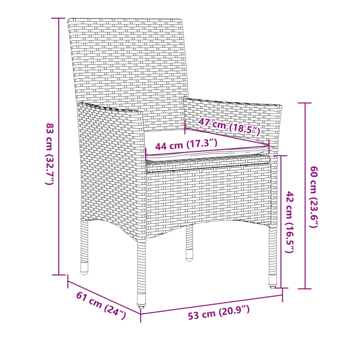 - Hauteur du siège à partir du sol (sans coussin) : 42 cm
