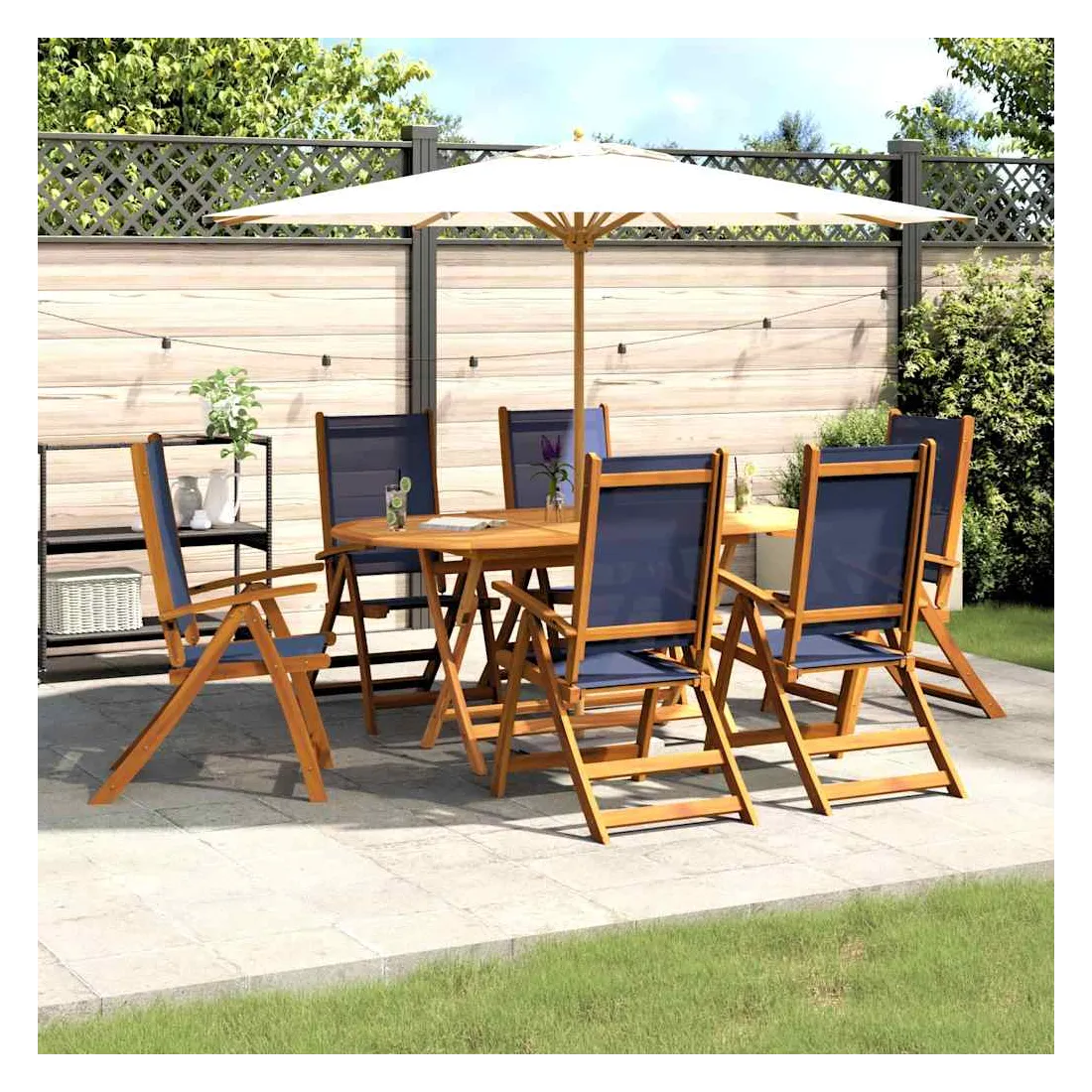 Profitez d'un bon repas en plein air avec votre famille et vos amis avec cet ensemble de salle à manger de jardin en bois ! Bois d'acacia massif : l'ensemble à manger d’extérieur est fabriqué en bois d'acacia massif. Le bois d'acacia massif est un beau matériau naturel. Le bois d'acacia est un bois dur tropical, dense, robuste et durable. Fonction réglable et pliable : la chaise de jardin peut être réglée en 5 positions, afin que vous puissiez toujours trouver la position d'assise la plus confortable. Elle peut également être repliée pour économiser de l'espace lorsqu'elle n'est pas utilisée. Design pratique : le dessus de table est doté d'un trou pour parasol, ce qui vous permet de fixer facilement un parasol pour créer un coin ombragé. Dessus de table robuste : cette table à manger de jardin vous offre un dessus de table solide. Vous pouvez placer vos collations, boissons et n'importe laquelle de vos décorations préférées. Surface facile à nettoyer : la surface à finition à l'huile rend cette table et ces chaises de jardin faciles à nettoyer avec un chiffon humide. Bon à savoir :Pour que vos meubles d'extérieur restent beaux, nous vous recommandons de les protéger avec une housse imperméable.